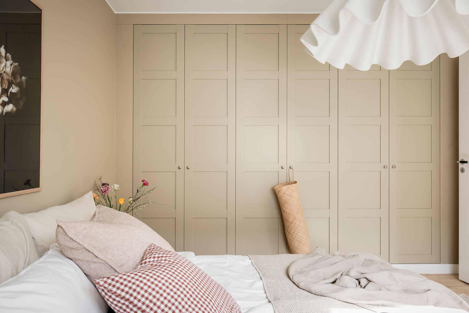 Det stora sovrummet är något alldeles extra. Pardörrar öppnar upp rummet och ger en fin rymd, samtidigt som de skapar möjlighet att stänga om sig när lugnet behövs. Längs ena väggen löper en hel garderobsvägg som erbjuder generös förvaring. Här finns gott om plats för en större säng och sängbord, utan att avkall görs på känslan av rymd. Lägenheten ligger högt mot gatan, och utanför fönstret ligger även föreningens stora förträdgård, så man behöver inte oroa sig för insyn.