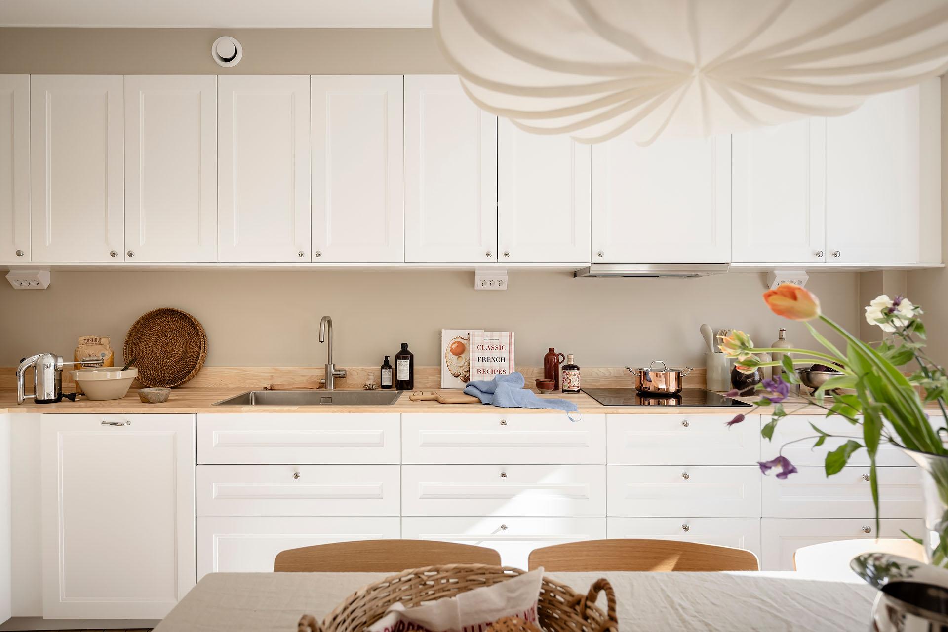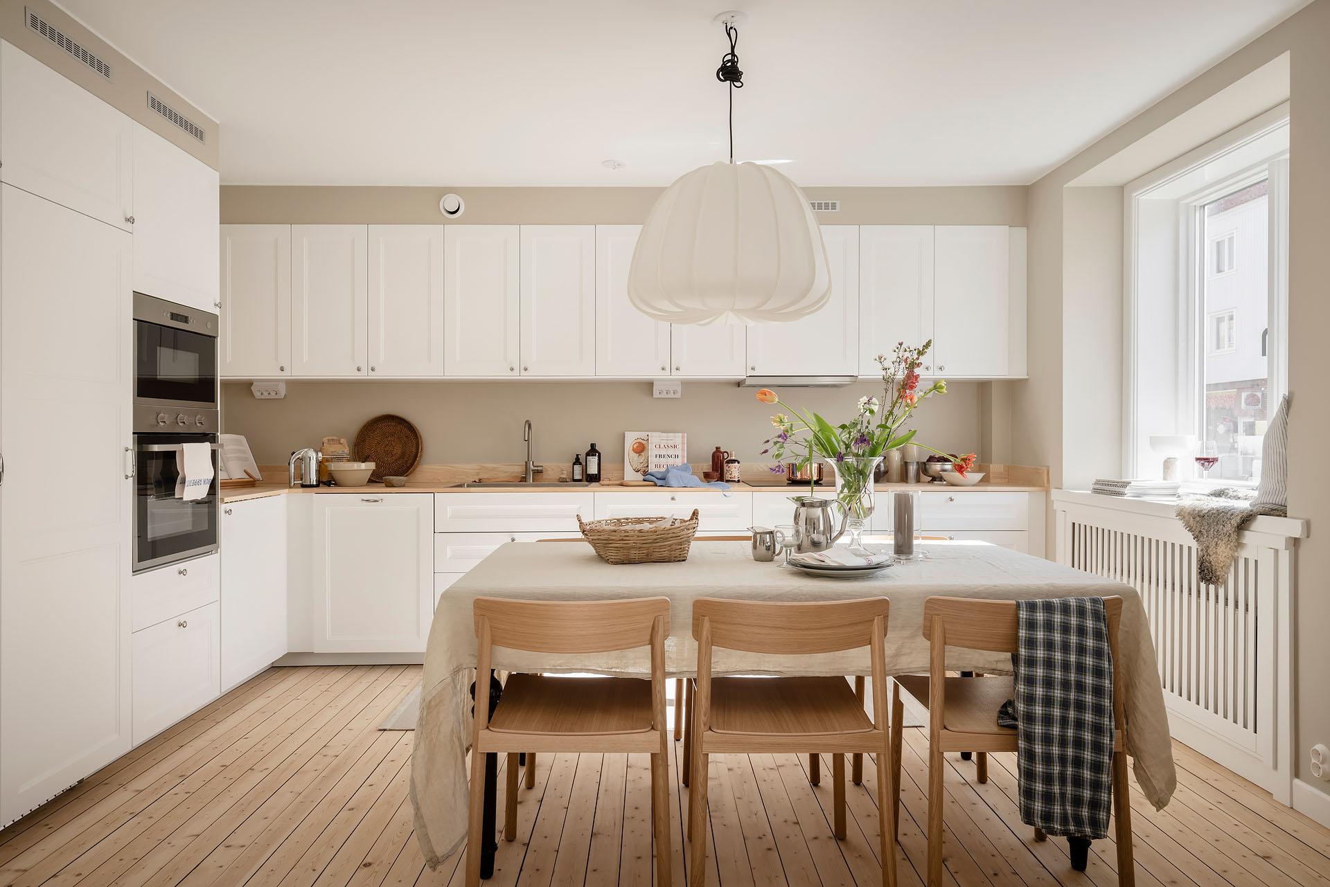 Bostadens hjärta, där ljuset från de tre söderfönstren får spela huvudrollen. Köket är utformat i klassisk stil med speglade luckor och bänkskiva i ask, och erbjuder både goda arbetsytor och en naturlig plats för ett stort matbord. Här finns fullstor kyl och frys, induktionshäll, ugn och diskmaskin, och fläkt som är kopplad till lägenhetens frånluftsventilation. Allt som går är integrerat för ett enhetligt och stilrent uttryck.