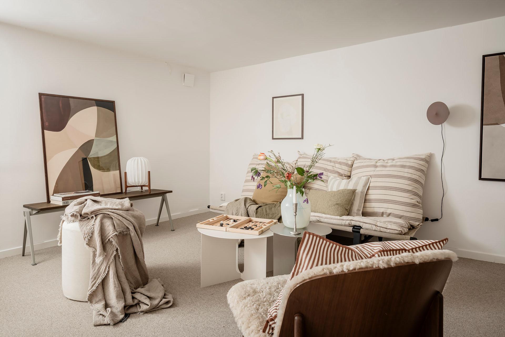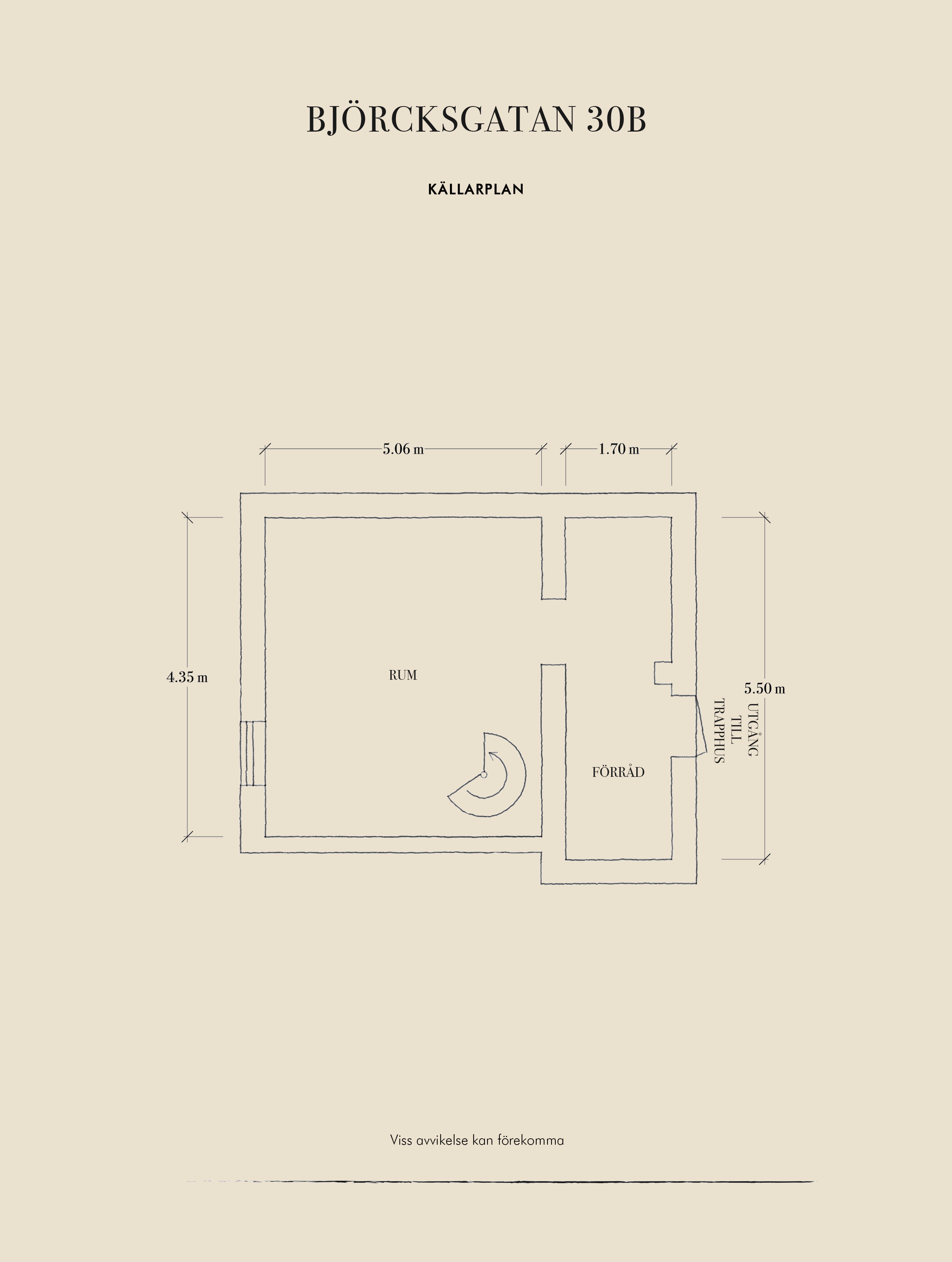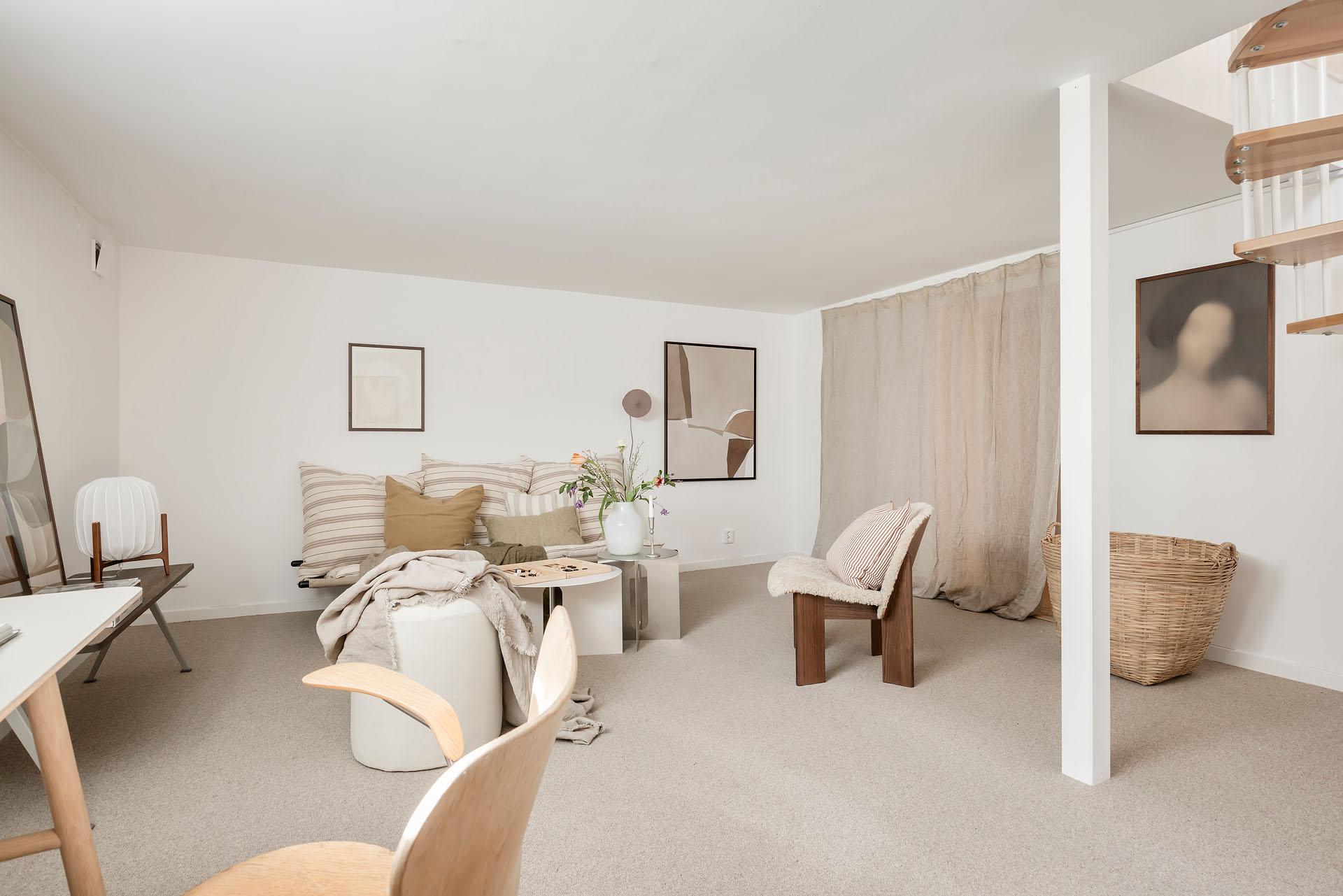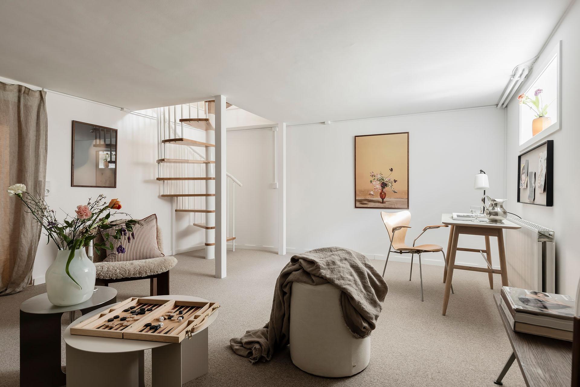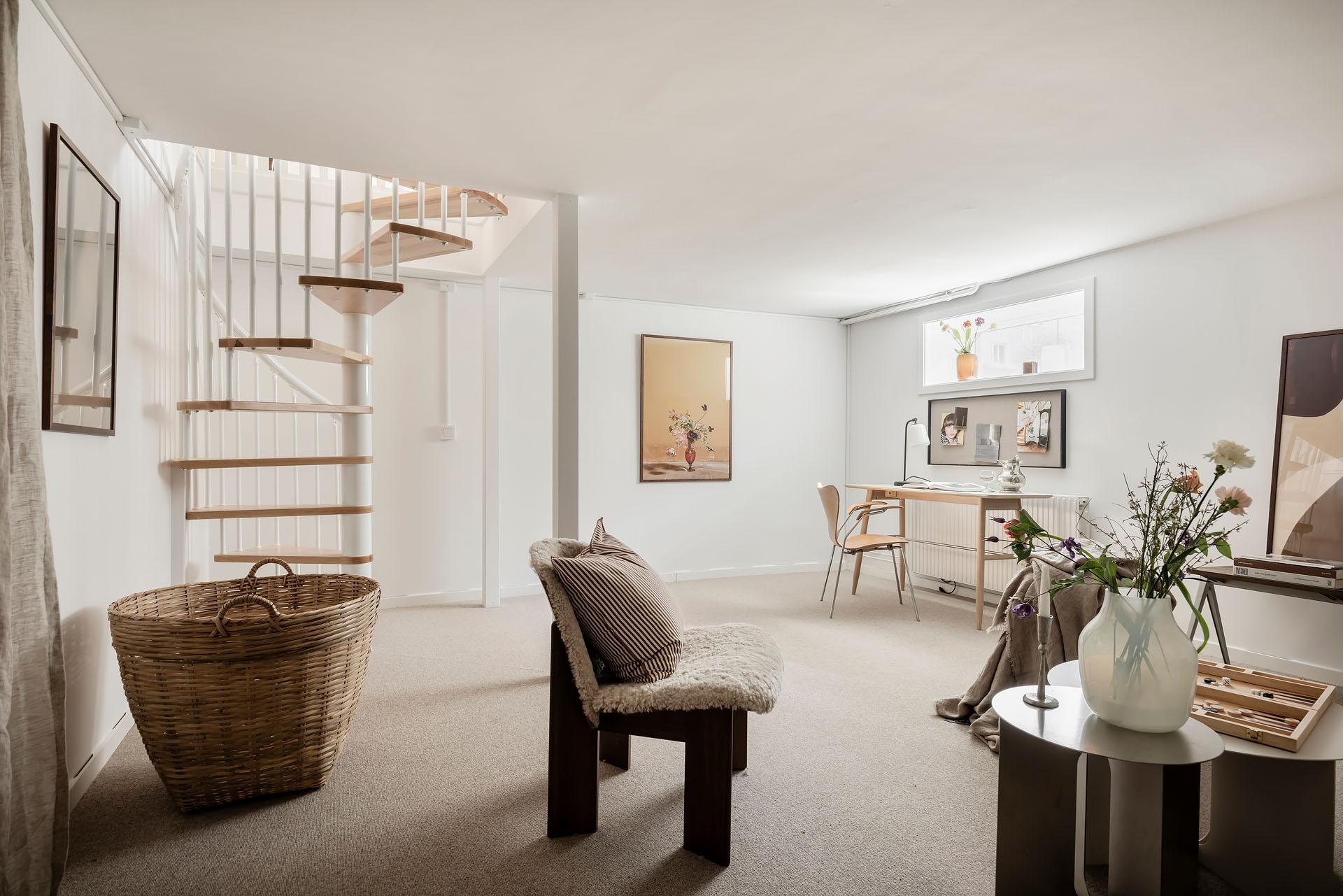 En trappa ner finns en utmärkt yta som blir en stor tillgång till bostaden. Tack vare fönster i söder är ljusinsläppet rimligt, och tas väl emot av vita väggar. På golvet ligger en heltäckningsmatta, som skapar en ombonad och mysig miljö. Rummets storlek gör att den med lätthet rymmer flera funktioner - gästrum, ett extra allrum, eller kontor. Källaren nås både via trappa från övre plan, och via egen entré som leder ut till källaren och trapphuset, vilket öppnar upp för möjlighet till uthyrning av olika slag. Invid källaringången finns en yta som är avskild från övriga källarrummet, och som är avsett att vara lägenhetens förråd (ytterligare externt förråd finns ej). Här är avloppsstam tillgänglig, vilket kan vara bra att veta för den som önskar tex ett ytterligare badrum.