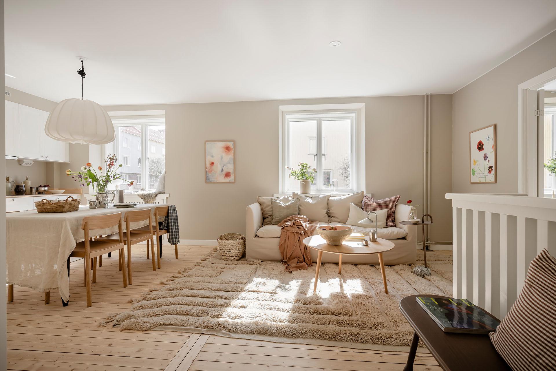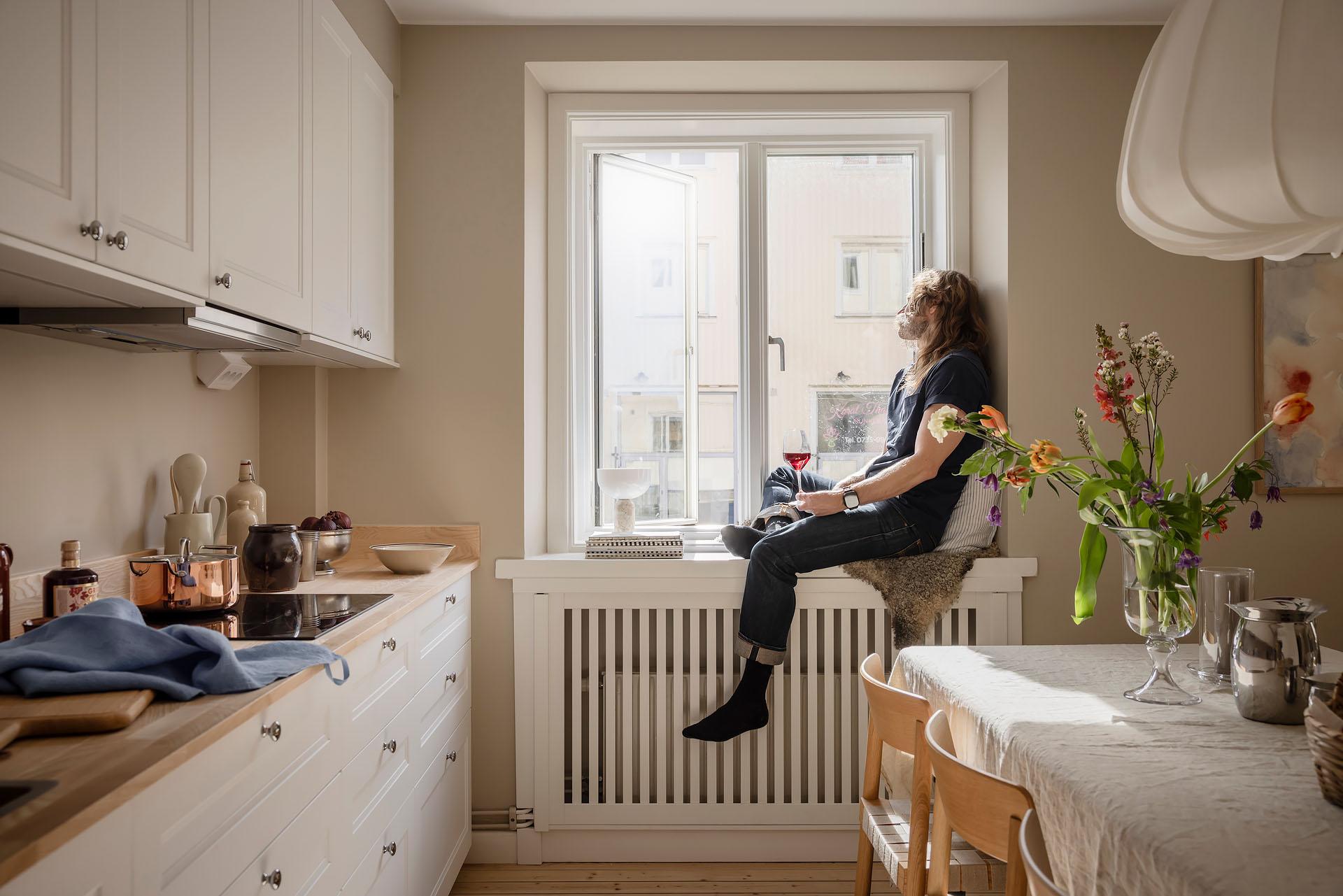 Planlösningen är öppen men samtidigt tydlig disponerad, och vardagsrummet får en egen, självklar del. Väggen ovanför trappan blir en bra placering för tv, till exempel "Frame" eller likande modell som extraknäcker som tavla när den inte används. Tack vare att vi är på första våningen, i landshövdingehusets murade del, är väggarna maffigt tjocka och fönsternischerna så djupa att man gärna hoppar upp och njuter av en god bok och en kaffe i solskenet.