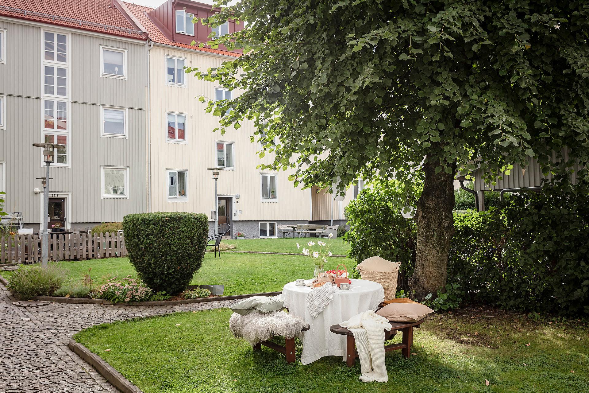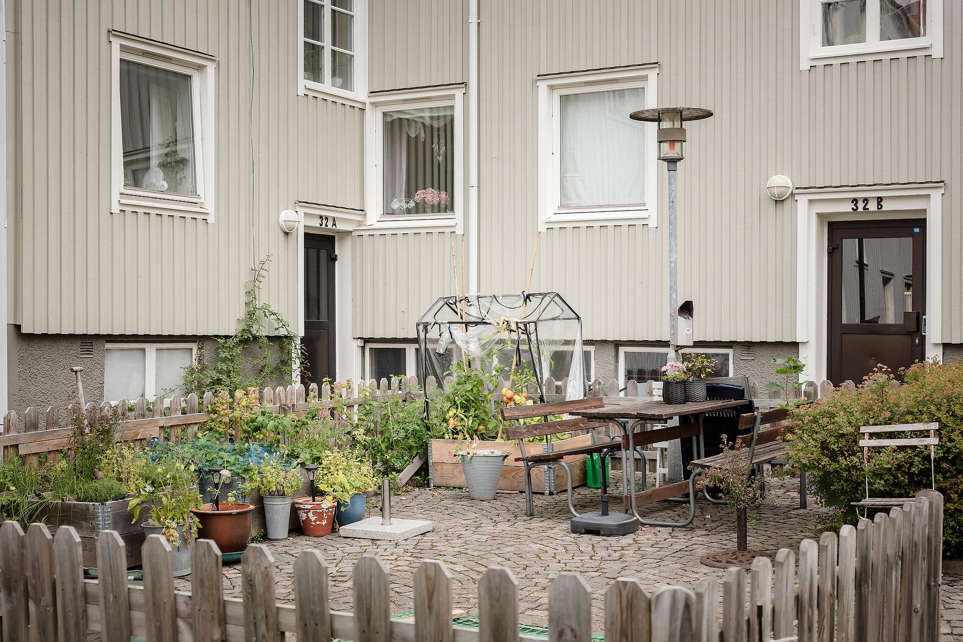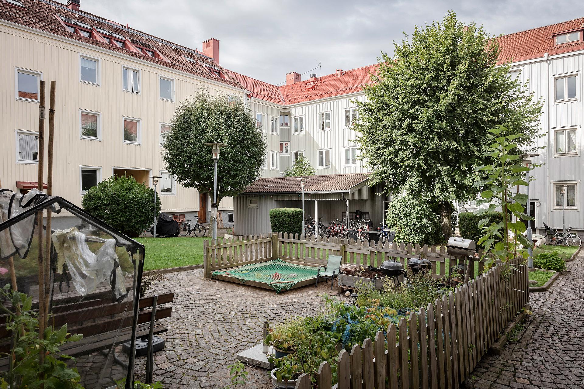 - Balkong/Uteplats: Ja. Gemensam förträdgård som badar i sol från morgon till kväll. Lummig innergård med gräsytor, odling, och sittplatser.