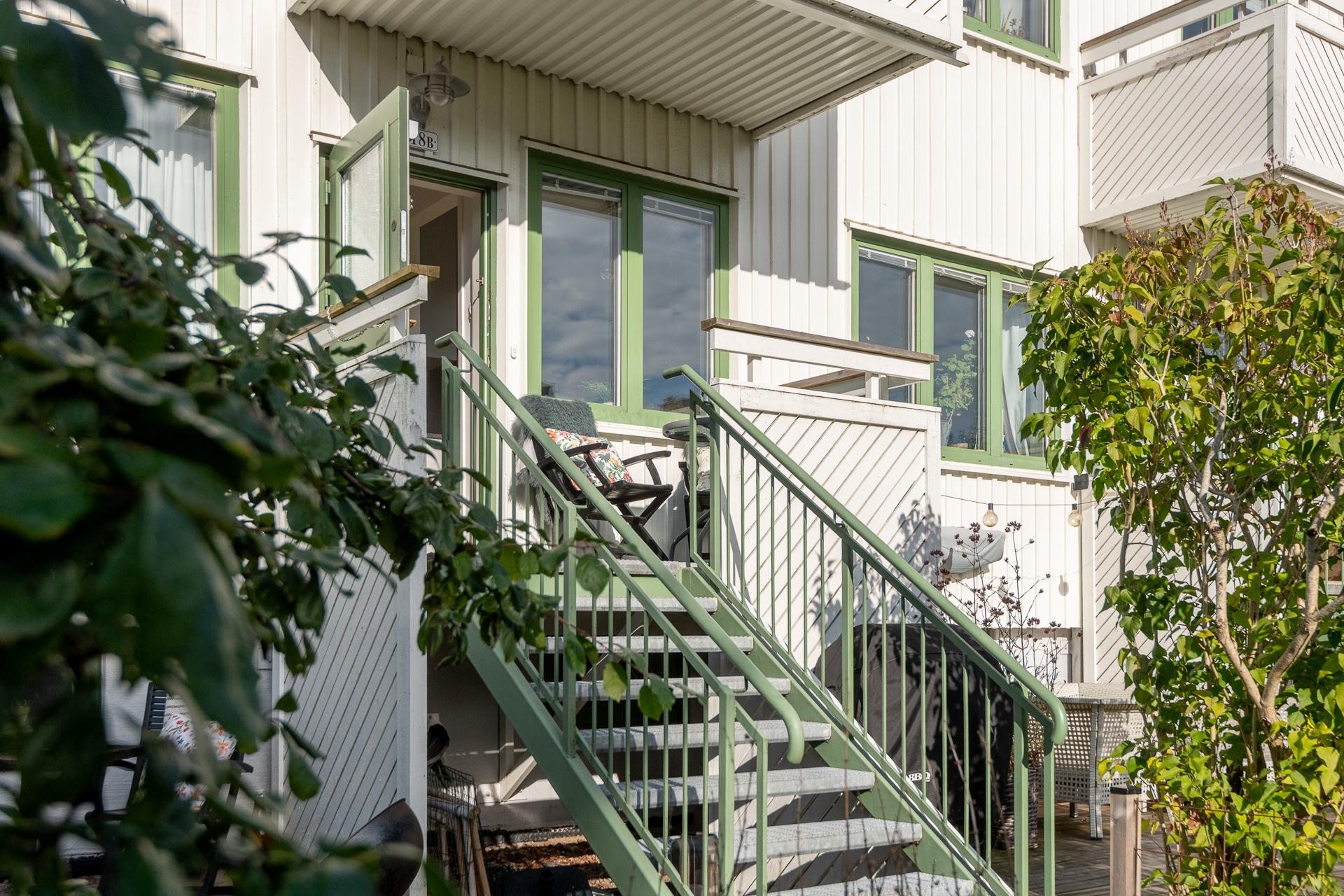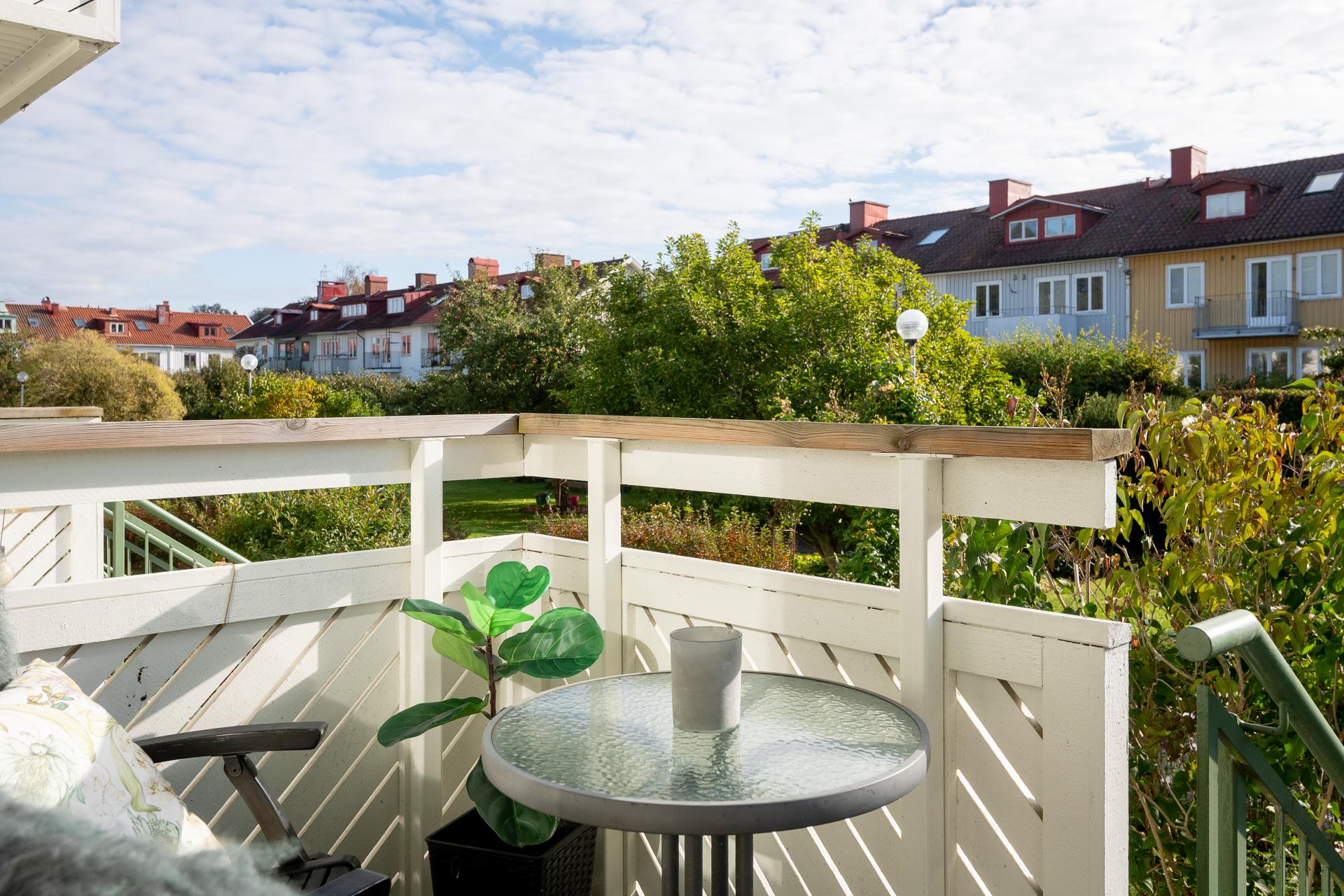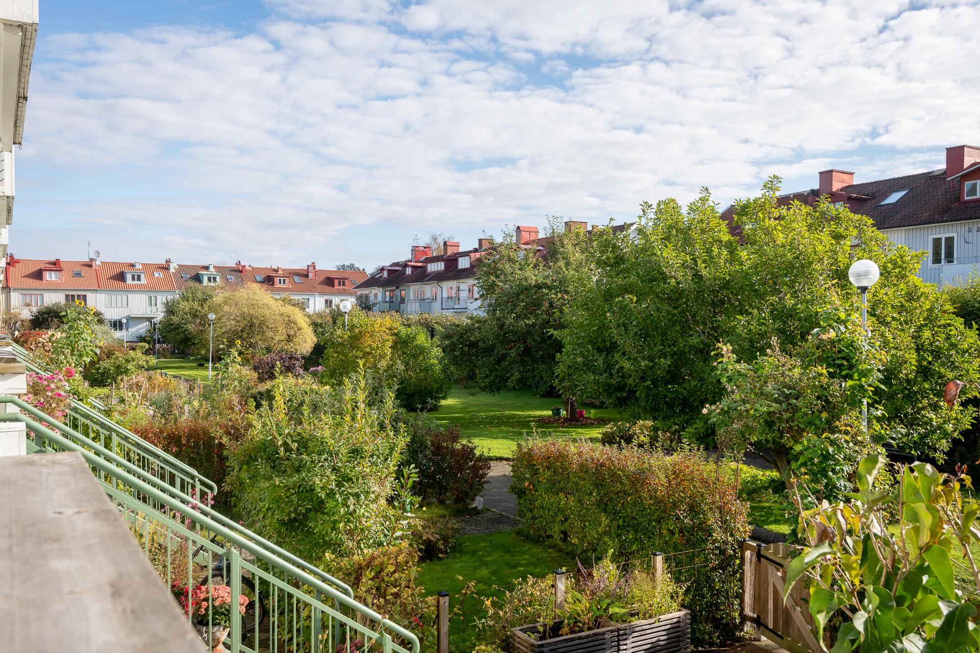 Lägenheten vetter med lugnt grönskande läge in mot föreningens gemensamma trädgård. Välkommen in i trädgården och lägenhetens uteplats. Här skiner solen från morgon till eftermiddag. Tag ett tiotal trappsteg upp och landa en stund på balkongen utanför köket.