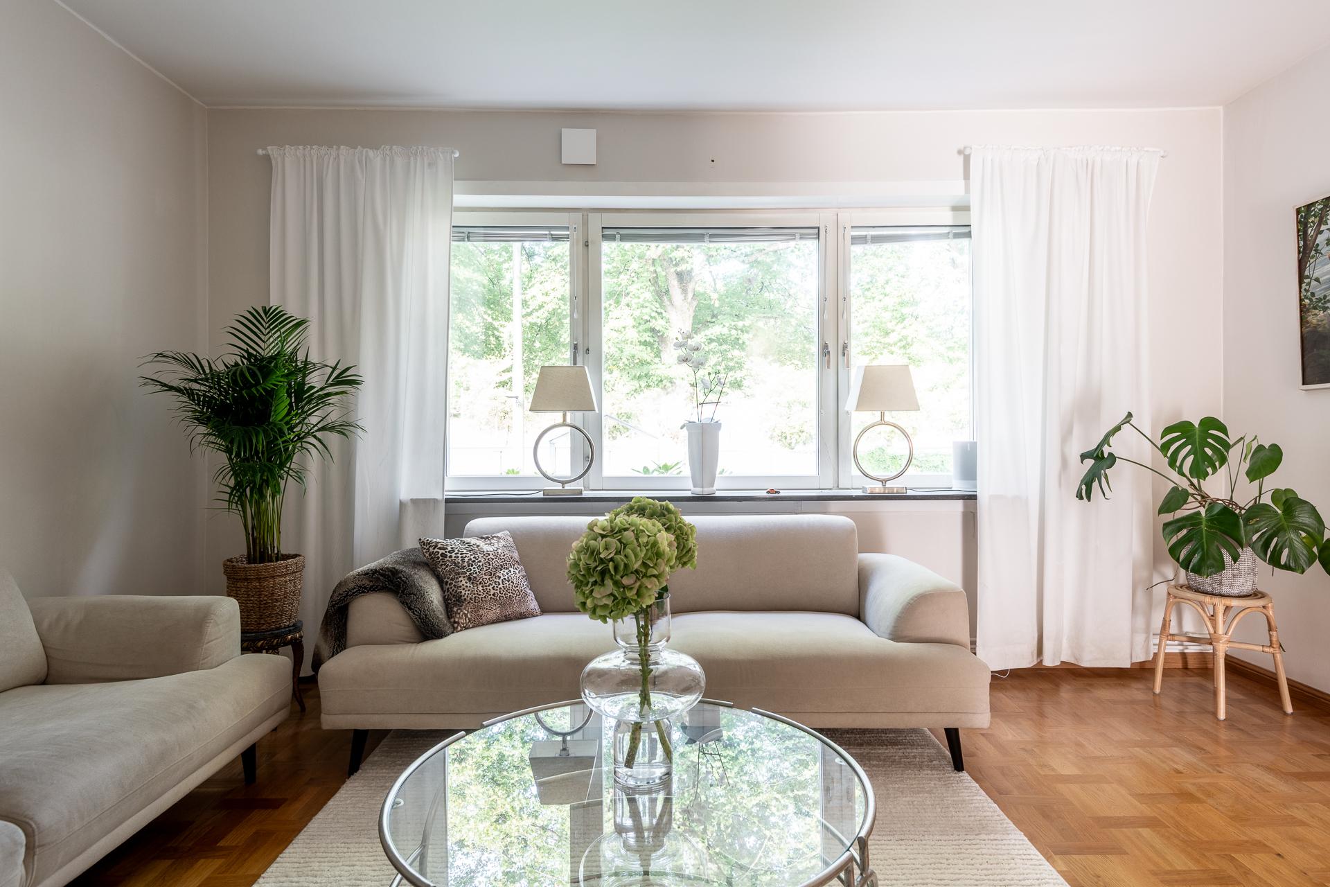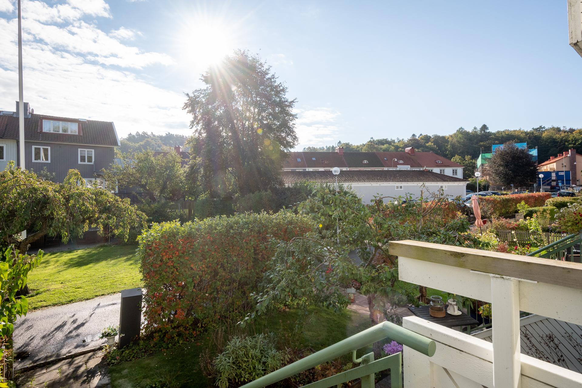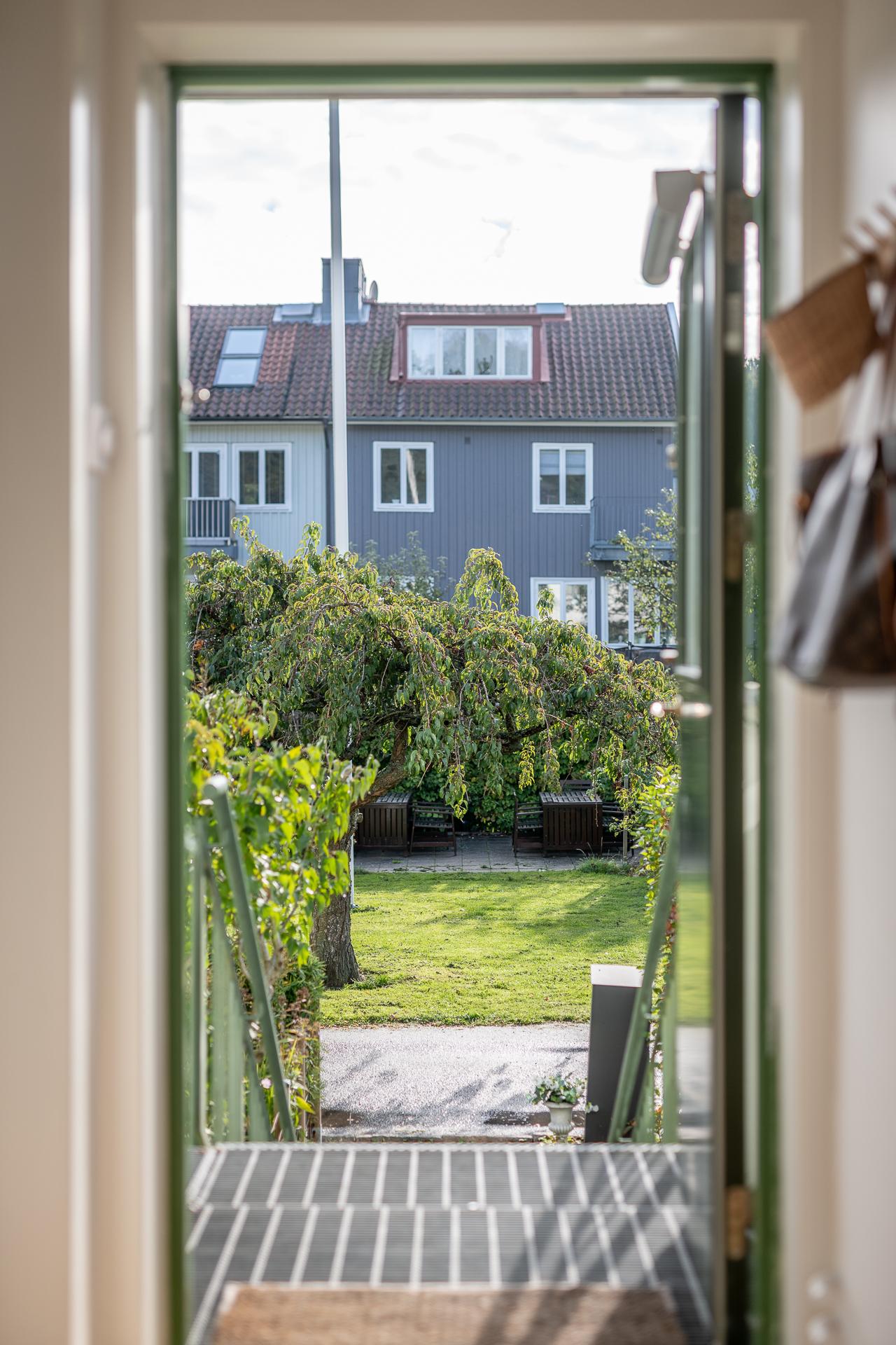 Lägenheten vetter med lugnt grönskande läge in mot föreningens gemensamma trädgård. Välkommen in i trädgården och lägenhetens uteplats. Här skiner solen från morgon till eftermiddag. Tag ett tiotal trappsteg upp och landa en stund på balkongen utanför köket.