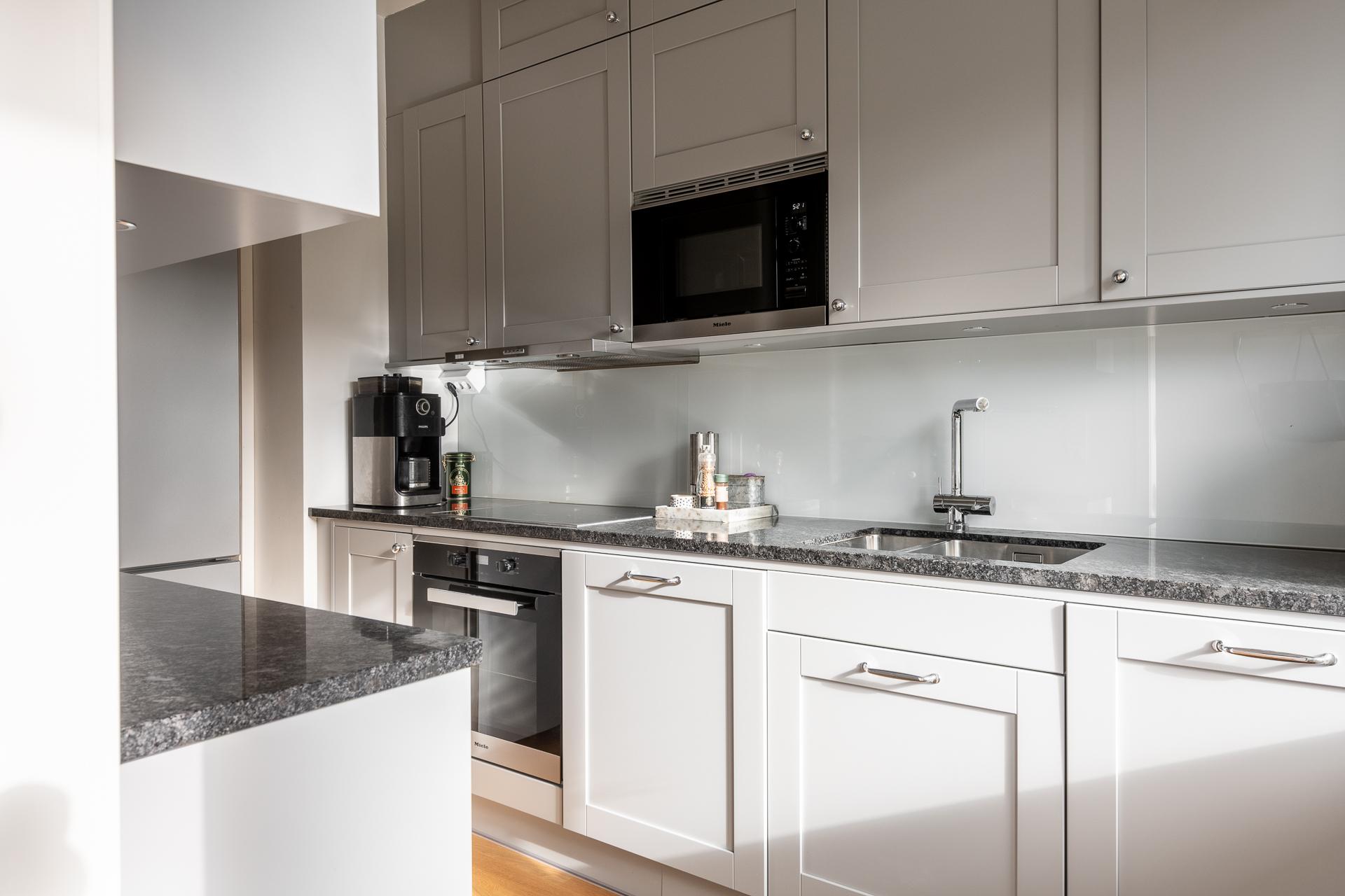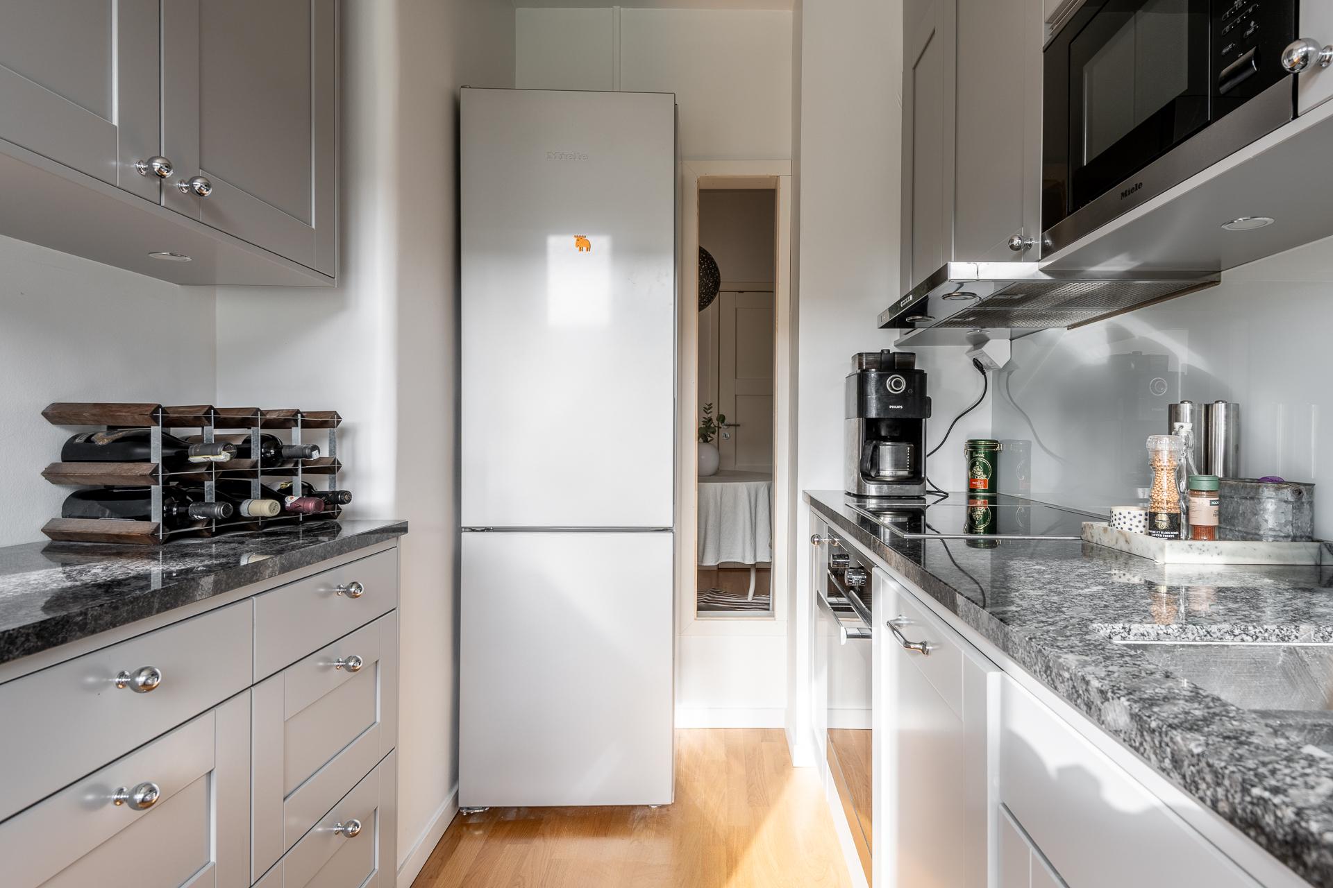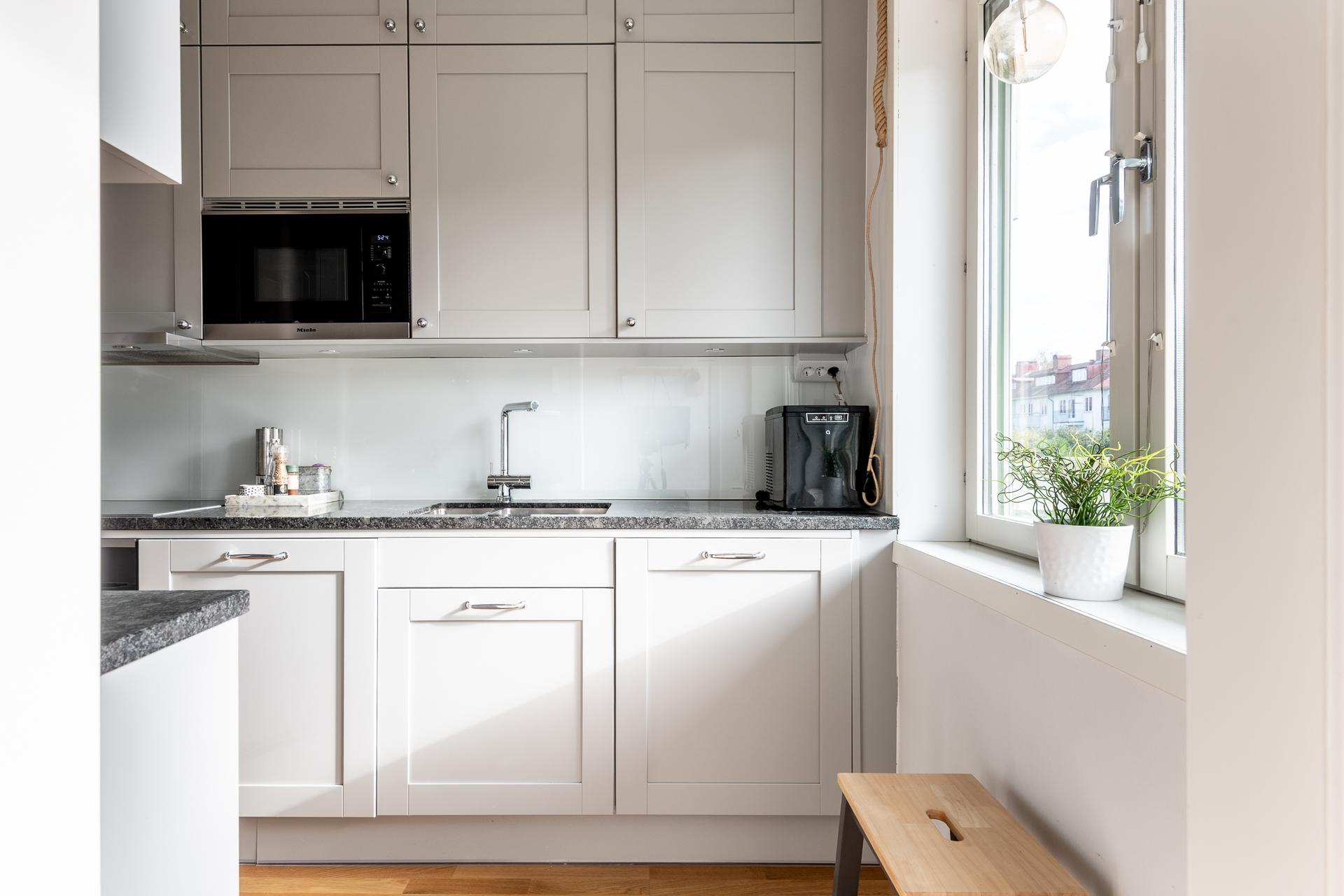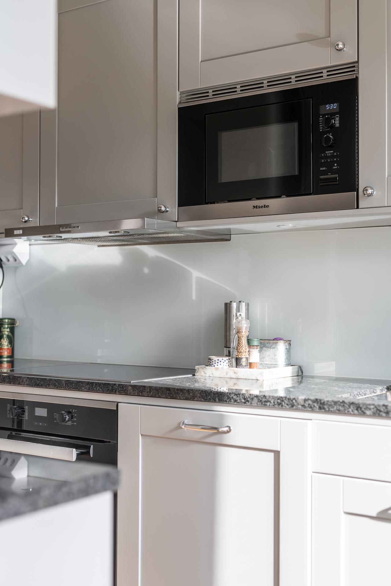 Ett riktigt hemtrevligt och påkostat kök från Vedum med spegeldörrar i klassisk grått. En påkostad och gedigen stenskiva i granit. Utanför köket är balkongen och på den skiner solen från morgon till lunch.