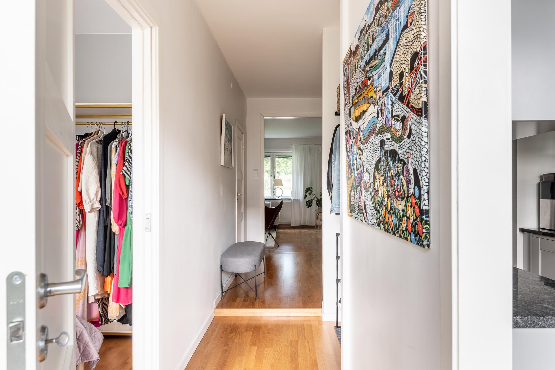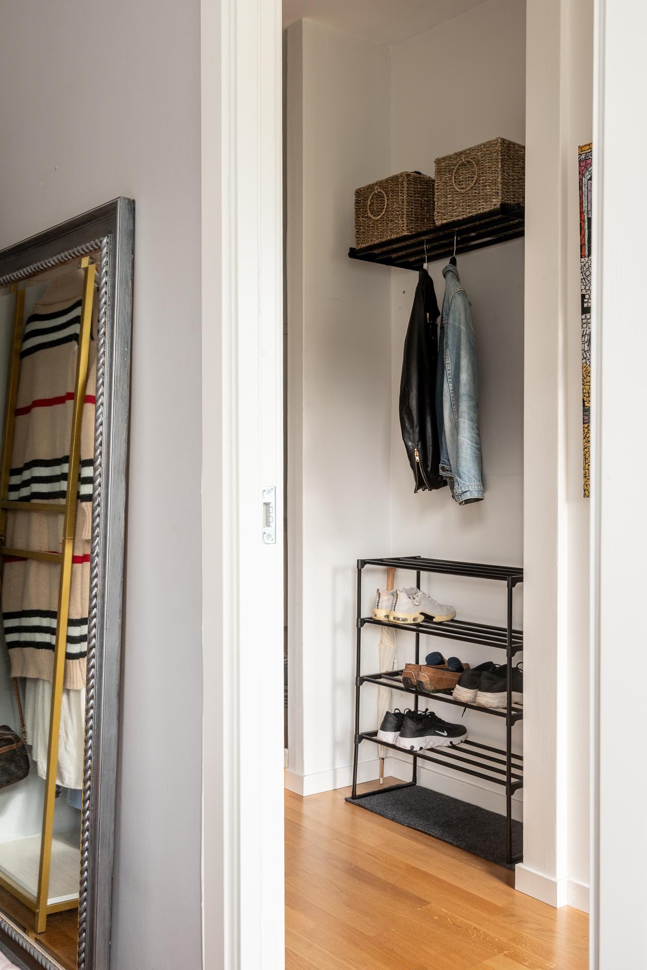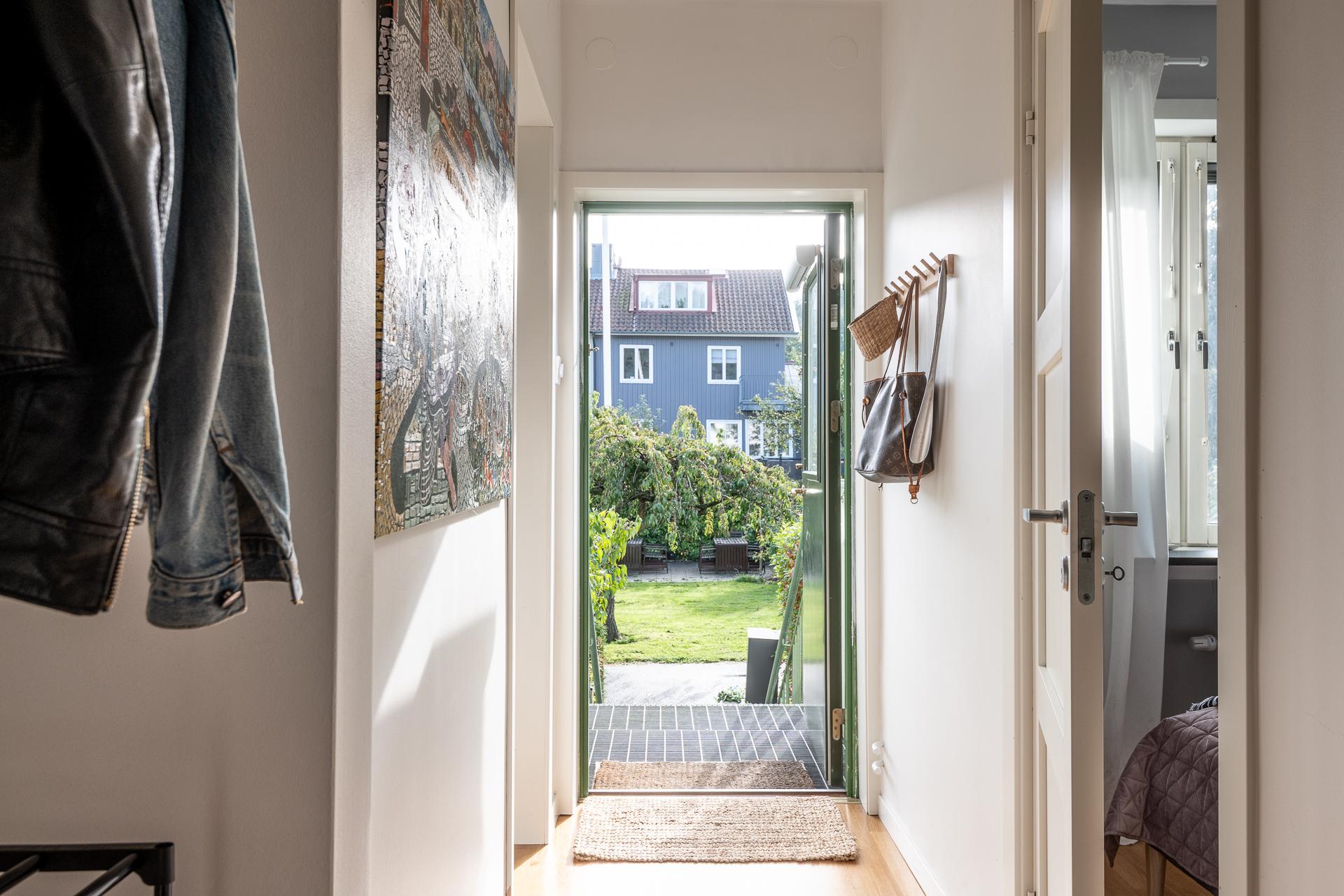 Lägenheten har en egen entré. Här kommer man in i en hall med plats för ytterkläder och skor. Hemmets ytterdörr har ett fönster som släpper in ljus i hallen och köket. Innanför dörren finns avhängningsplats och man kan bygga smarta välplacerade hyllor och krokar för att maximera förvaringen.