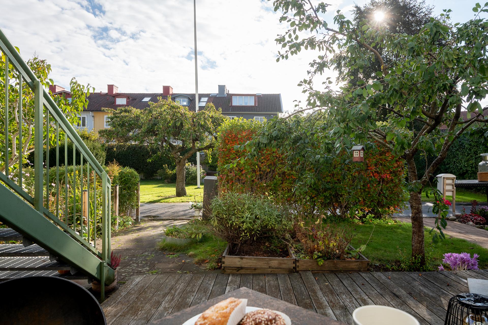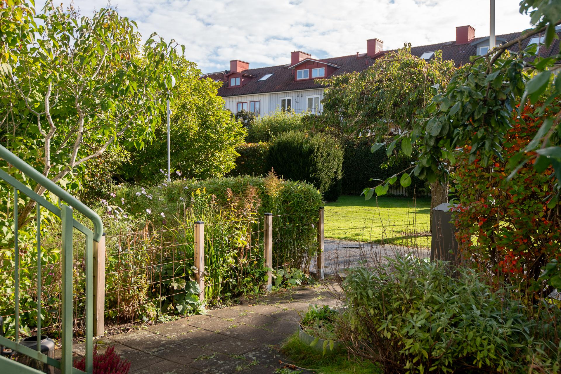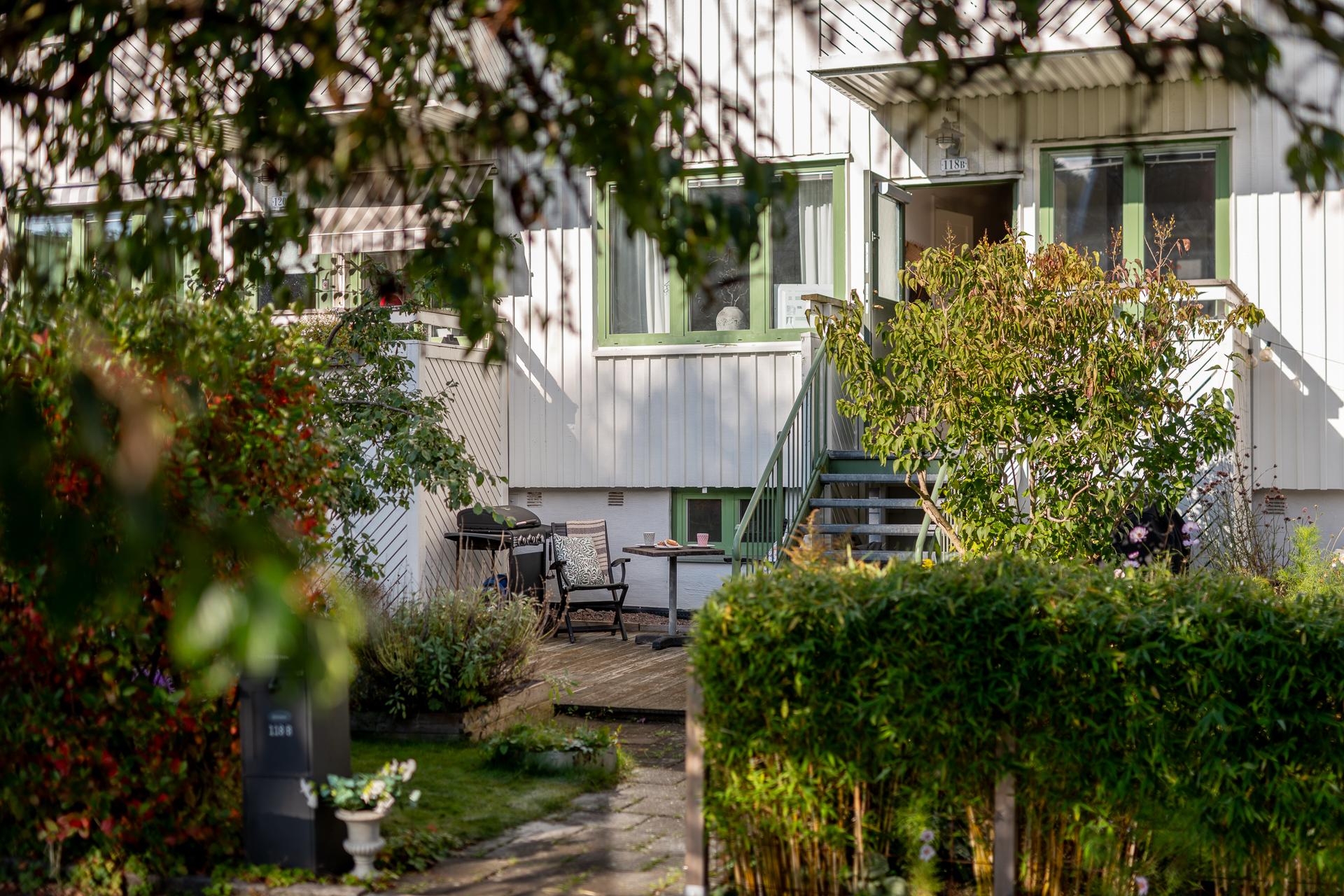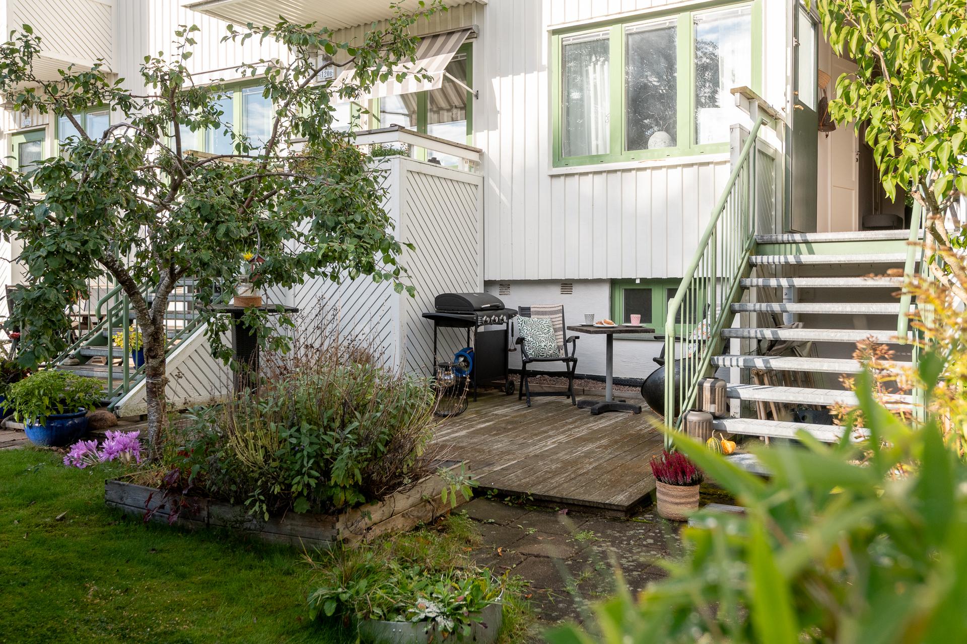 Föreningen äger marken och uteplatserna som är i anslutning till lägenheterna. I samråd med styrelsen och sina grannar bekostar man själv planteringar, inredning och trädäck och står själv för underhåll och återställning av dessa om föreningen exempelvis skulle behöva tillgång till husgrunden.
