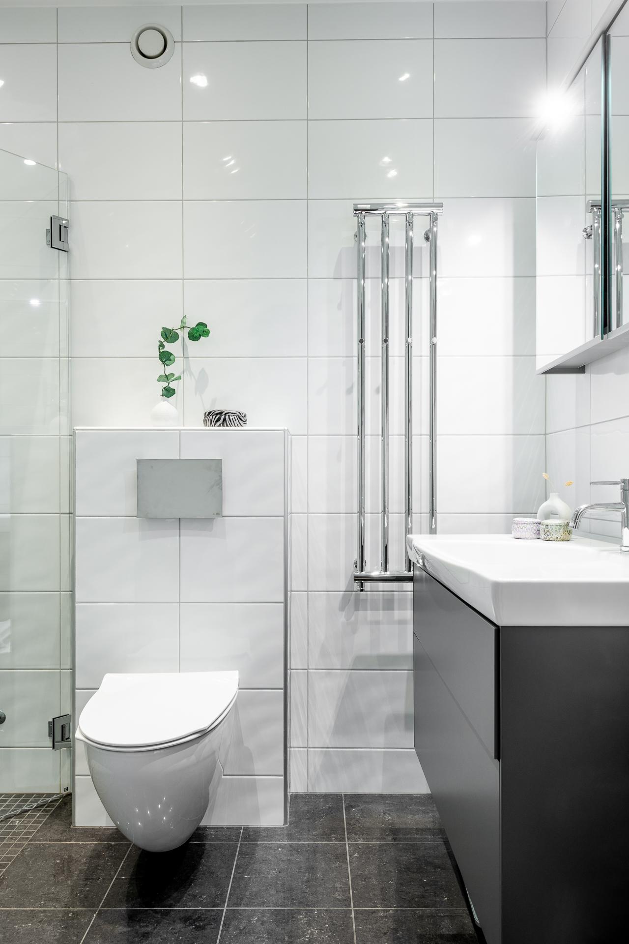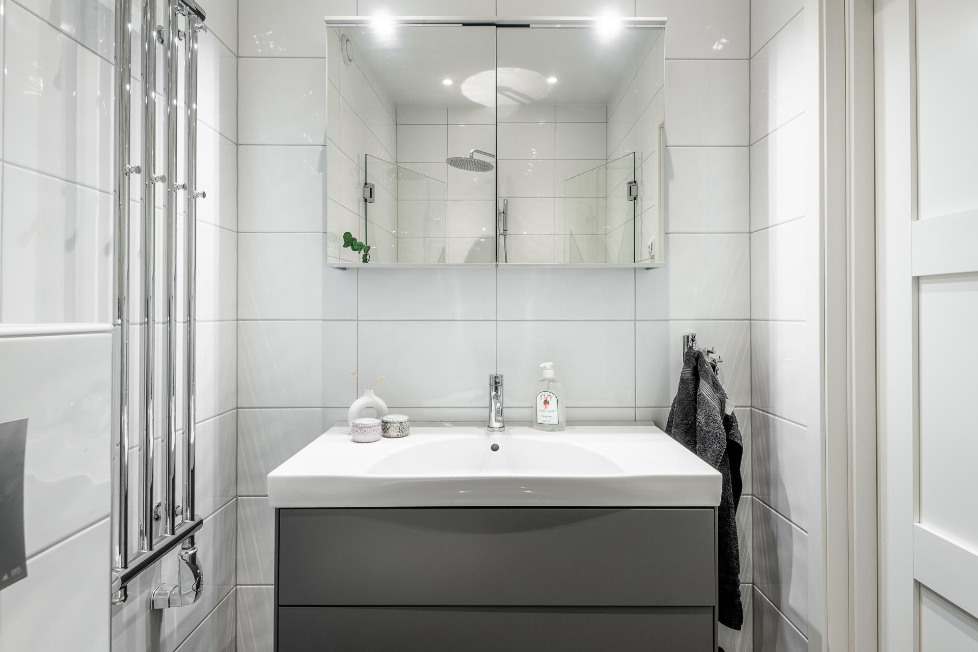 Badrummet är tidlöst helkaklat med inredning som handfat, lampa, spegel och duschhörna och WC.