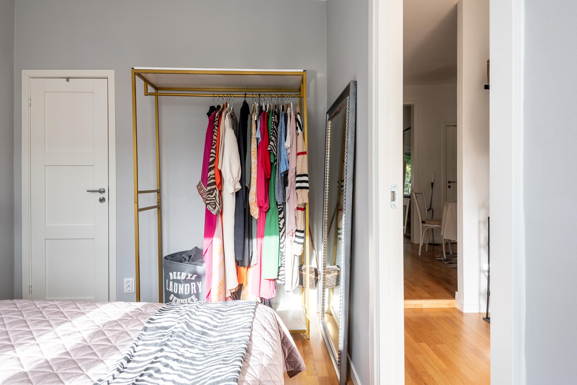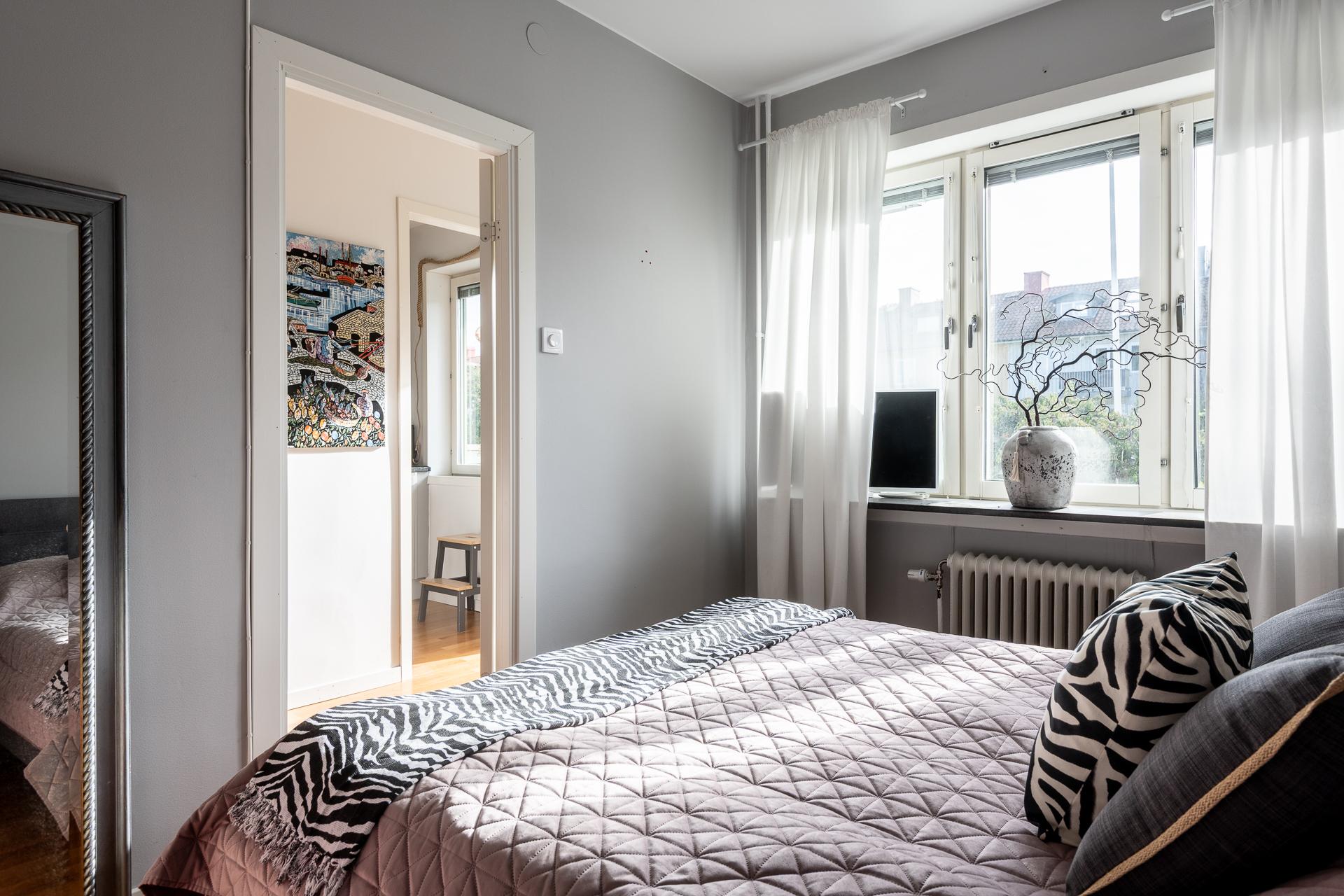 Sovrummet vetter in mot Änggårdens tystnad och blickar ut över föreningens gemensamma trädgård och lägenhetens uteplats. Sovrummet har spanläge ner över Änggårdens färgglada radhus. Bra och lugnt läge helt enkelt. Här ryms en dubbelsäng, garderober och har dessutom en stor inbyggd garderob.