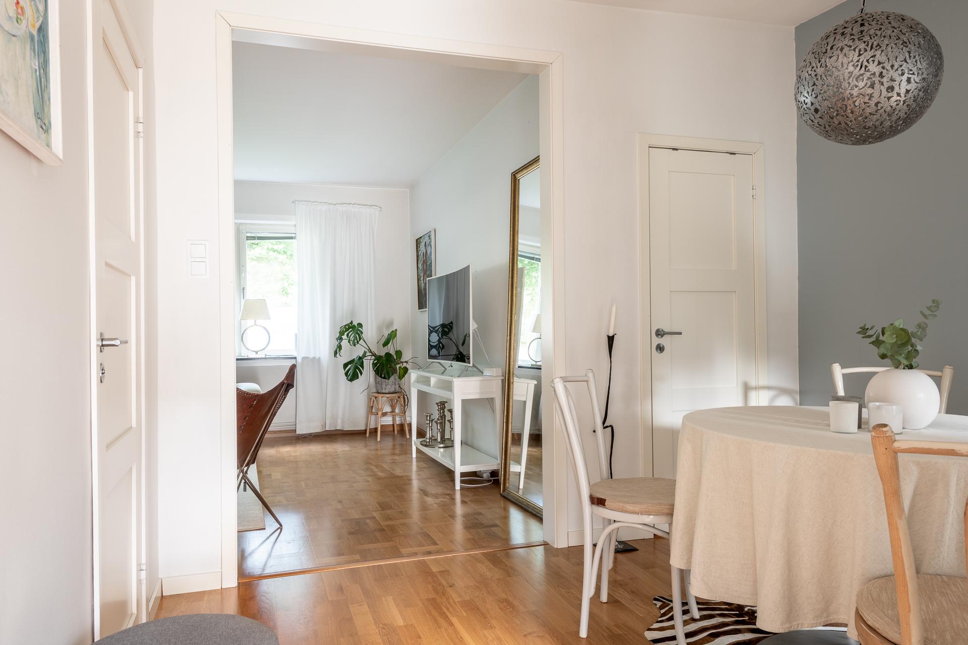 En naturlig matplats finns i anslutning till köket och som tar oss vidare till vardagsrummet. Vardagsrummet är stort och rymligt och både förvaring, matsalsbord och soffgrupp har sina naturliga platser här. På tal om förvaring så finns ett större förråd i anslutning till matplatsen. Vardagsrummet ligger med utsikt över grannens uteplats.