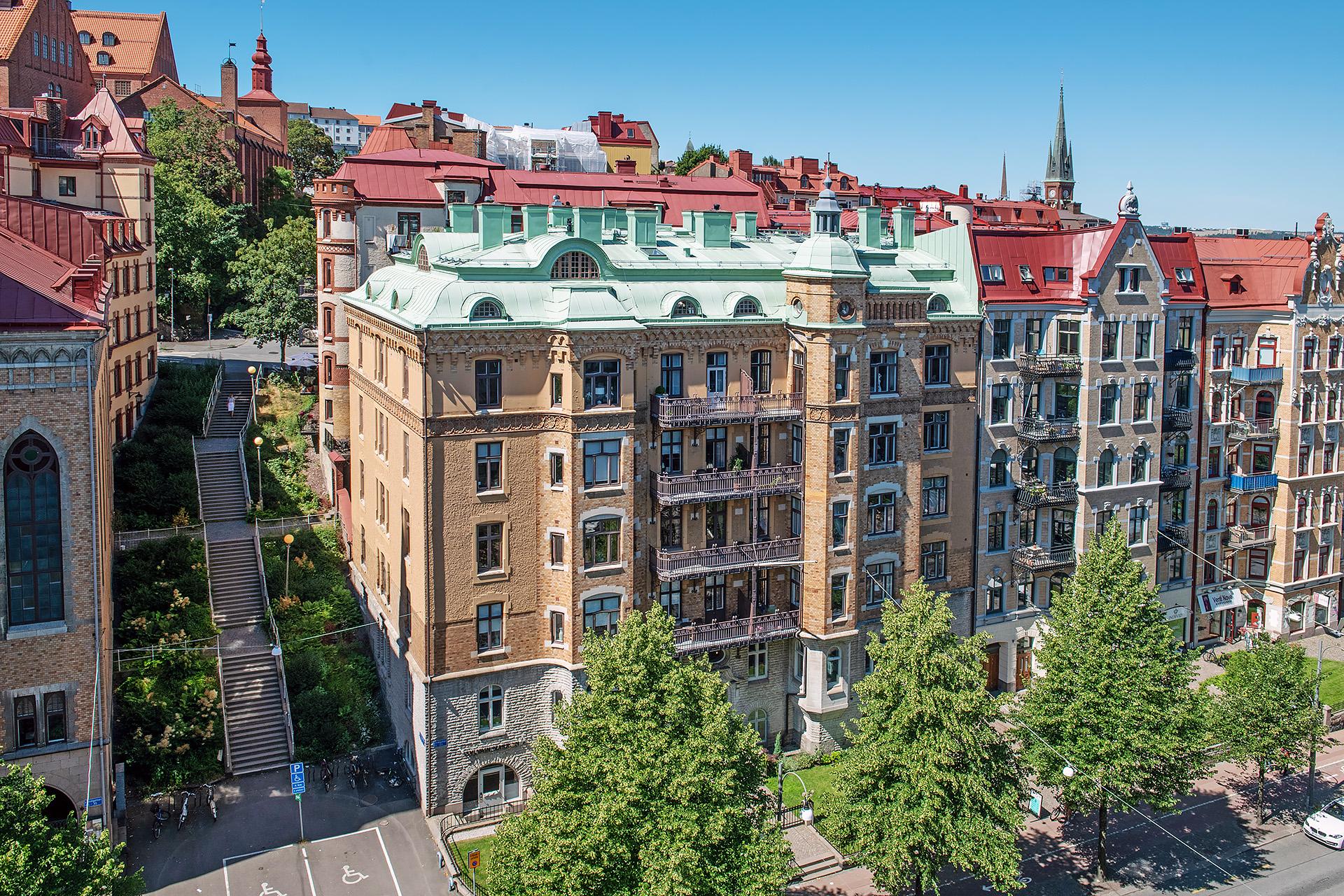 Vackert renoverad hörnlägenhet högt upp i vacker fastighet med utsikt över Linnégatan och hamninloppet. Vardagsrum om 35 kvm med fem höga fönster i två väderstreck. Ett underbart burspråk med vy över Linnés takåsar ger en härlig frihetskänsla. Renoverat socialt kök i fil med vardagsrummet och utgång till balkong. Nyrenoverat badrum med tvättmaskin. Möjlighet att göra om till en 3:a. Välskött förening med stor andel hyresintäkter.