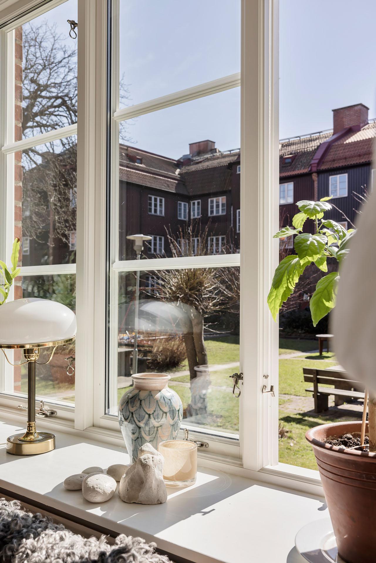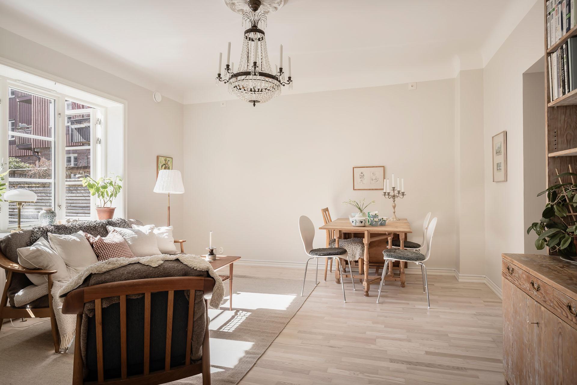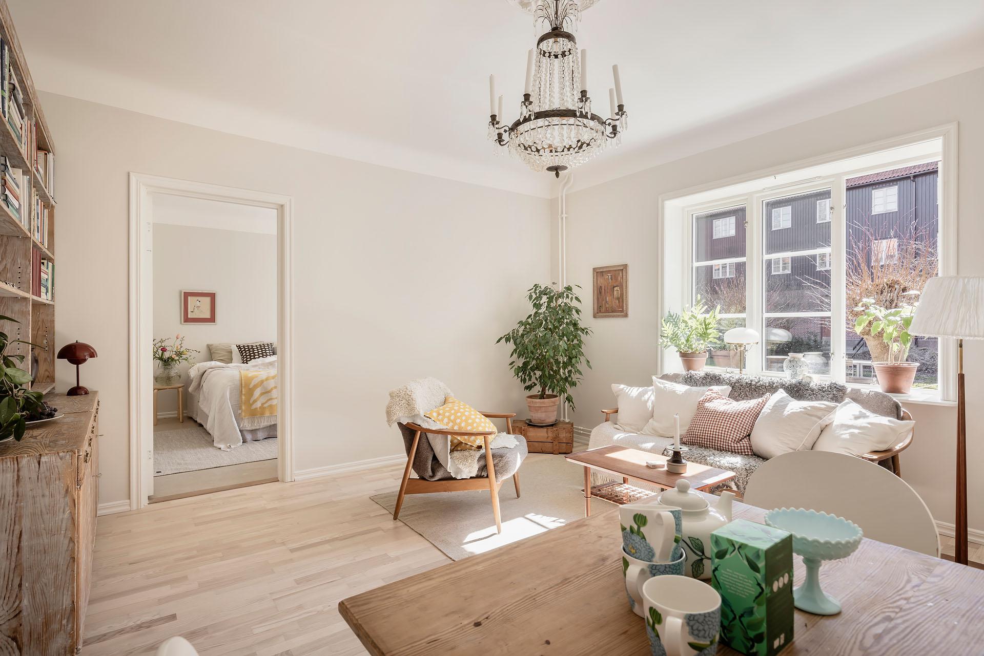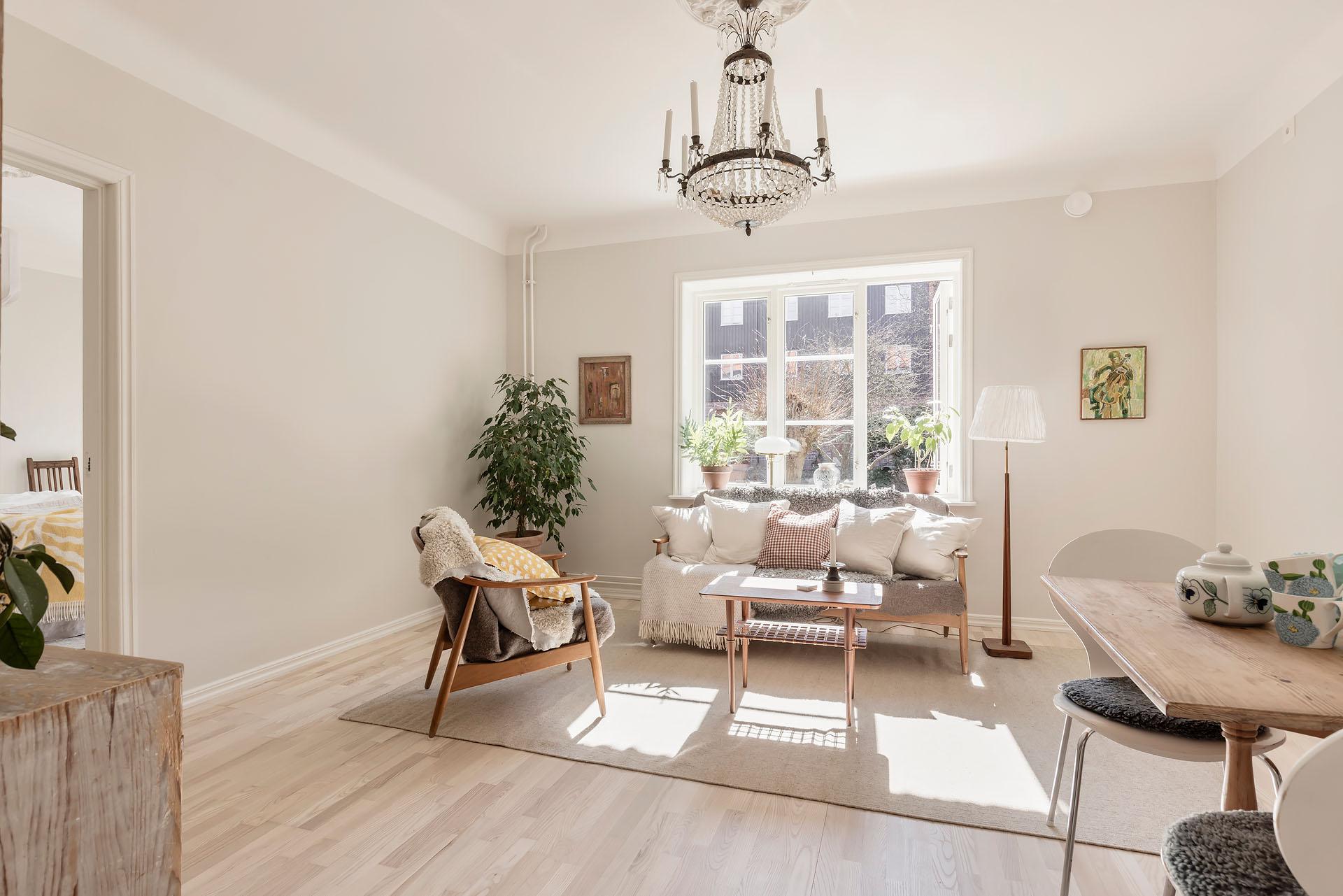 I hjärtat av Bagaregården, med ett tyst och ostört läge, ligger denna omsorgsfullt renoverade bostad med en känsla som är svår att slå. En halvtrappa upp, i husets murade del, möts du av djupa fönsternischer, gedigna väggar och ett fantastiskt ljusinsläpp från spröjsade fönster som vetter mot den lummiga, parkliknande innergården. Alla val, från material till färgnyanser, är noga övervägda. Vid renovering och återställande av takhöjd i vardagsrum och sovrum anlitades en stuckatör för att få till den klassiska rundningen där tak möter vägg, och återställa takrosetten