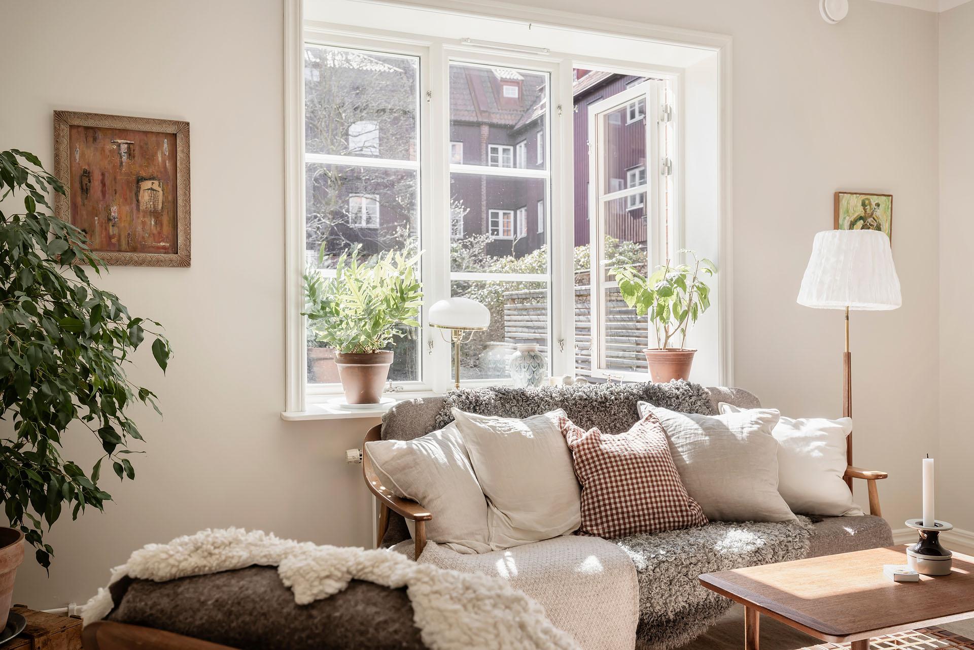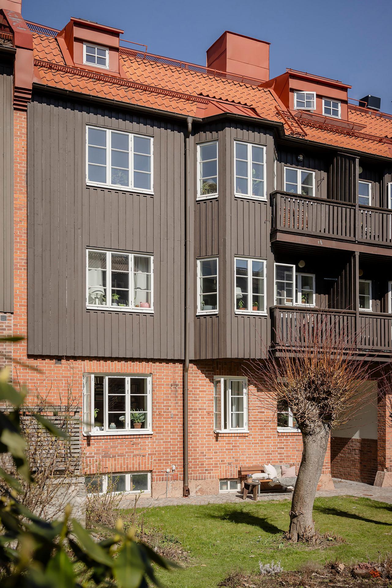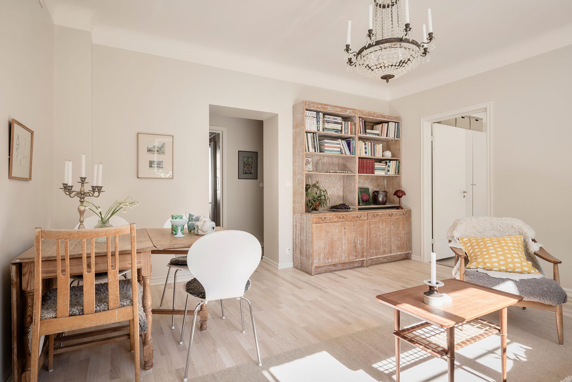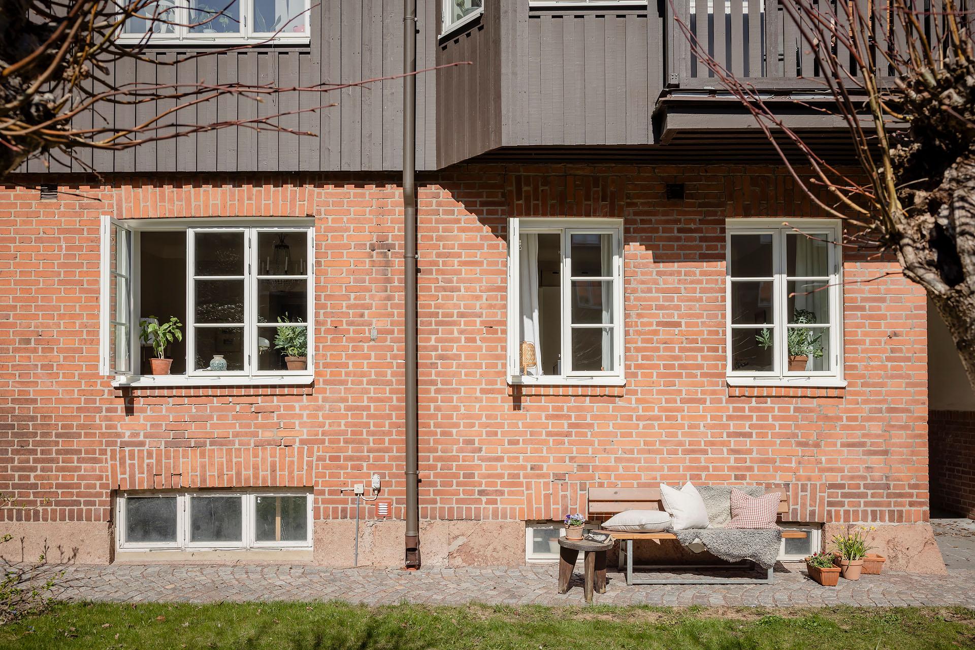 I hjärtat av Bagaregården, med ett tyst och ostört läge, ligger denna omsorgsfullt renoverade bostad med en känsla som är svår att slå. En halvtrappa upp, i husets murade del, möts du av djupa fönsternischer, gedigna väggar och ett fantastiskt ljusinsläpp från spröjsade fönster som vetter mot den lummiga, parkliknande innergården. Alla val, från material till färgnyanser, är noga övervägda. Vid renovering och återställande av takhöjd i vardagsrum och sovrum anlitades en stuckatör för att få till den klassiska rundningen där tak möter vägg, och återställa takrosetten