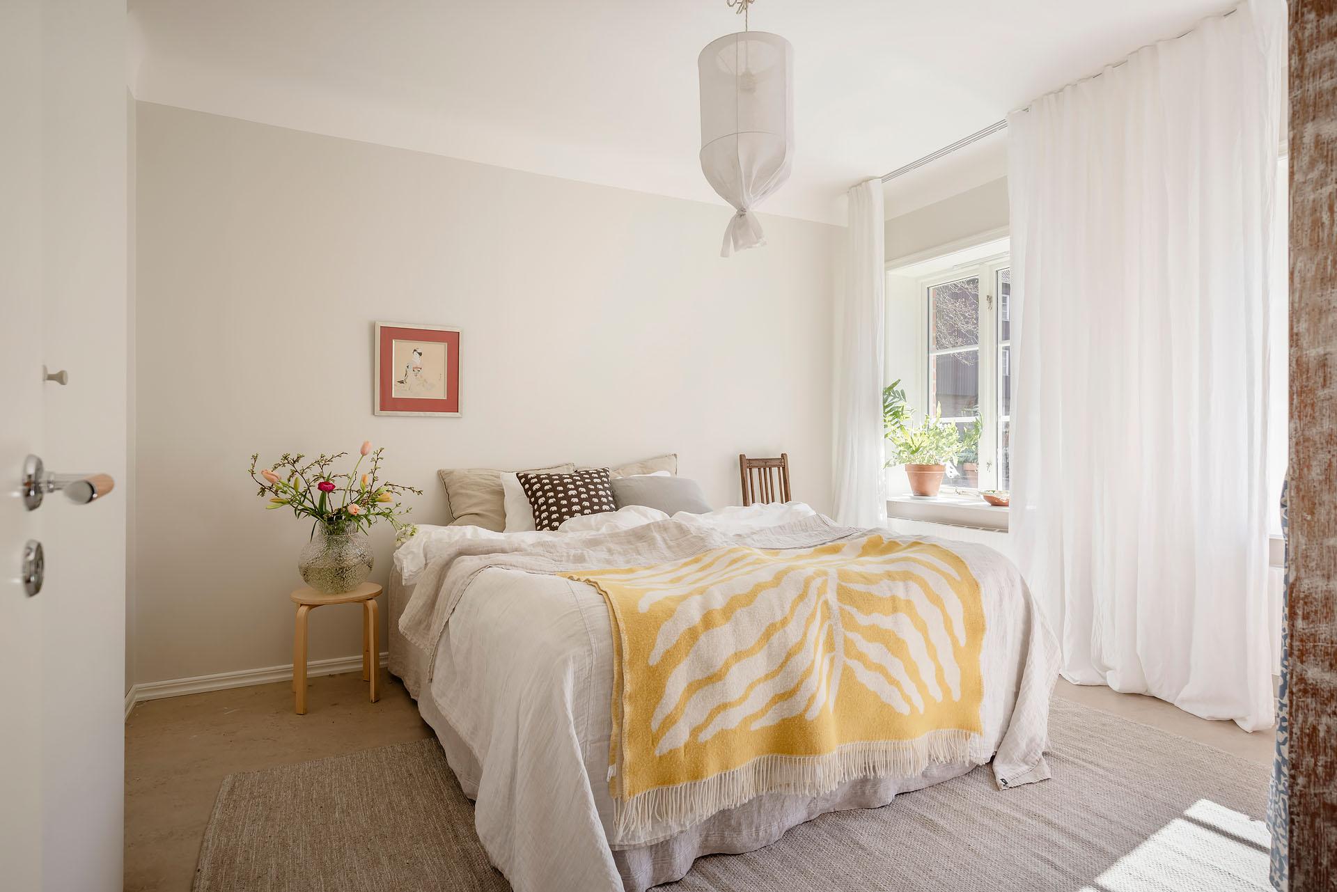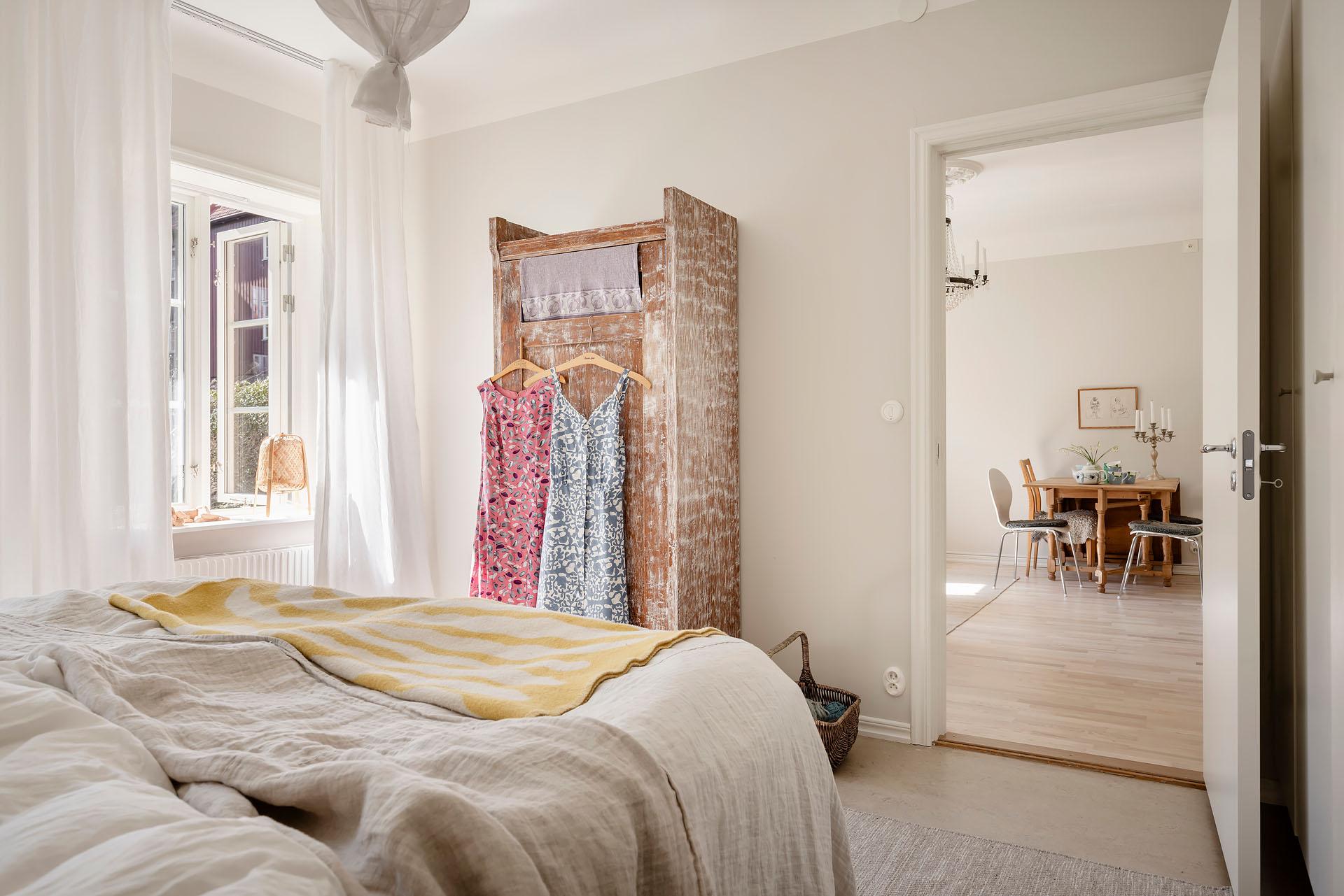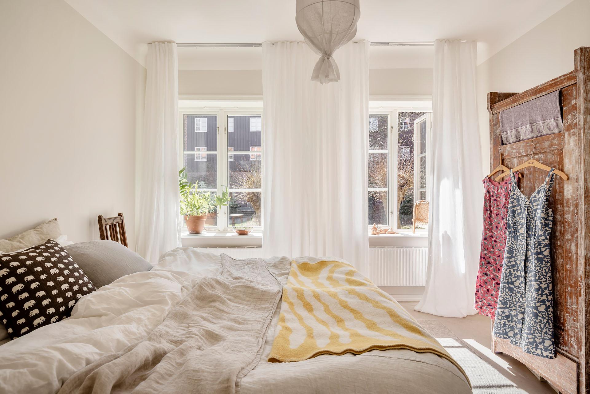 Sovrummet är rofyllt och generöst tilltaget, med gott om plats för dubbelsäng och kompletterande möblering. Även här faller ljuset vackert in genom spröjsade fönster med djupa nischer, och den lugna färgsättningen bidrar till en harmonisk atmosfär. Läget mot gården gör rummet tyst och avskilt, med en grön fond som förändras med årstiderna.