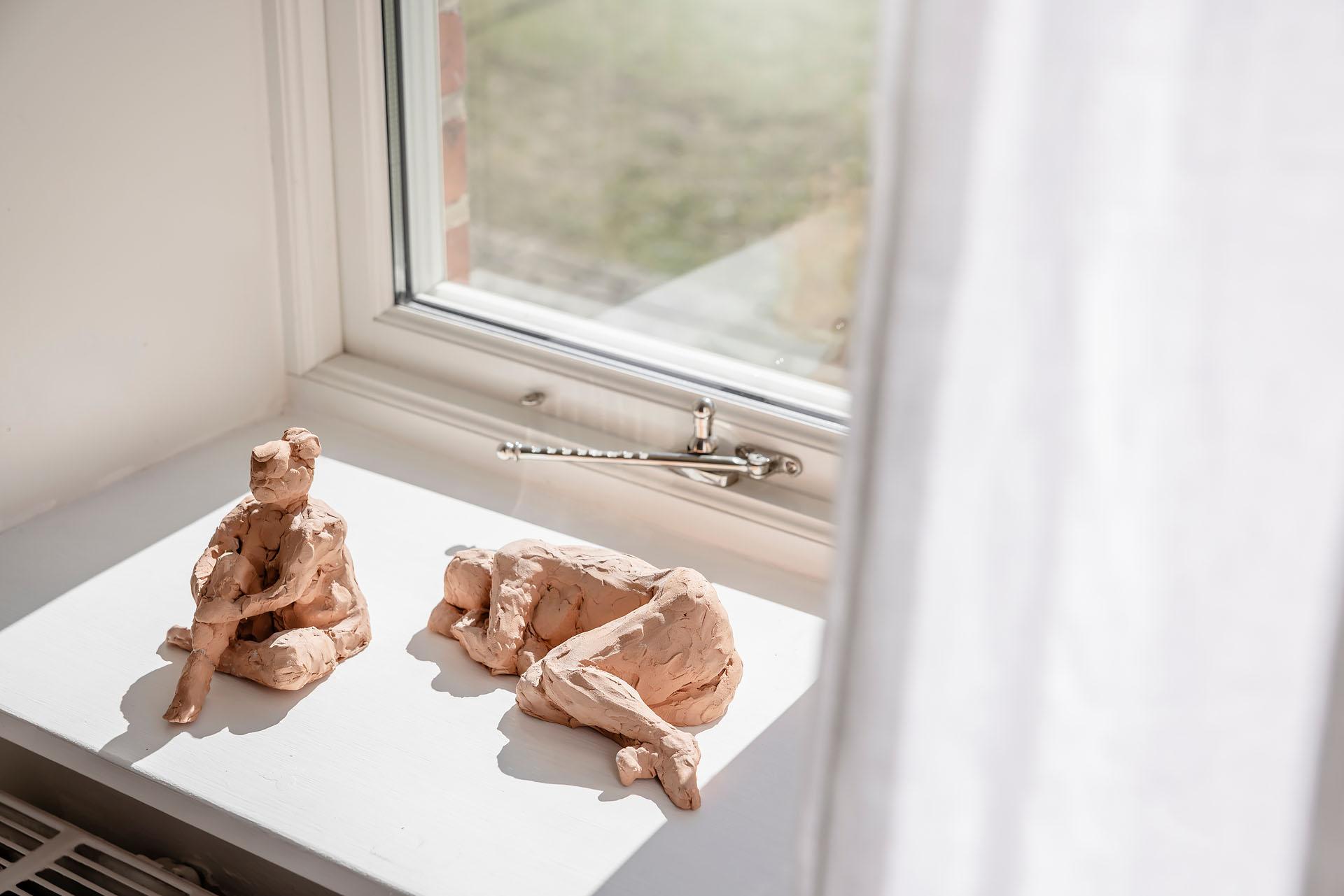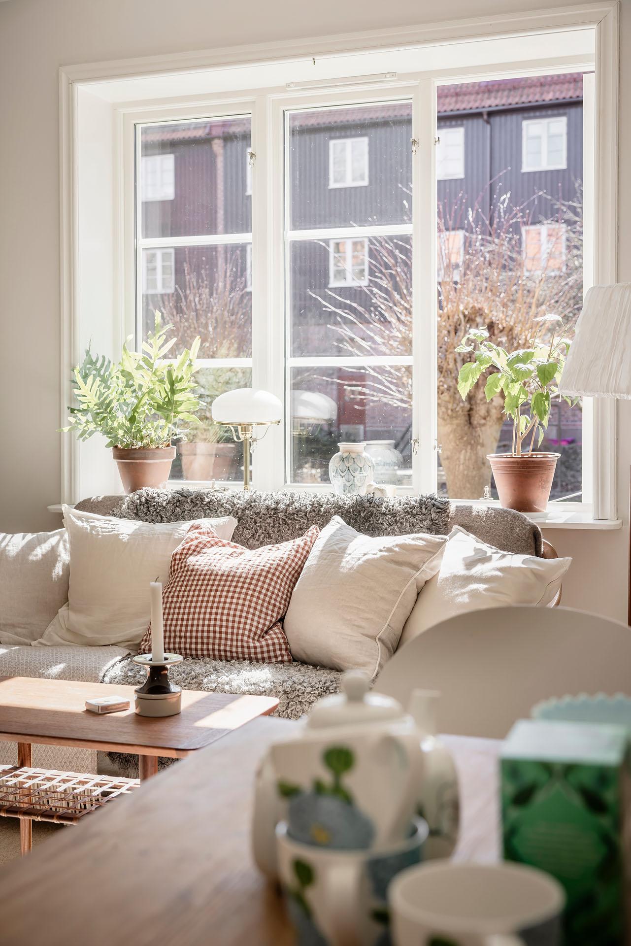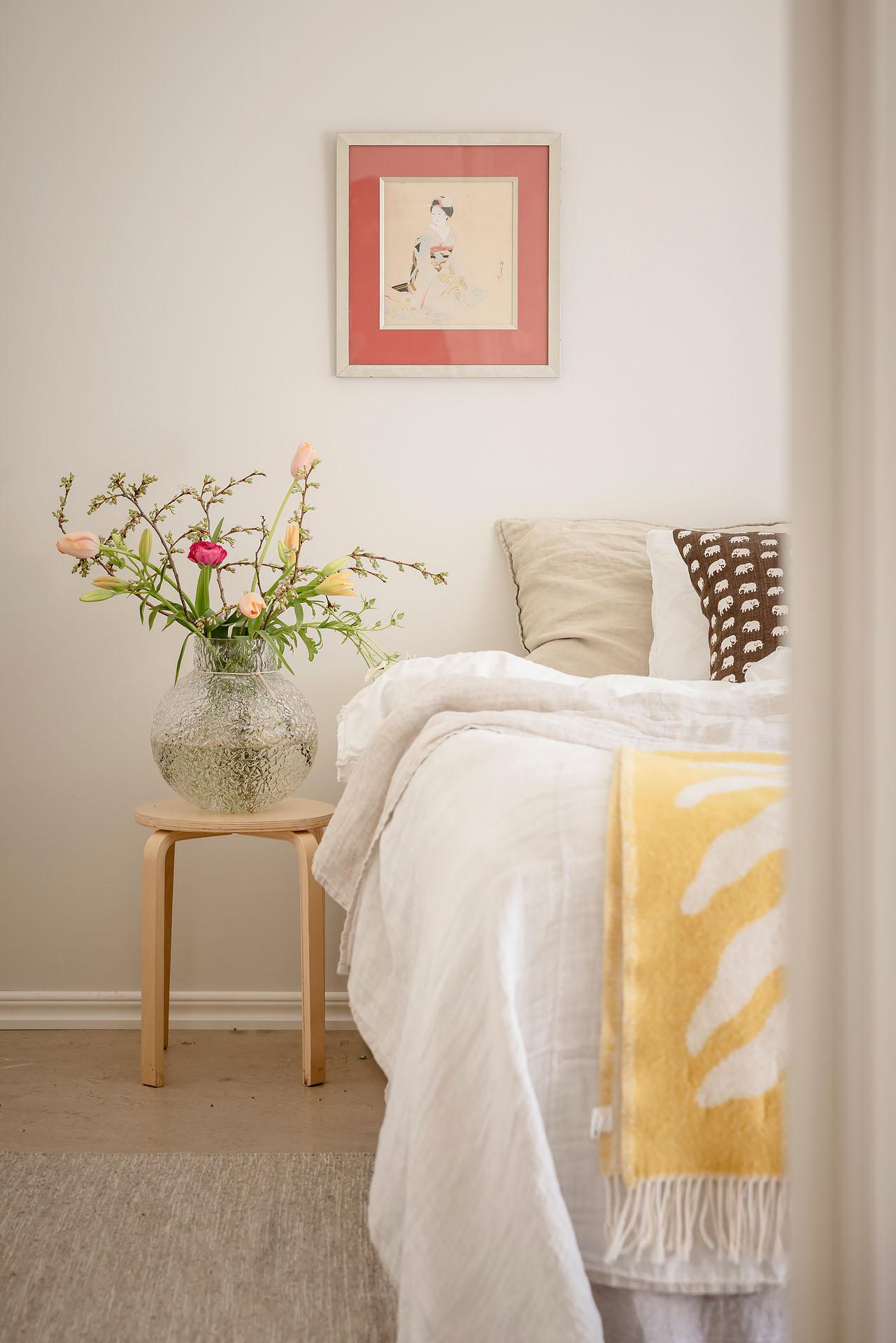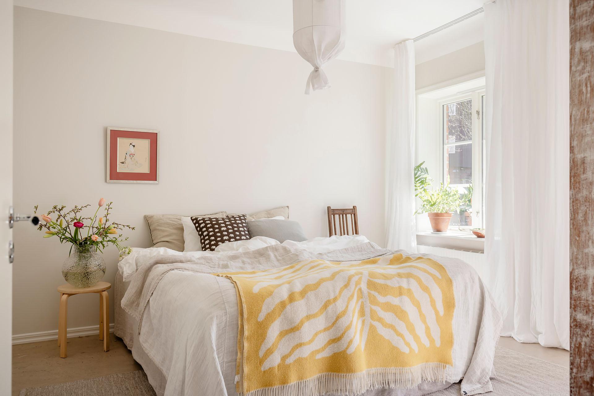 Sovrummet är rofyllt och generöst tilltaget, med gott om plats för dubbelsäng och kompletterande möblering. Även här faller ljuset vackert in genom spröjsade fönster med djupa nischer, och den lugna färgsättningen bidrar till en harmonisk atmosfär. Läget mot gården gör rummet tyst och avskilt, med en grön fond som förändras med årstiderna.
