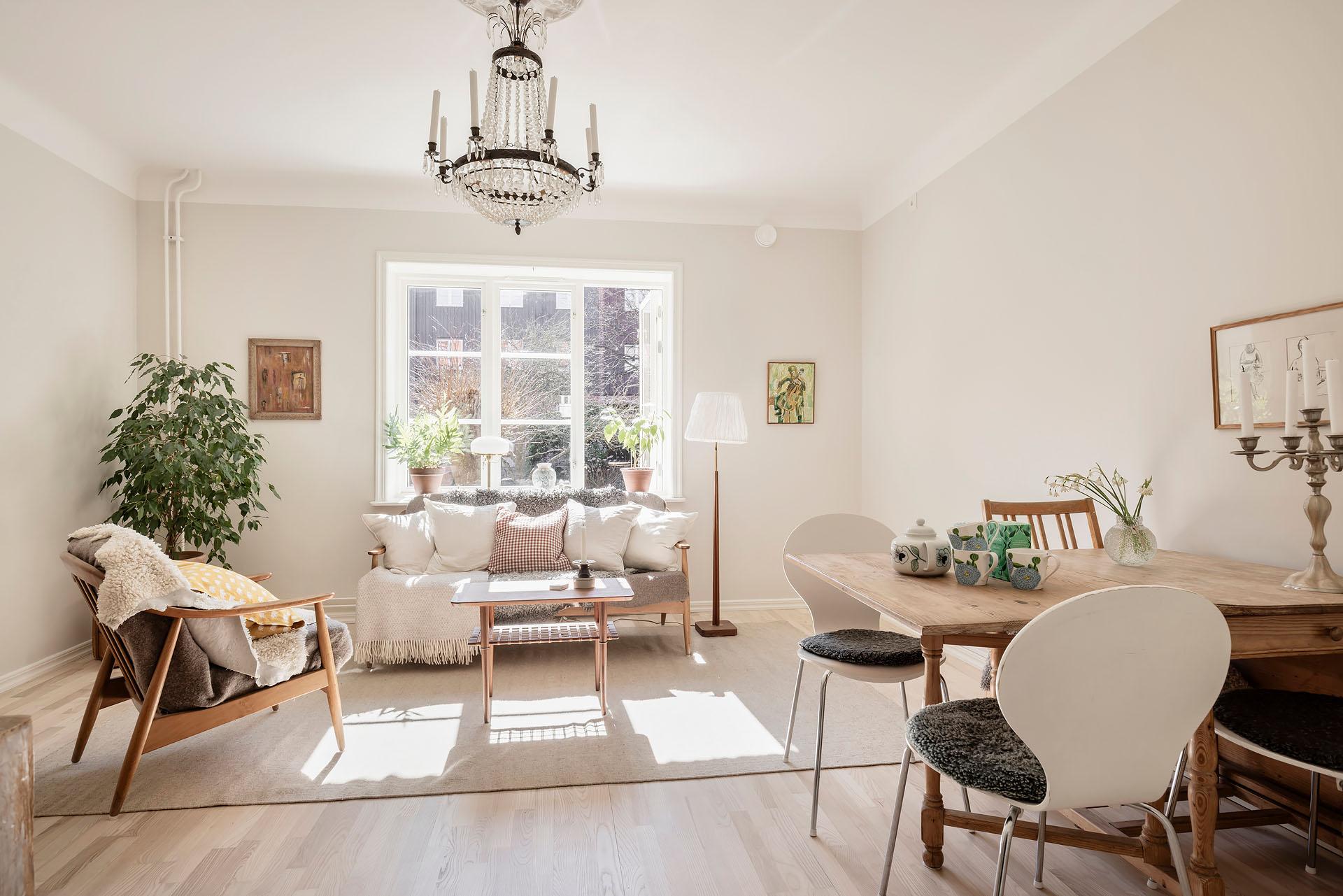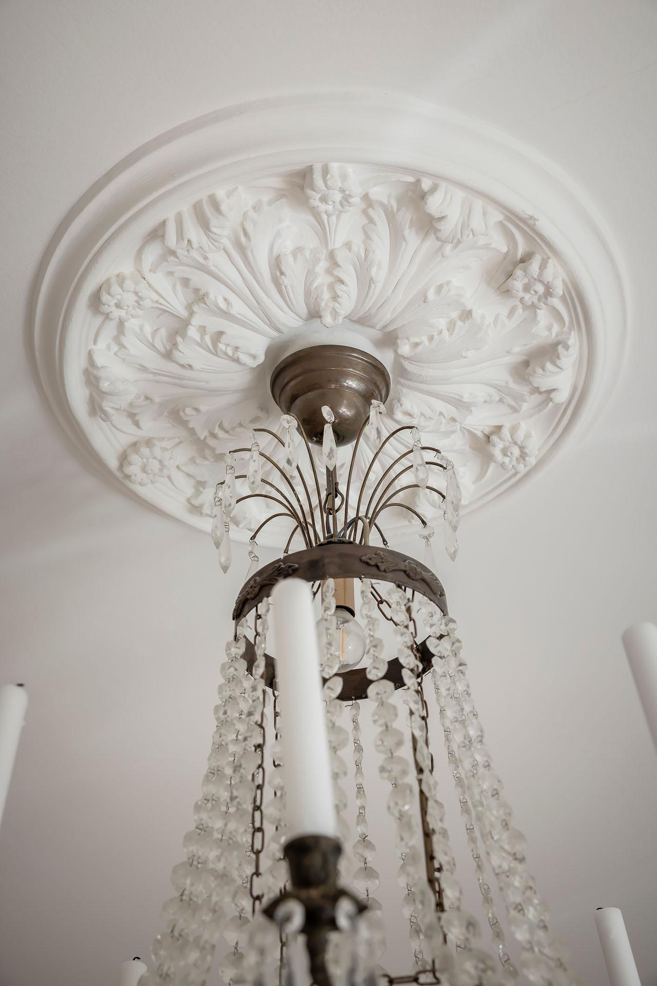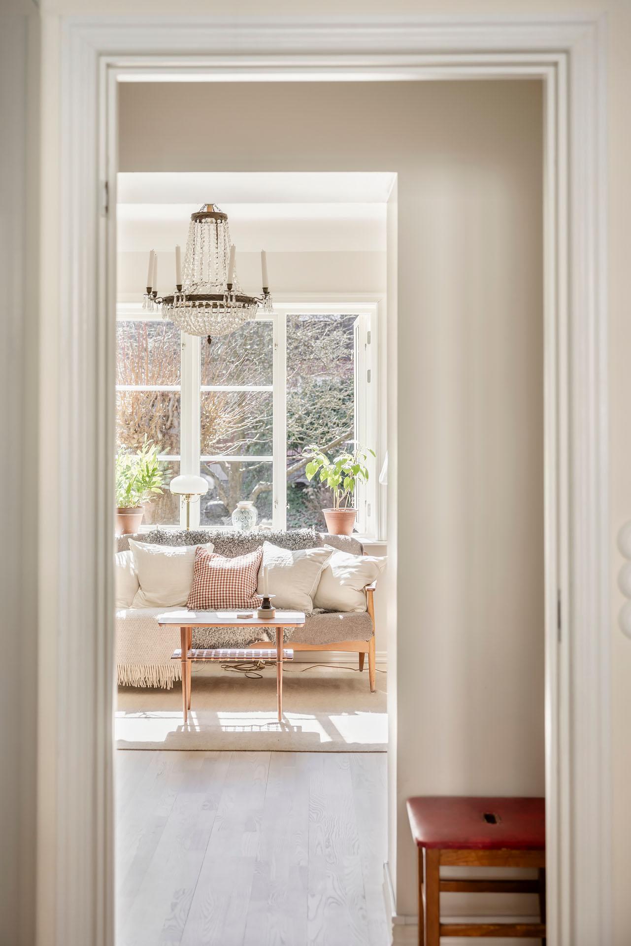Vardagsrummet är ett generöst och vackert rum där ljuset får spela huvudrollen. De spröjsade fönstren vetter mot den grönskande innergården. Här ryms både en större soffgrupp och matplats utan att det känns trångt, och planlösningen skapar ett fint flöde vidare mot övriga rum. Takrosett och väl avvägda proportioner förstärker den klassiska känslan, medan de omsorgsfullt valda ytskikten ger ett lugnt och enhetligt uttryck.