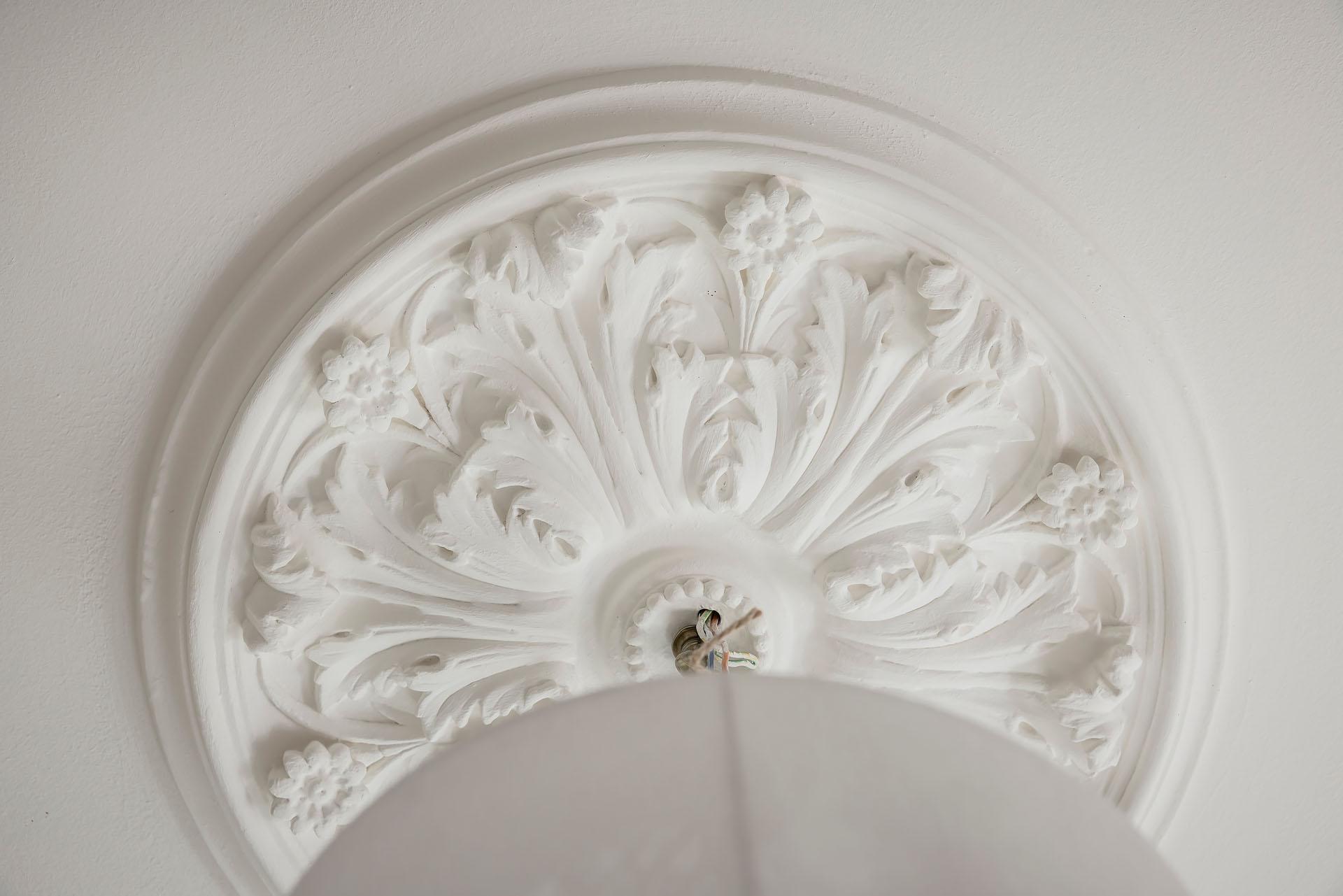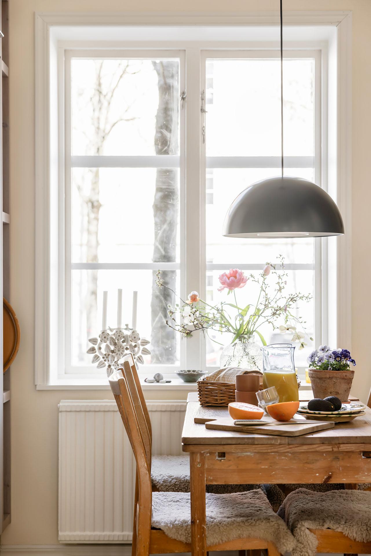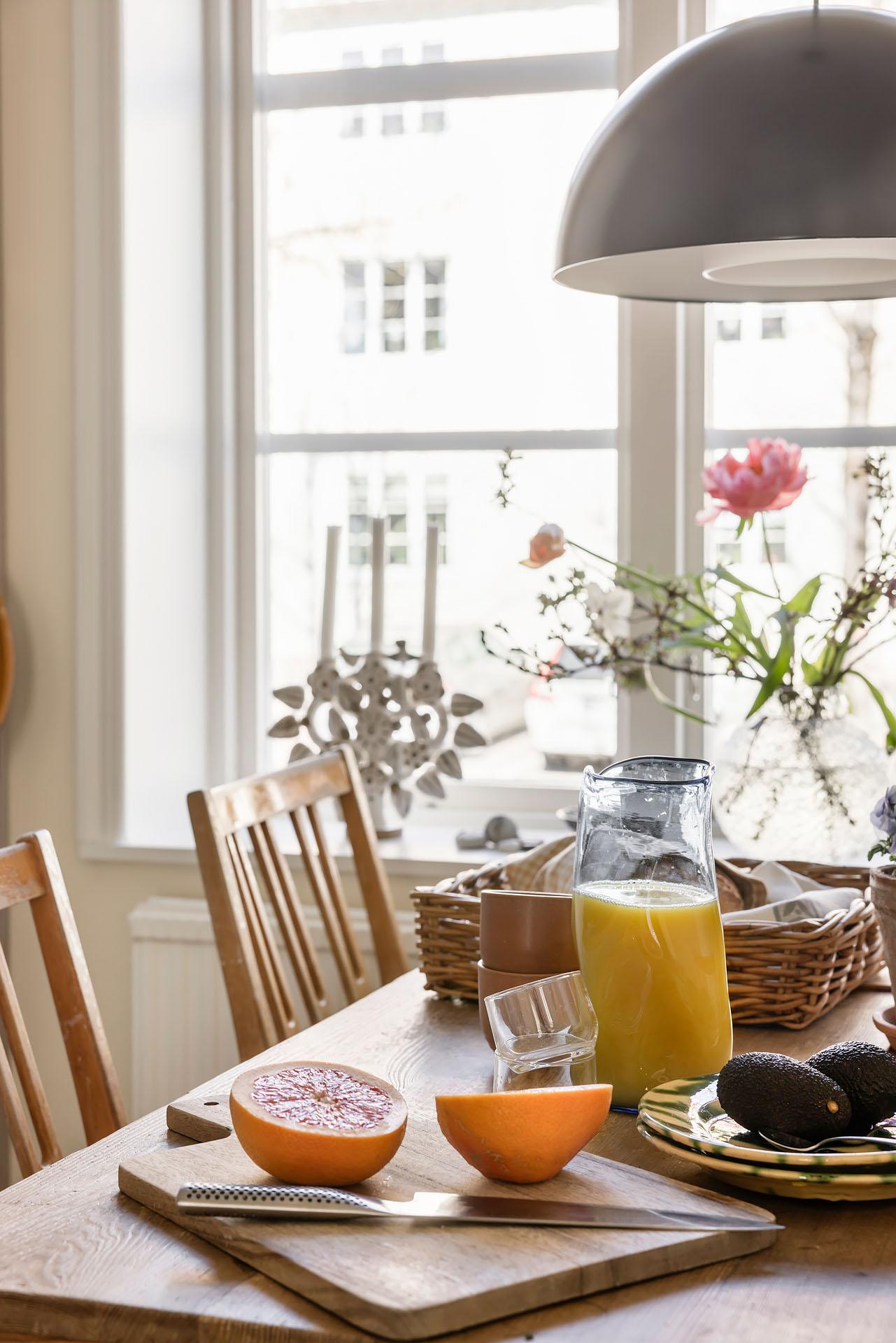 Vardagsrummet är ett generöst och vackert rum där ljuset får spela huvudrollen. De spröjsade fönstren vetter mot den grönskande innergården. Här ryms både en större soffgrupp och matplats utan att det känns trångt, och planlösningen skapar ett fint flöde vidare mot övriga rum. Takrosett och väl avvägda proportioner förstärker den klassiska känslan, medan de omsorgsfullt valda ytskikten ger ett lugnt och enhetligt uttryck.
