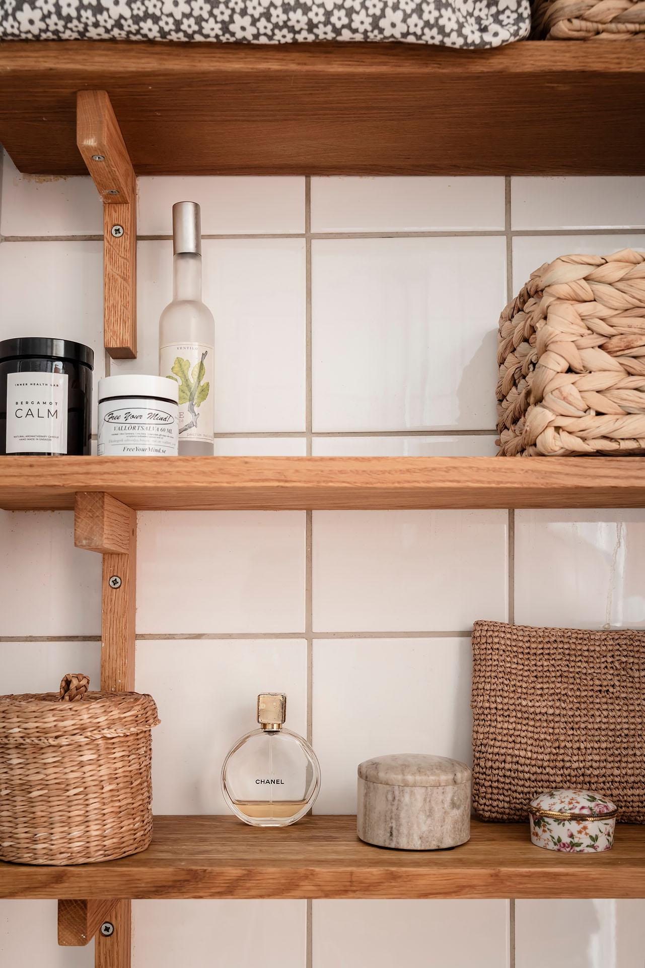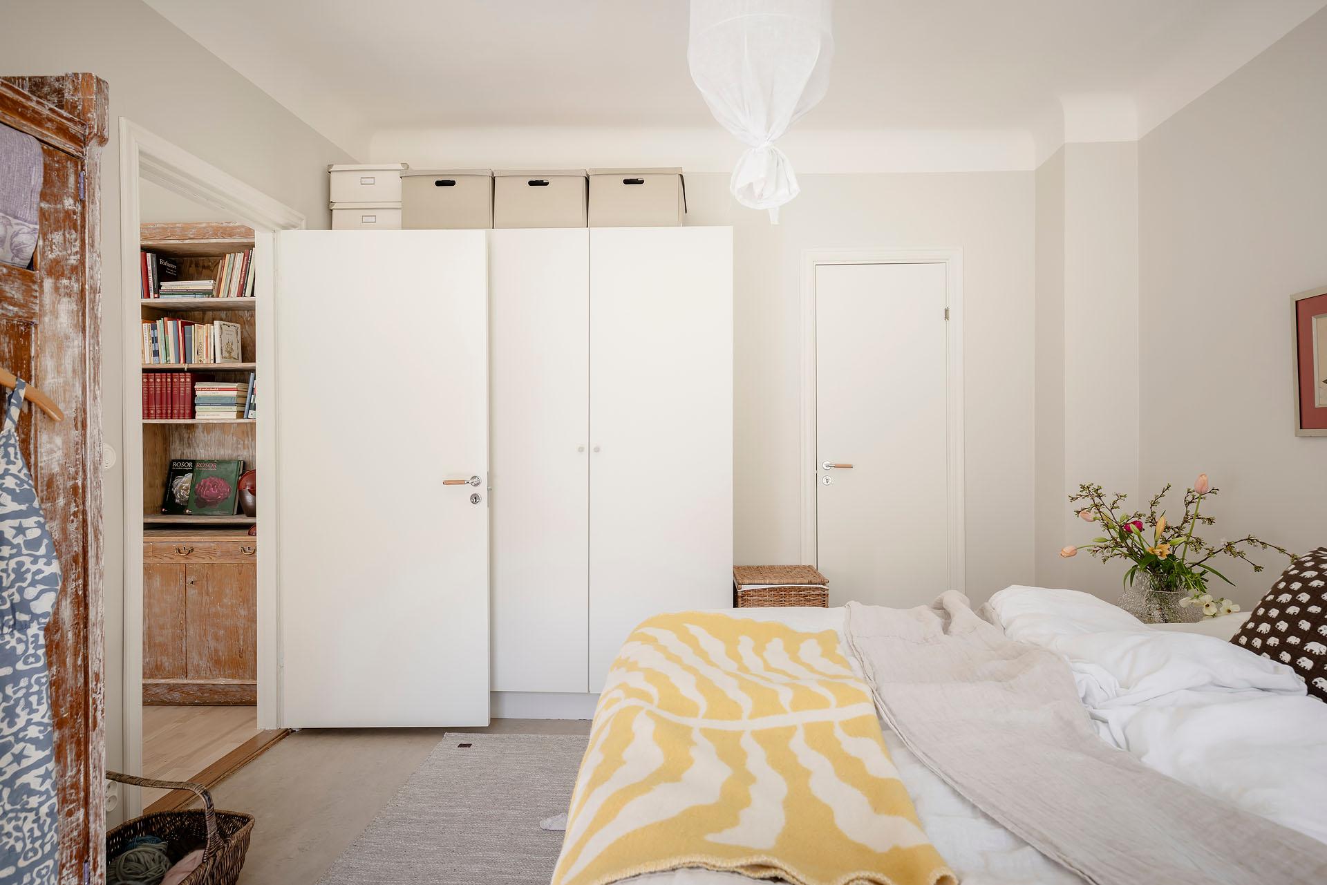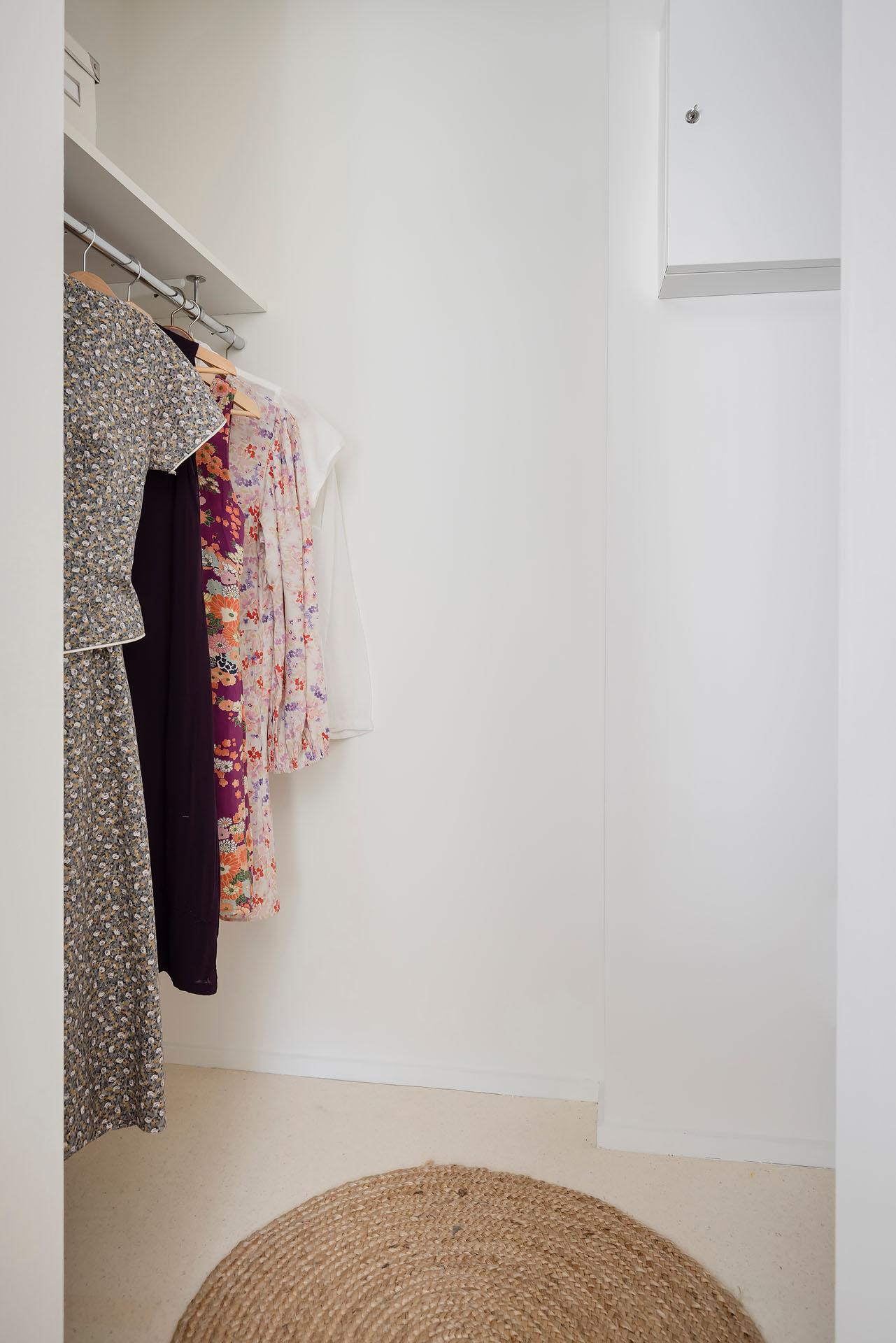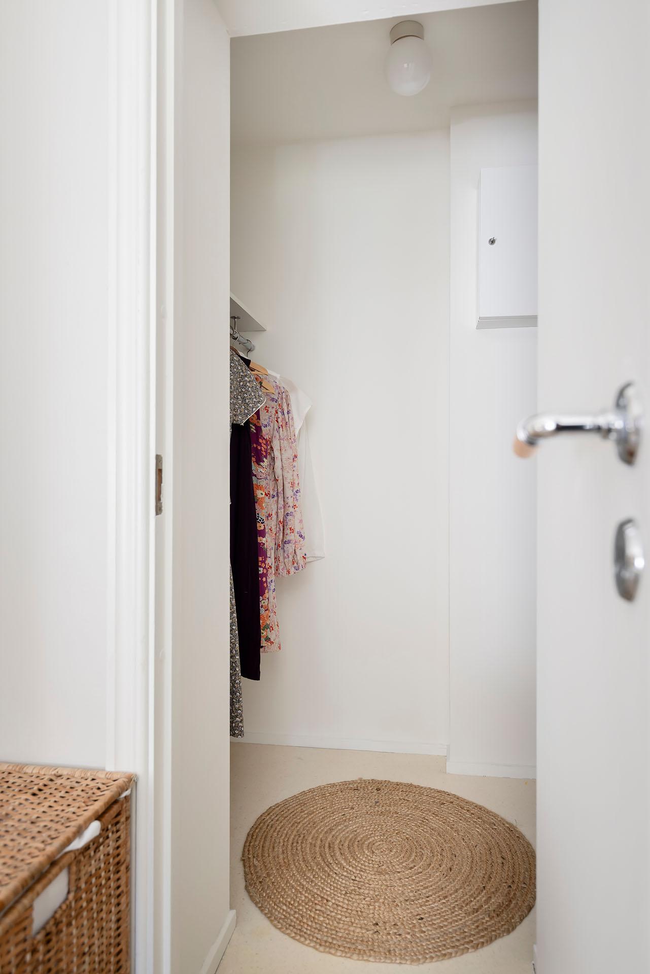 I direkt anslutning till sovrummet finns en praktisk klädkammare som löser förvaringen på ett mycket bra sätt. Här finns gott om plats för både hängande och vikta plagg, vilket bidrar till att övriga rum kan hållas luftiga och fria från förvaringsmöbler.
