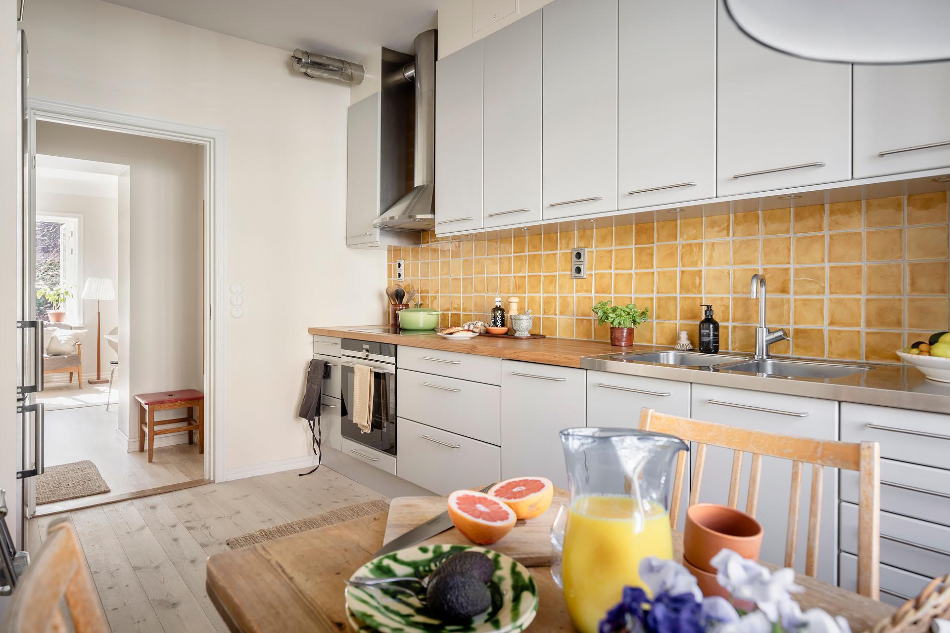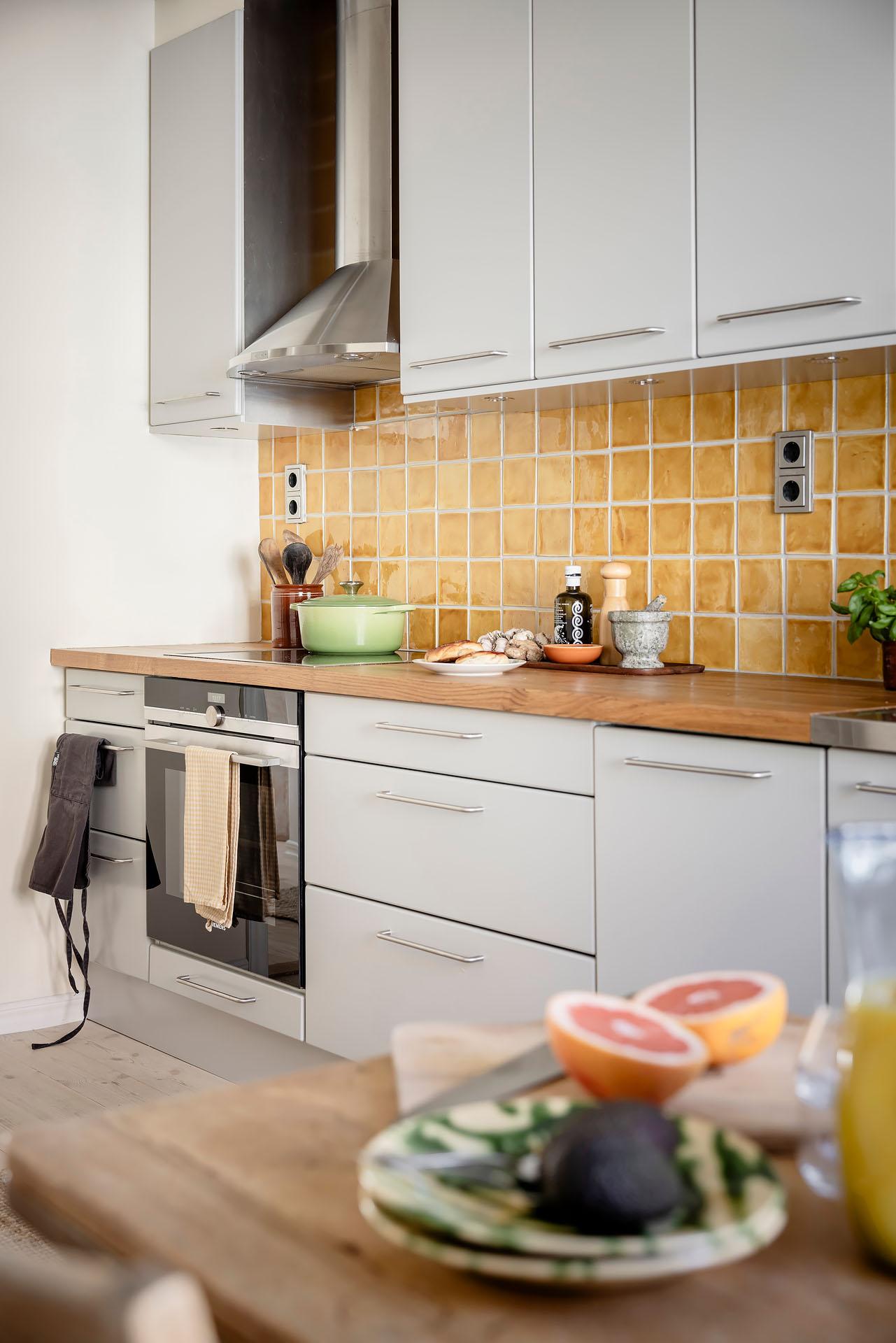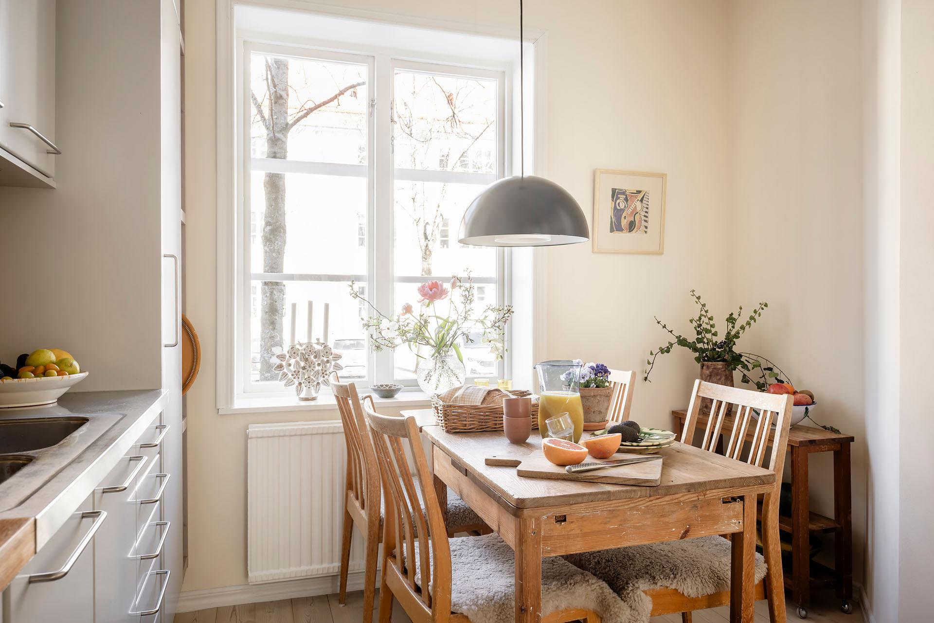 Köket är rymligt och inbjudande, med gott om arbetsyta och förvaring längs ena väggen. Inredningen kommer från Marbodal (2010), och de grå skåpsluckorna samspelar fint med den varma bänkskivan och det karaktärsfulla, handgjorda kaklet från Provence som ger rummet en egen identitet. Intill fönstret finns en naturlig plats för matbord, där man sitter med utsikt mot Falkgatans trädallé och ett fint ljusinsläpp. Planlösningen är klassisk och funktionell, med en tydlig uppdelning mellan arbetsdel och matplats.