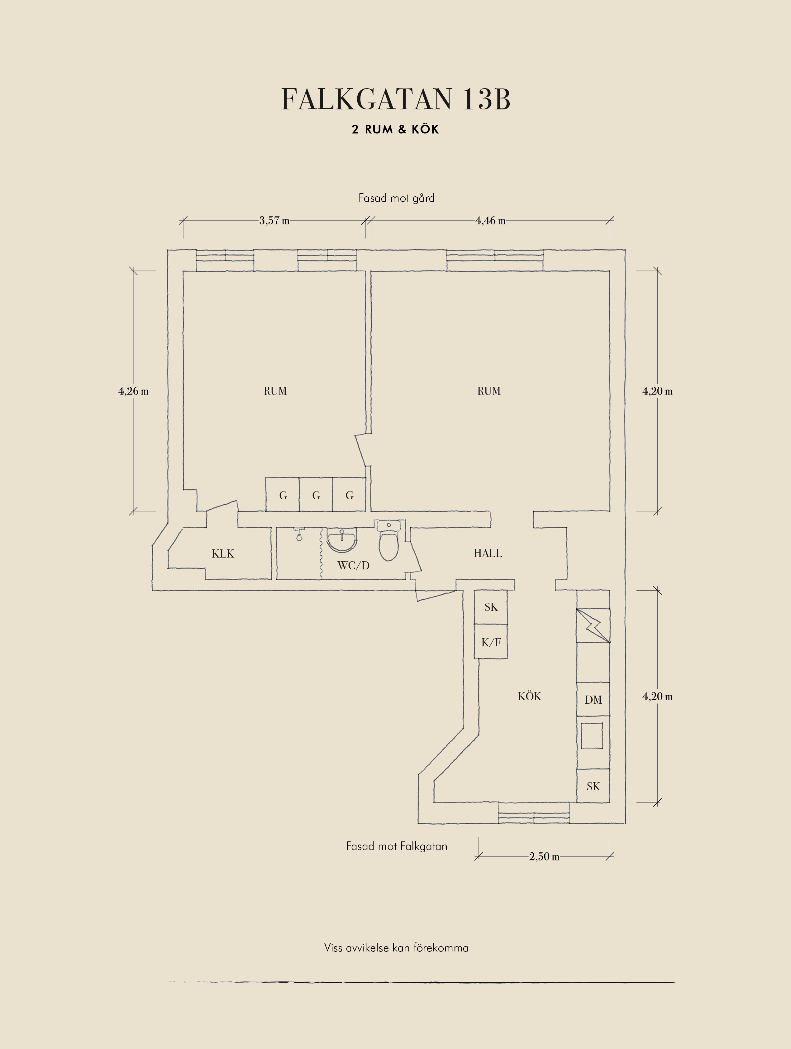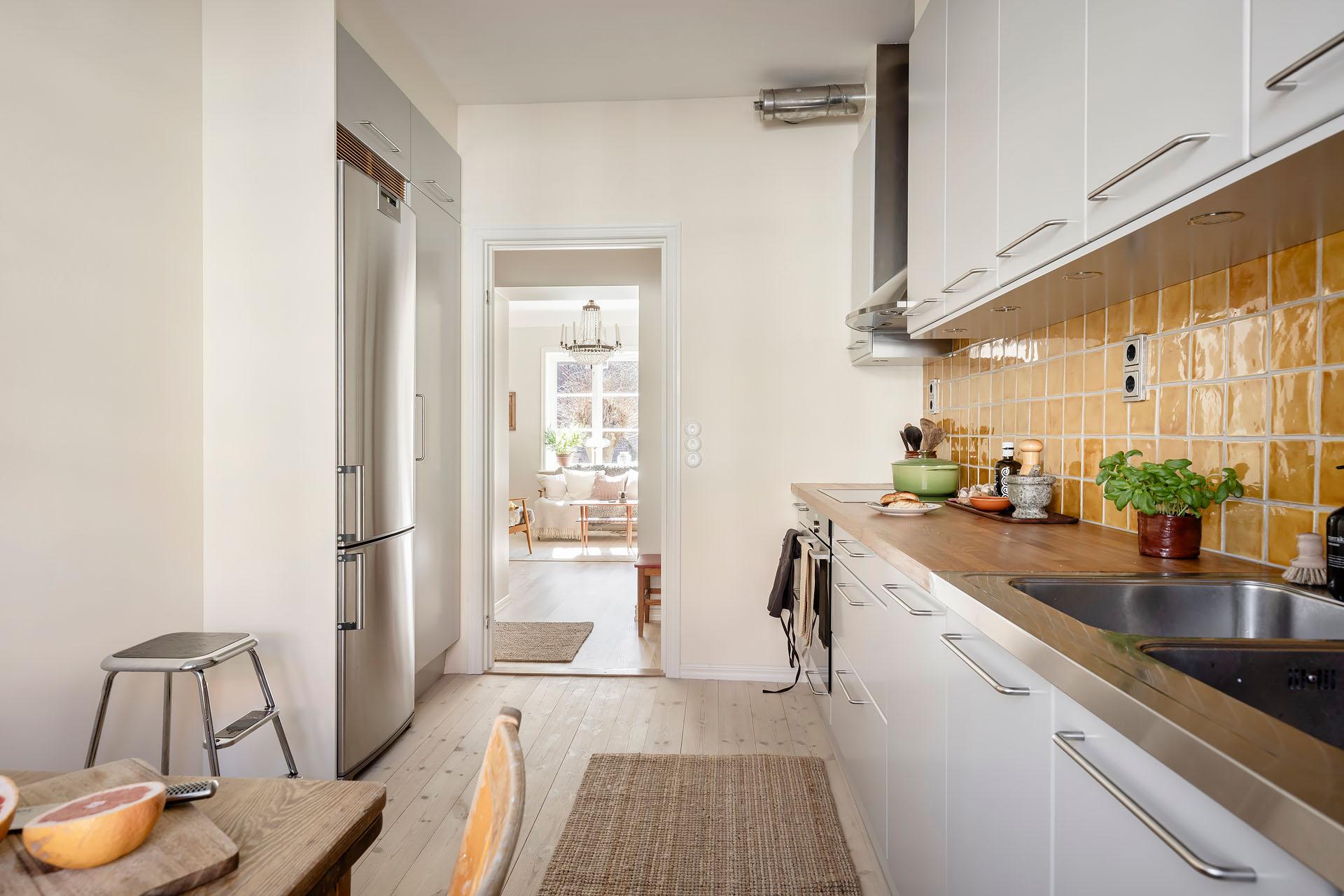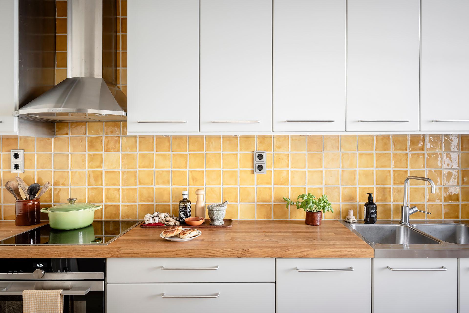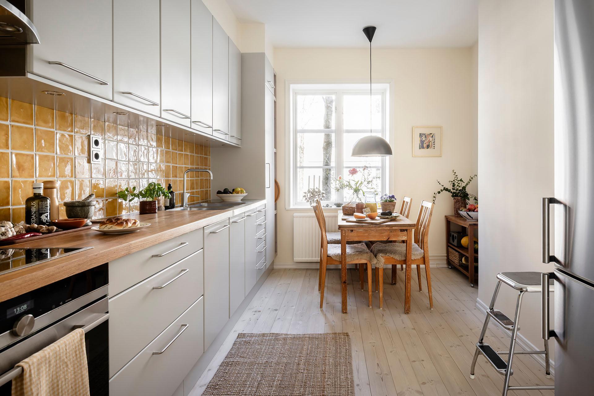 Köket är rymligt och inbjudande, med gott om arbetsyta och förvaring längs ena väggen. Inredningen kommer från Marbodal (2010), och de grå skåpsluckorna samspelar fint med den varma bänkskivan och det karaktärsfulla, handgjorda kaklet från Provence som ger rummet en egen identitet. Intill fönstret finns en naturlig plats för matbord, där man sitter med utsikt mot Falkgatans trädallé och ett fint ljusinsläpp. Planlösningen är klassisk och funktionell, med en tydlig uppdelning mellan arbetsdel och matplats.