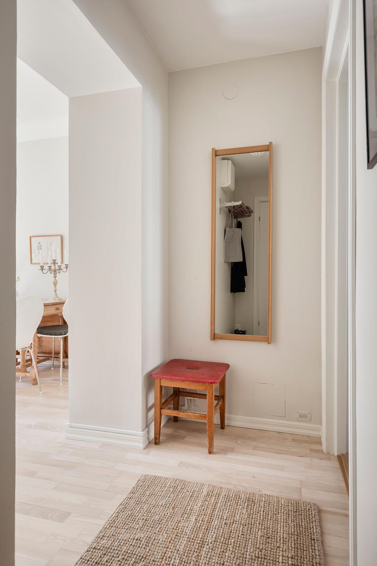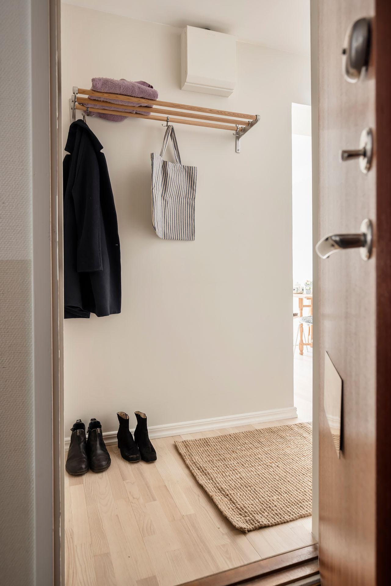 Hallen är centralt placerad och knyter samman bostadens samtliga rum på ett naturligt sätt. Här möts du direkt av den lugna färgskalan och de fina ytskikten som löper vidare genom hela hemmet. Plats finns för avhängning och förvaring, och siktlinjen vidare in mot vardagsrummet ger en fin föraning om ljuset och rymden som väntar.