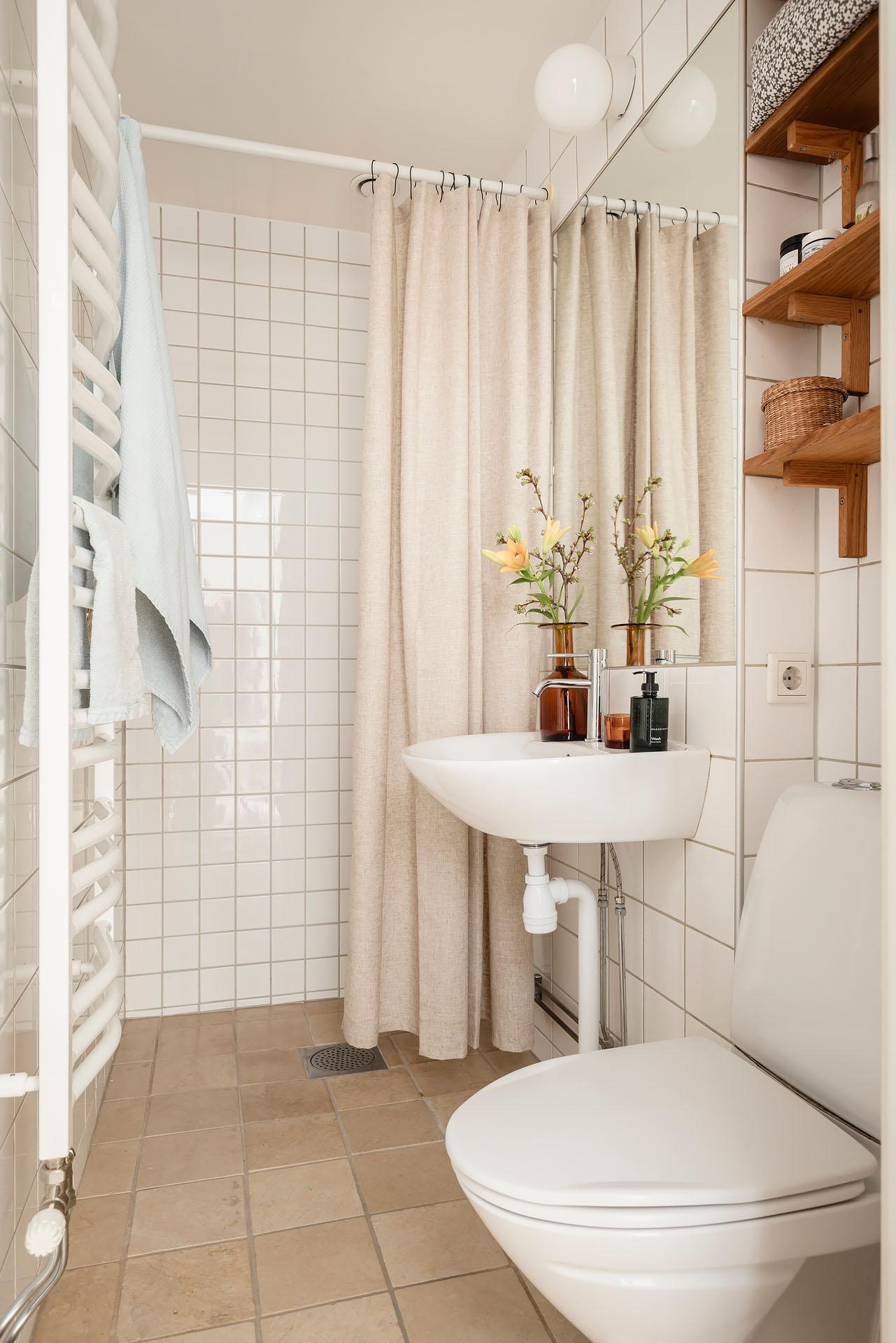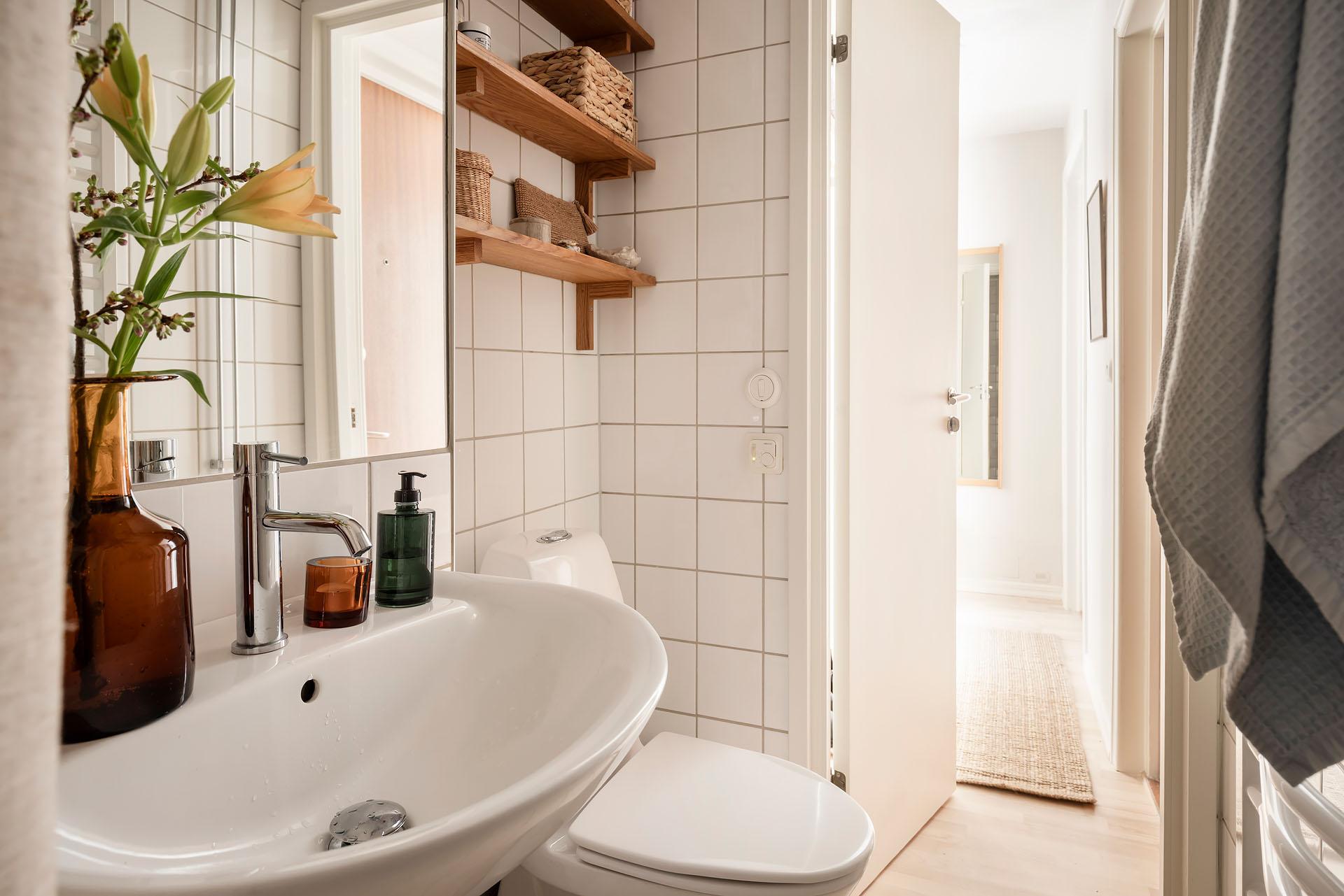 Badrummet är stilrent och välhållet, renoverat 2002 i en stil som är lika aktuell idag som då, med vita kaklade väggar och marmorgolv. Här finns dusch, handfat och wc i en funktionell disposition, och trots sin kompakta yta upplevs rummet som både praktiskt och trivsamt.