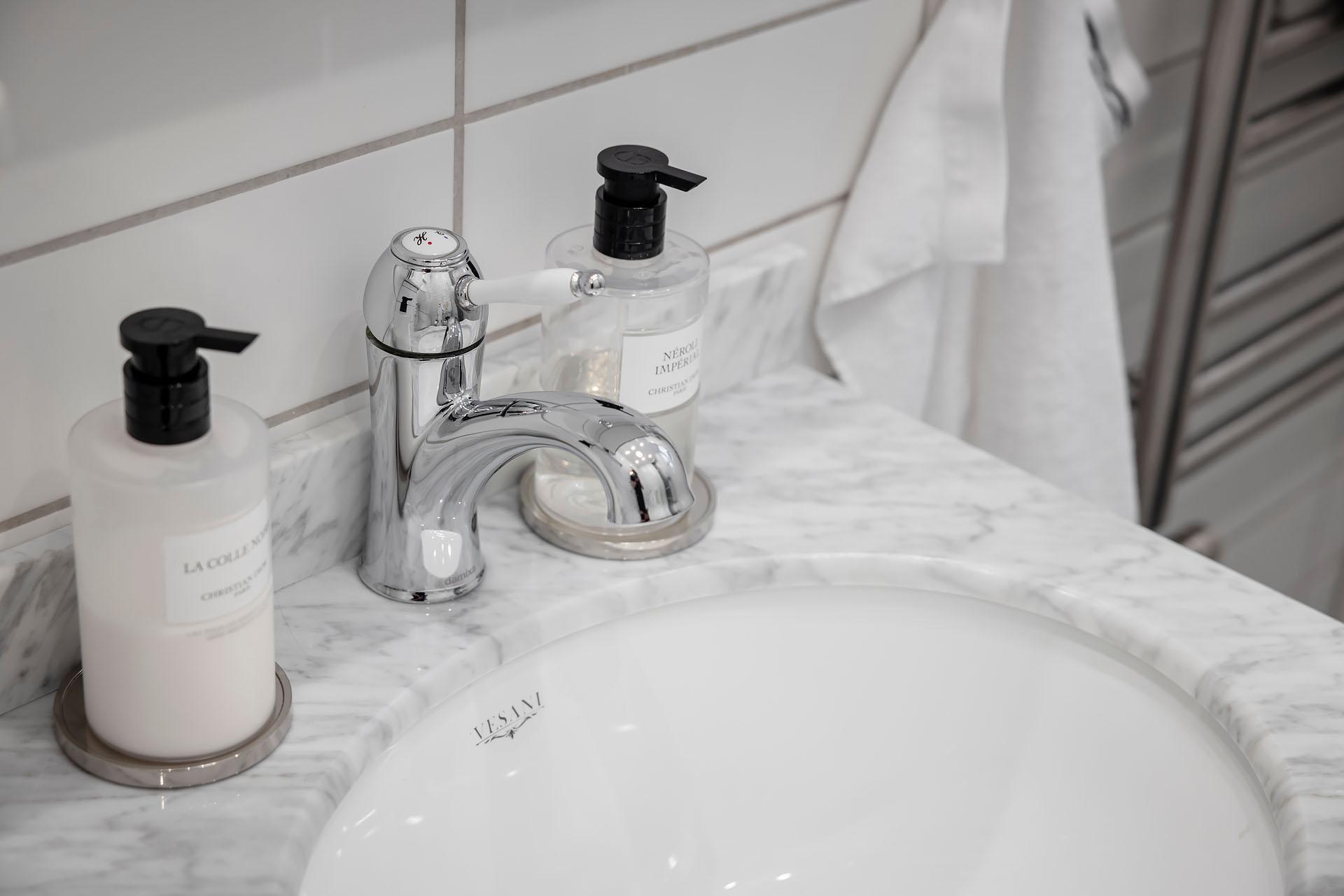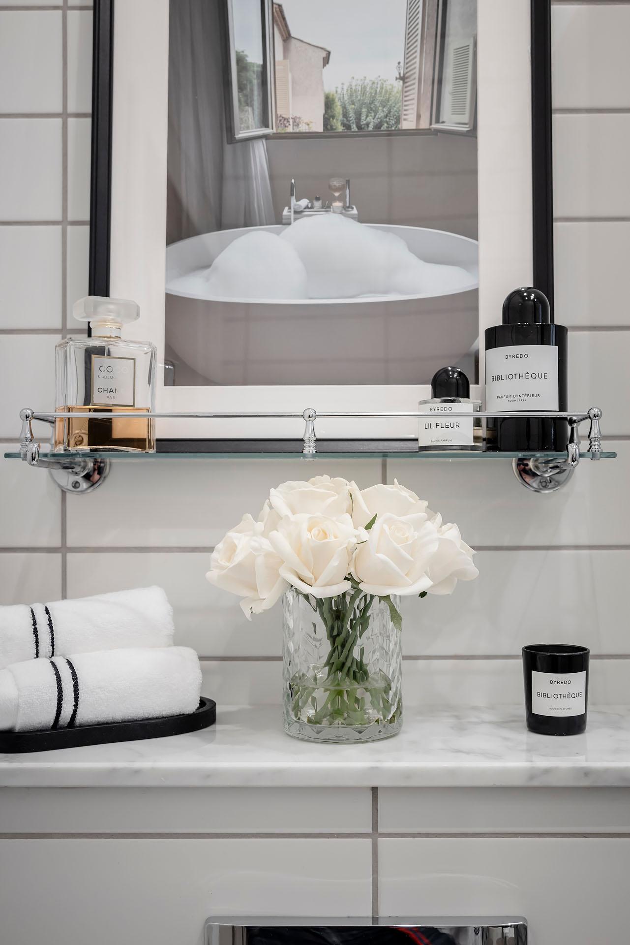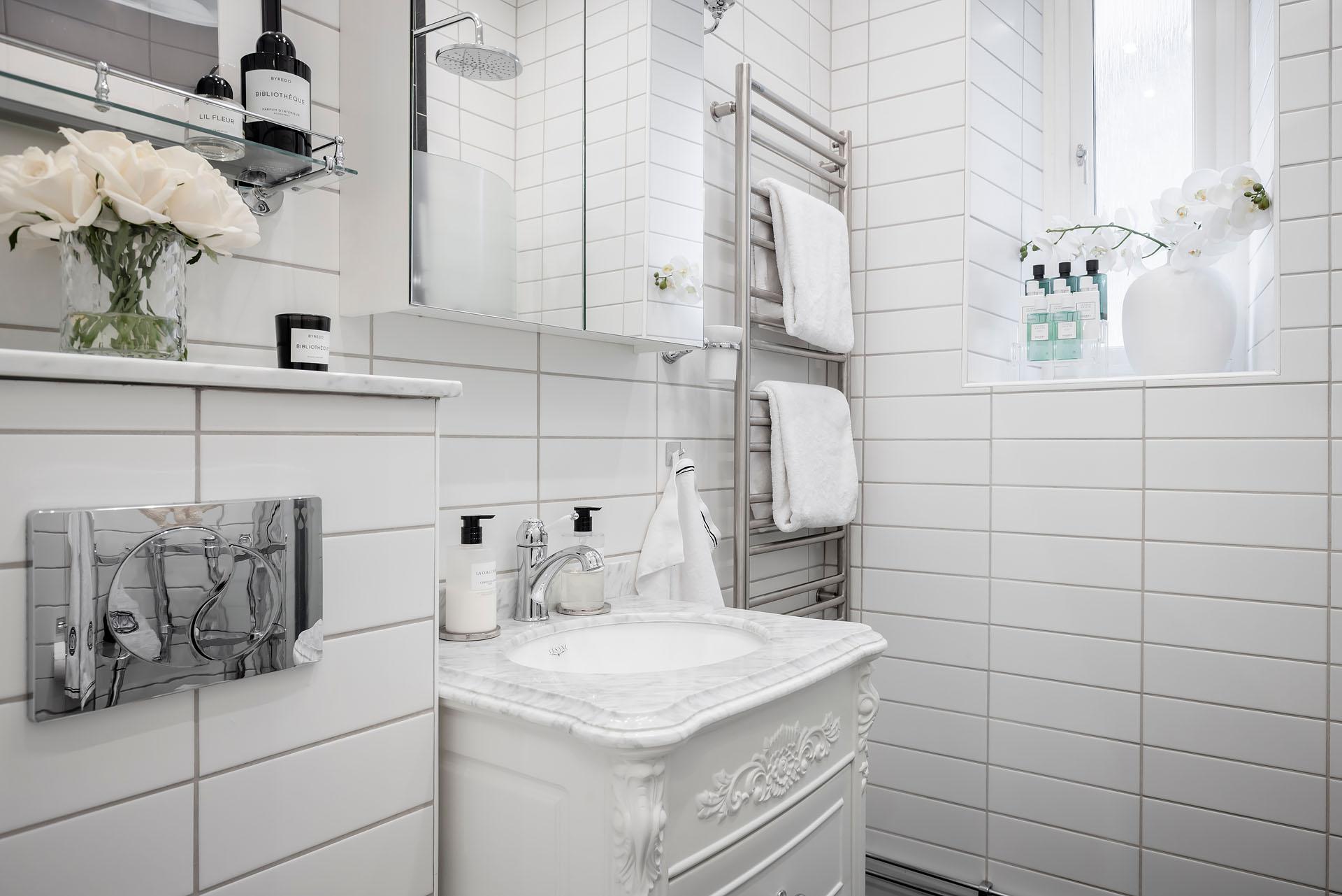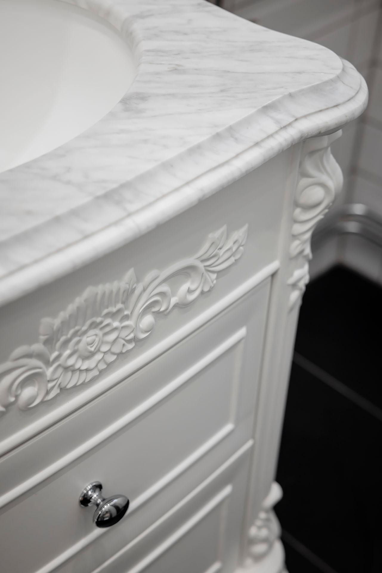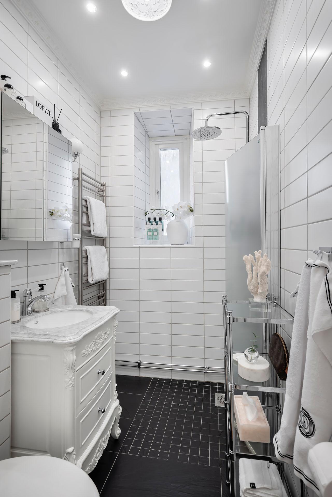 Ett smakfullt badrum i klassiska kontraster. Vita kaklade väggar möter mörkt klinkergolv med golvvärme. Här finns en exklusiv kommod med Carrarmarmor samt marmorhylla över toalettstolen. vilket skapar en elegant och påkostad känsla. Duschhörna med vikbara glasväggar.