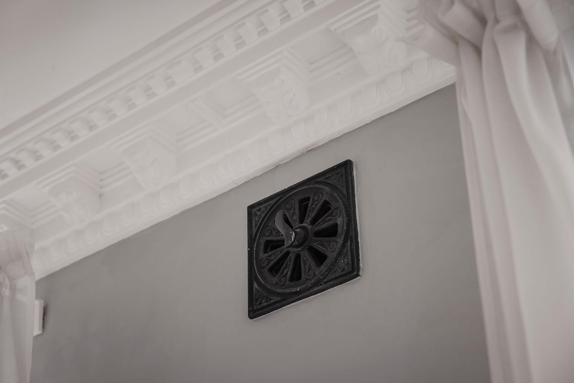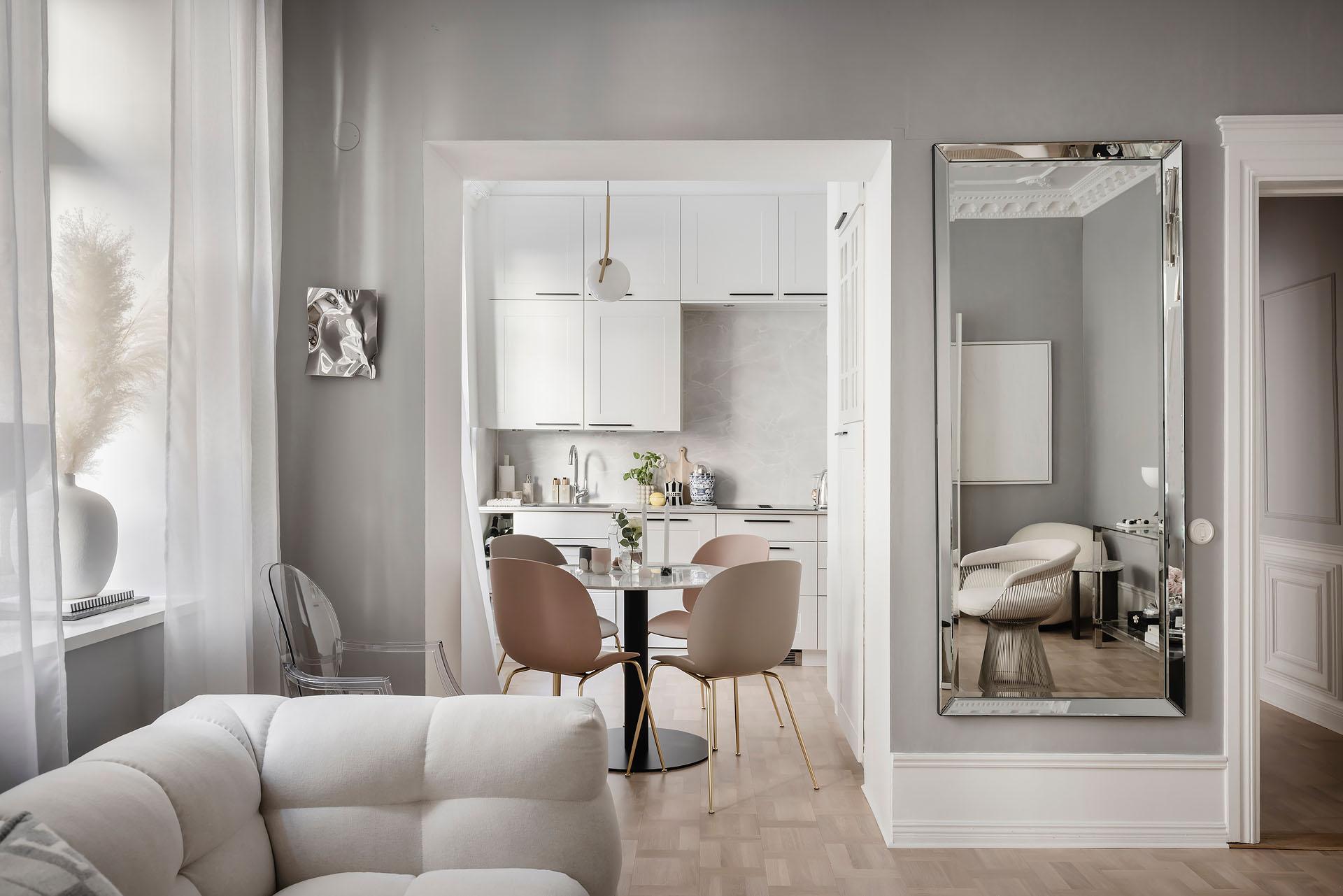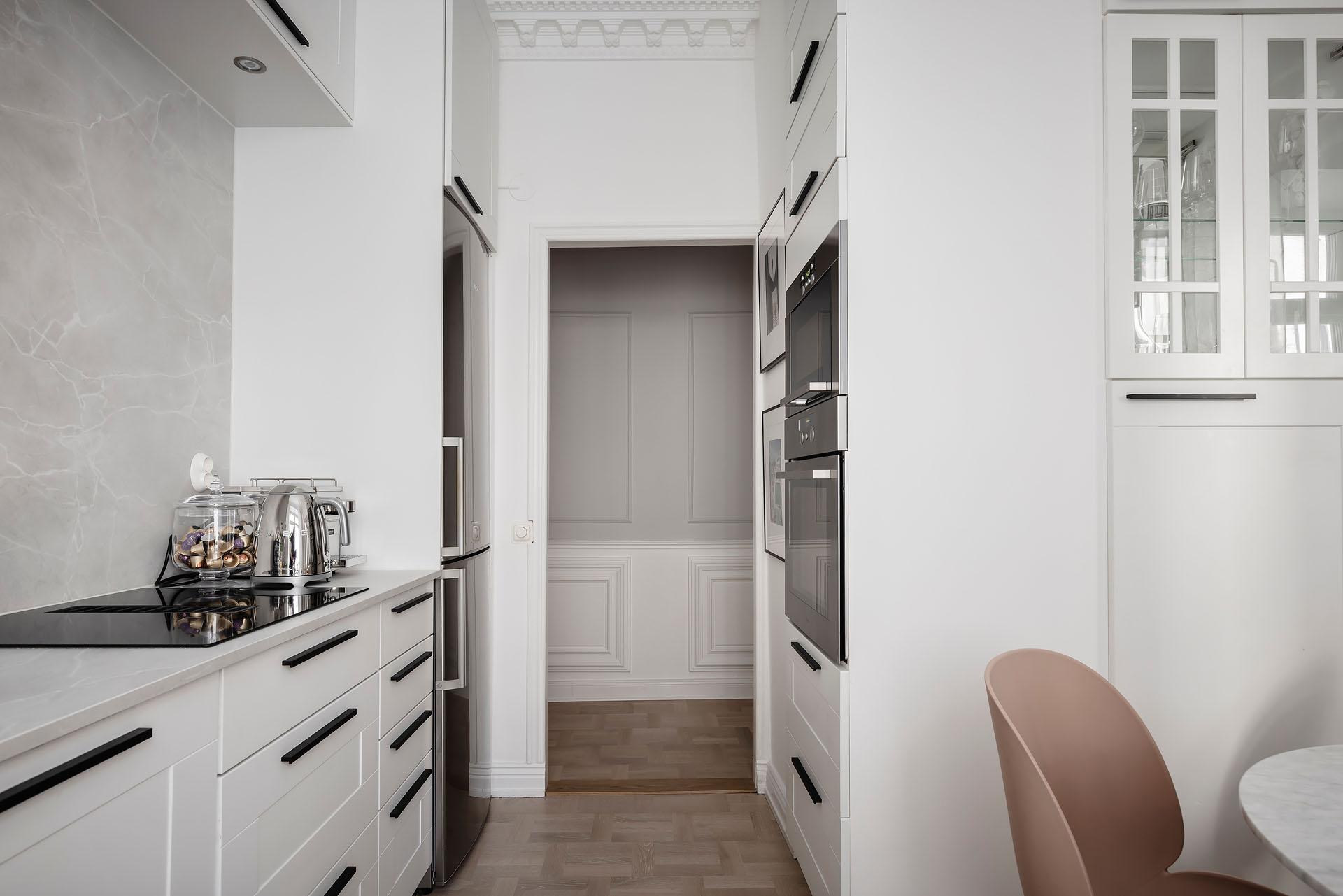Renoveringen har genomförts med stor respekt för byggåret, där nya eluttag från Eljo Renova, tidsenliga dörrhandtag från Sekelskifte samt noggrant utvalda materialval genomsyrar bostaden. Färgpaletten är harmoniskt framtagen med kulörer från Jotun och tillsammans med påkostat kvalitetsgolv ifrån Kährs skapas en enhetlig och exklusiv känsla – ett hem där historien inte bara bevarats, utan förfinats.