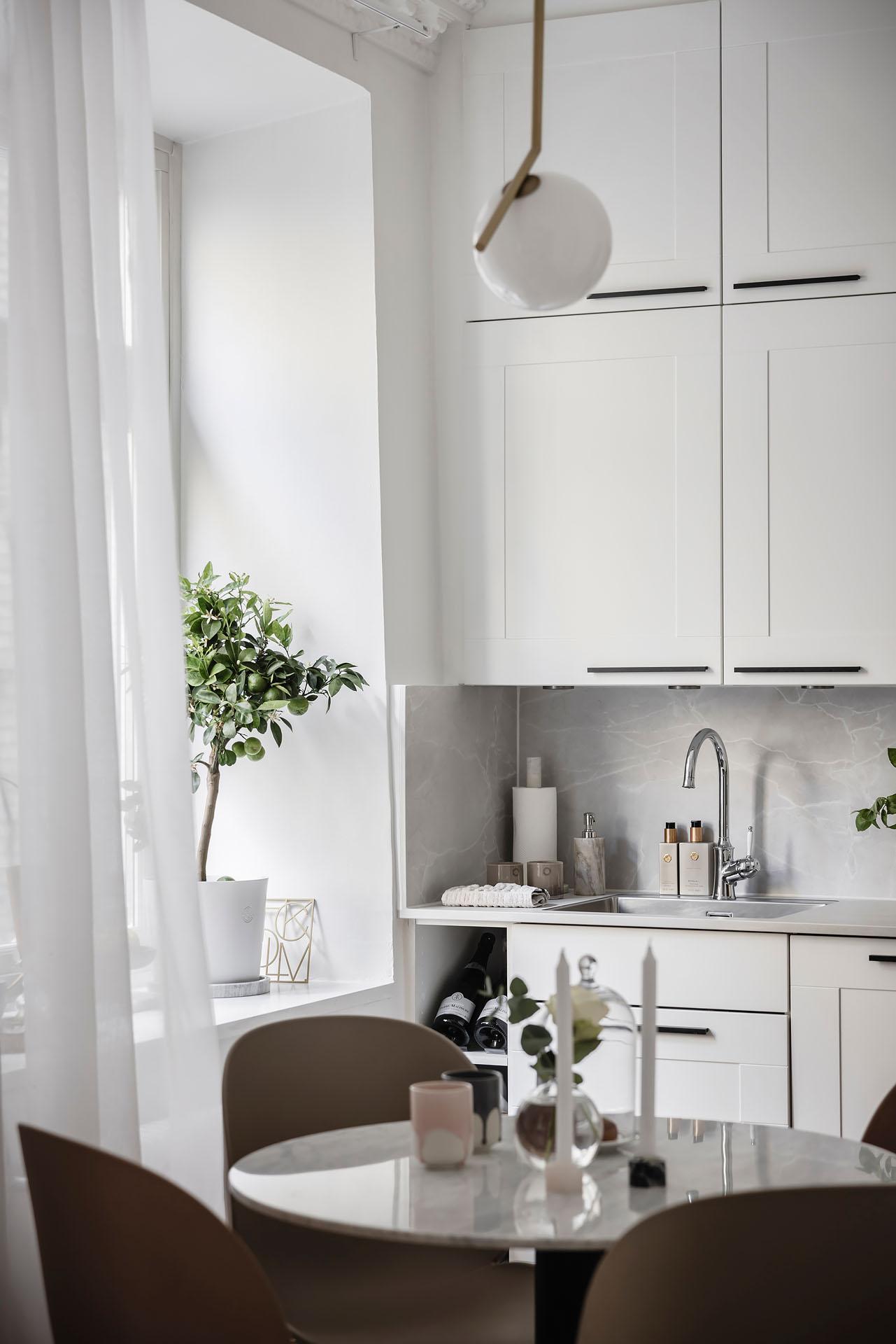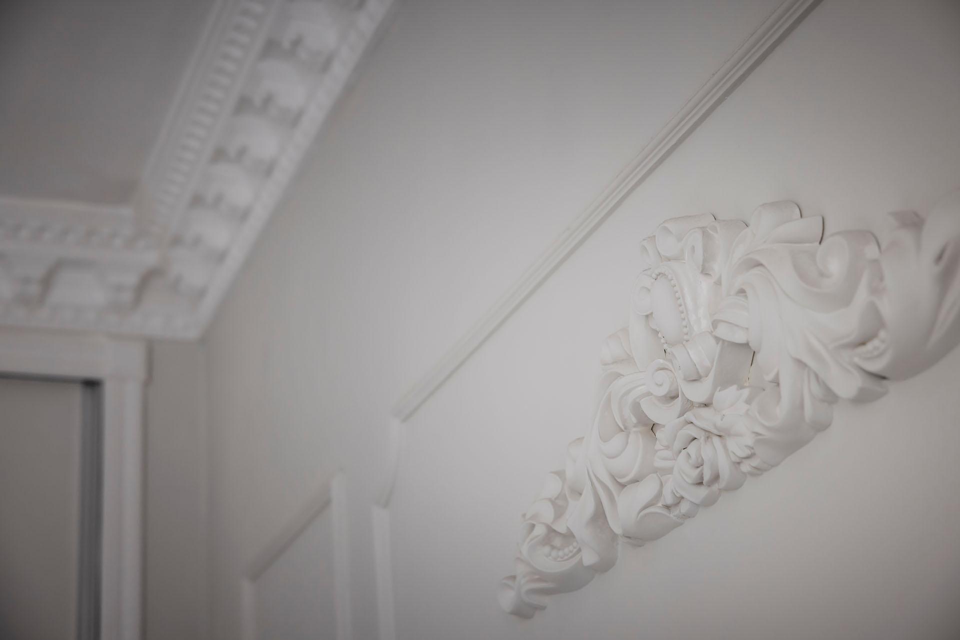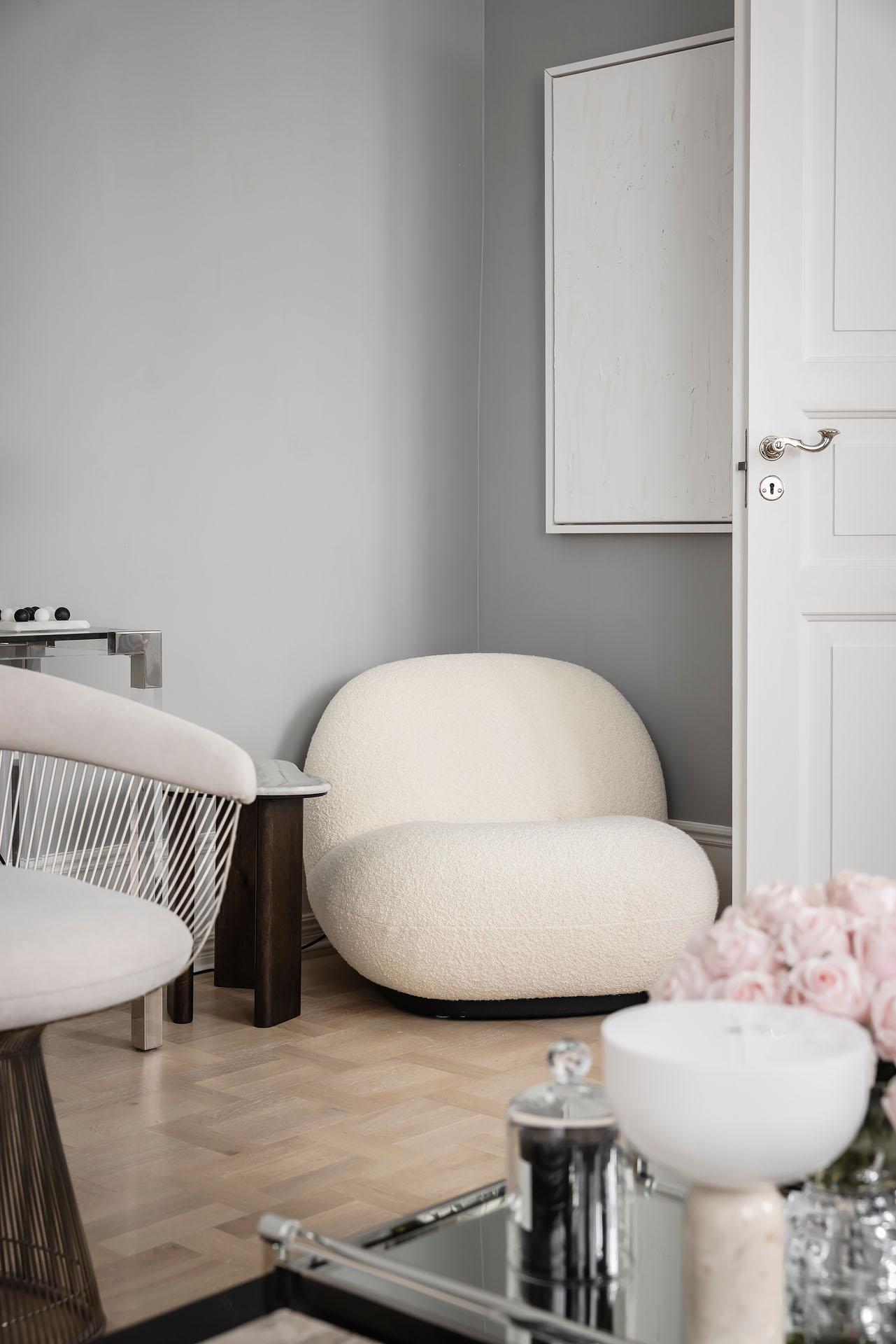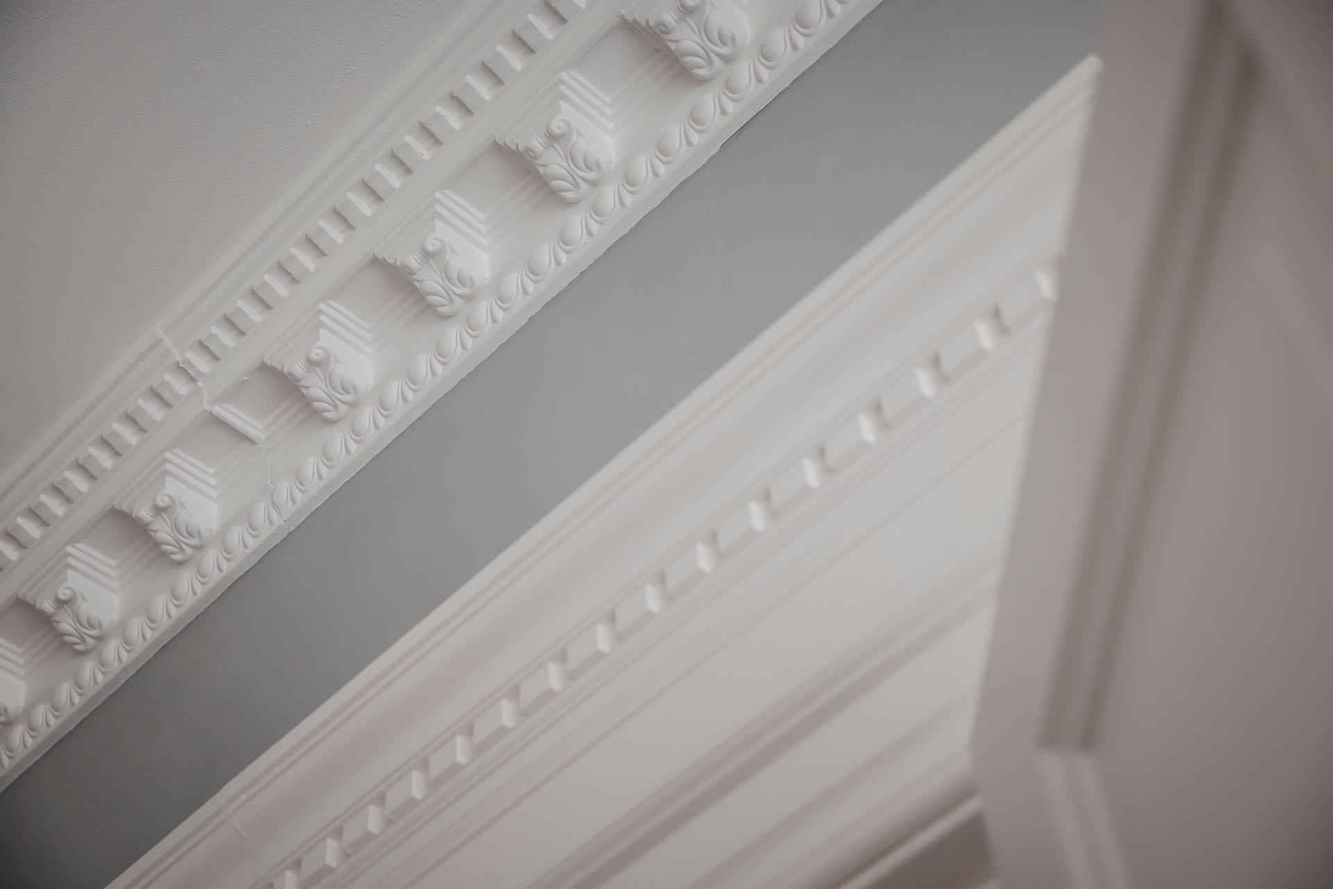 Renoveringen har genomförts med stor respekt för byggåret, där nya eluttag från Eljo Renova, tidsenliga dörrhandtag från Sekelskifte samt noggrant utvalda materialval genomsyrar bostaden. Färgpaletten är harmoniskt framtagen med kulörer från Jotun och tillsammans med påkostat kvalitetsgolv ifrån Kährs skapas en enhetlig och exklusiv känsla – ett hem där historien inte bara bevarats, utan förfinats.