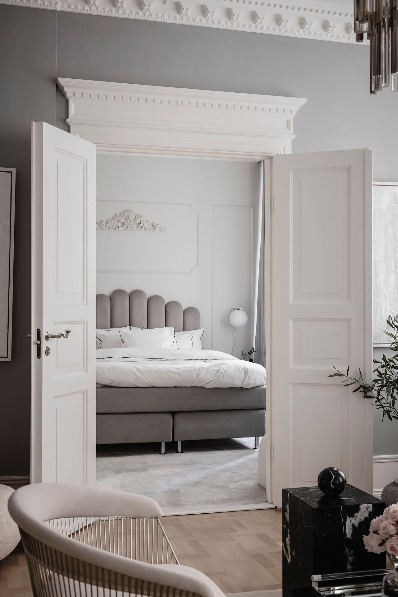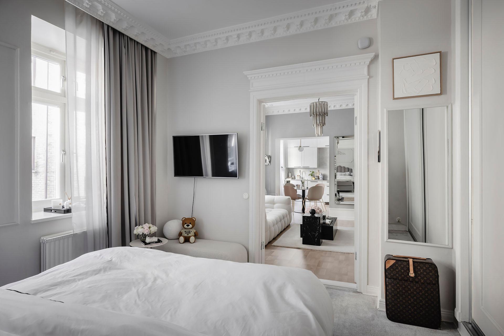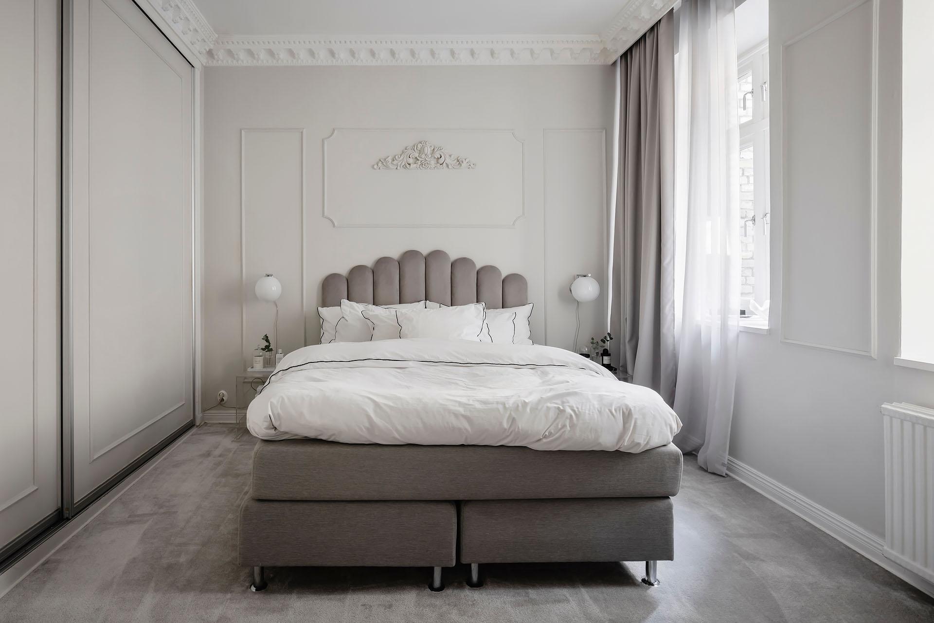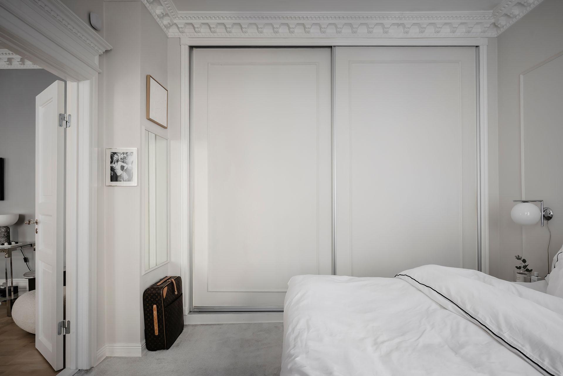 Ett rofyllt och harmoniskt sovrum beläget i fil med vardagsrummet. Den mjuka, tidlösa färgskalan tillsammans med det tysta gårdsläget skapar en avskild och avslappnande oas. Garderober med skjutdörrar erbjuder god förvaring och är utrustade med praktisk belysning. Även här återfinns vackra sekelskiftesdetaljer som, tillsammans med den grå heltäckningsmattan (brädgolv finns bevarat under), ger rummet en varm och ombonad känsla.