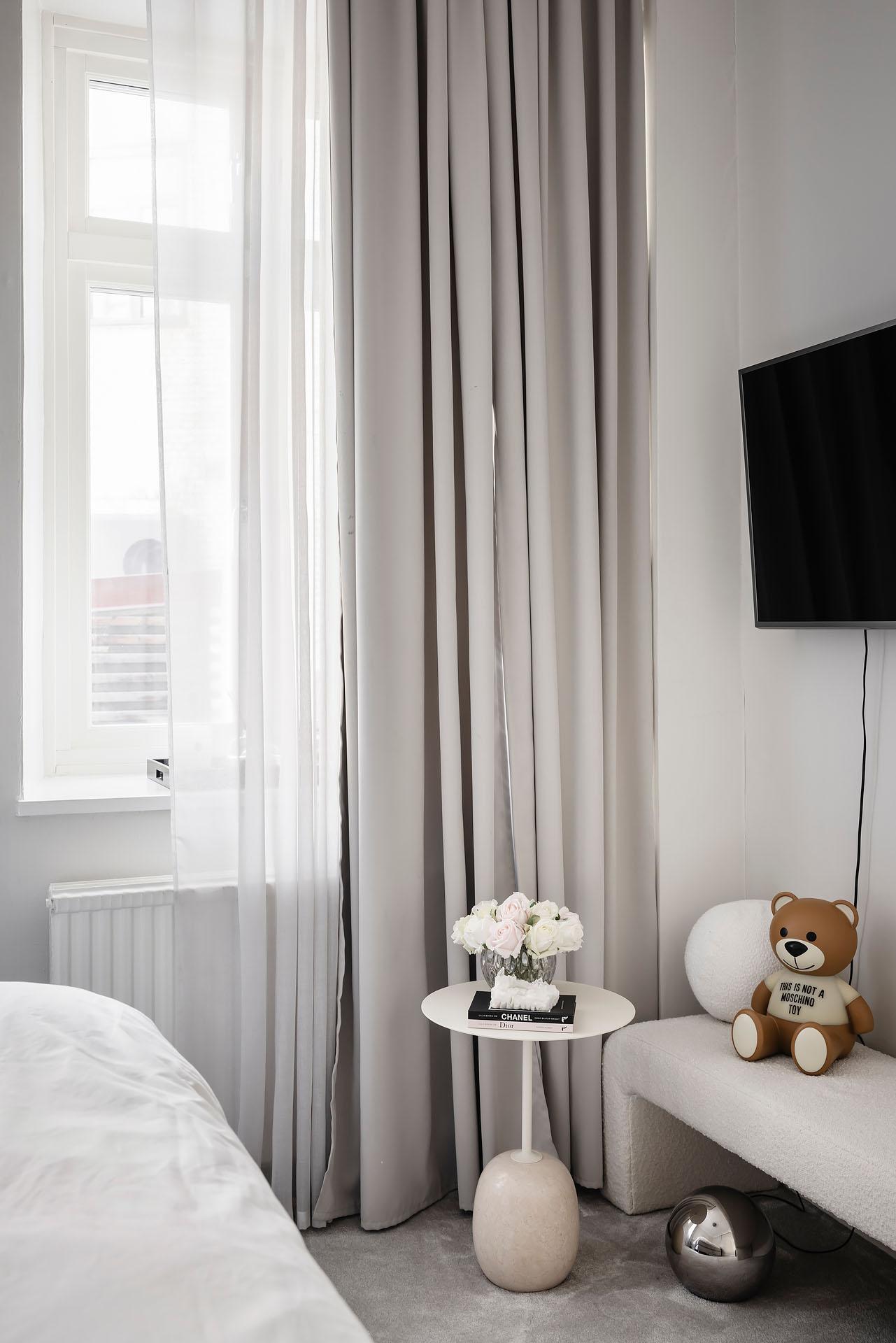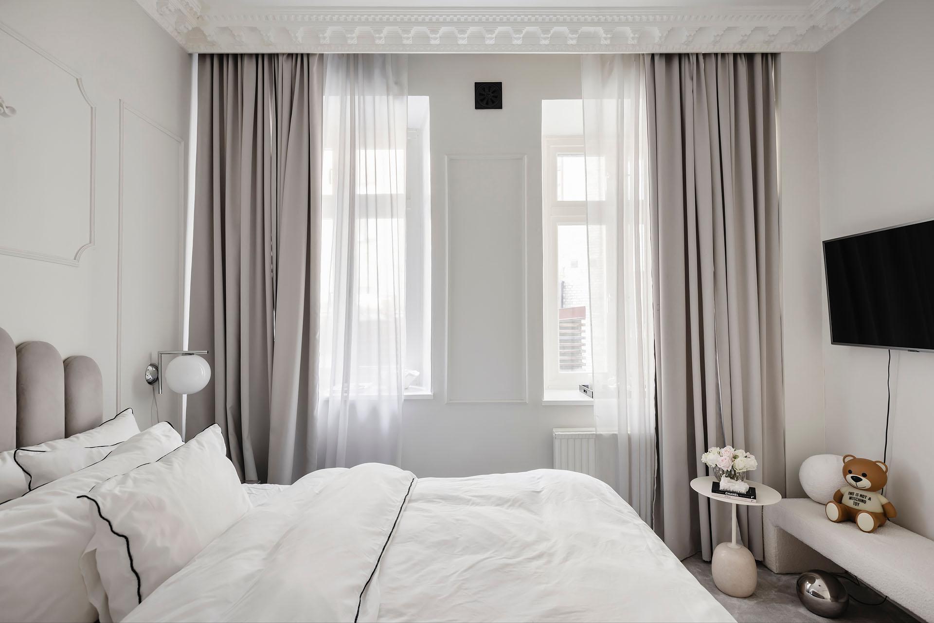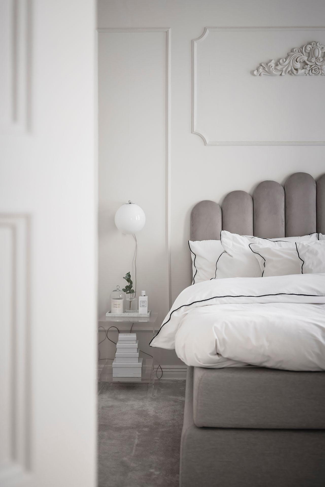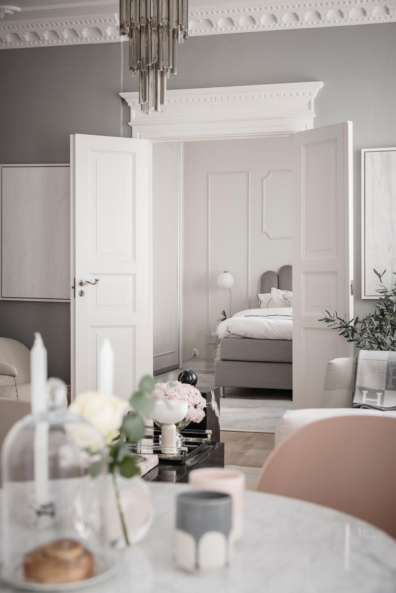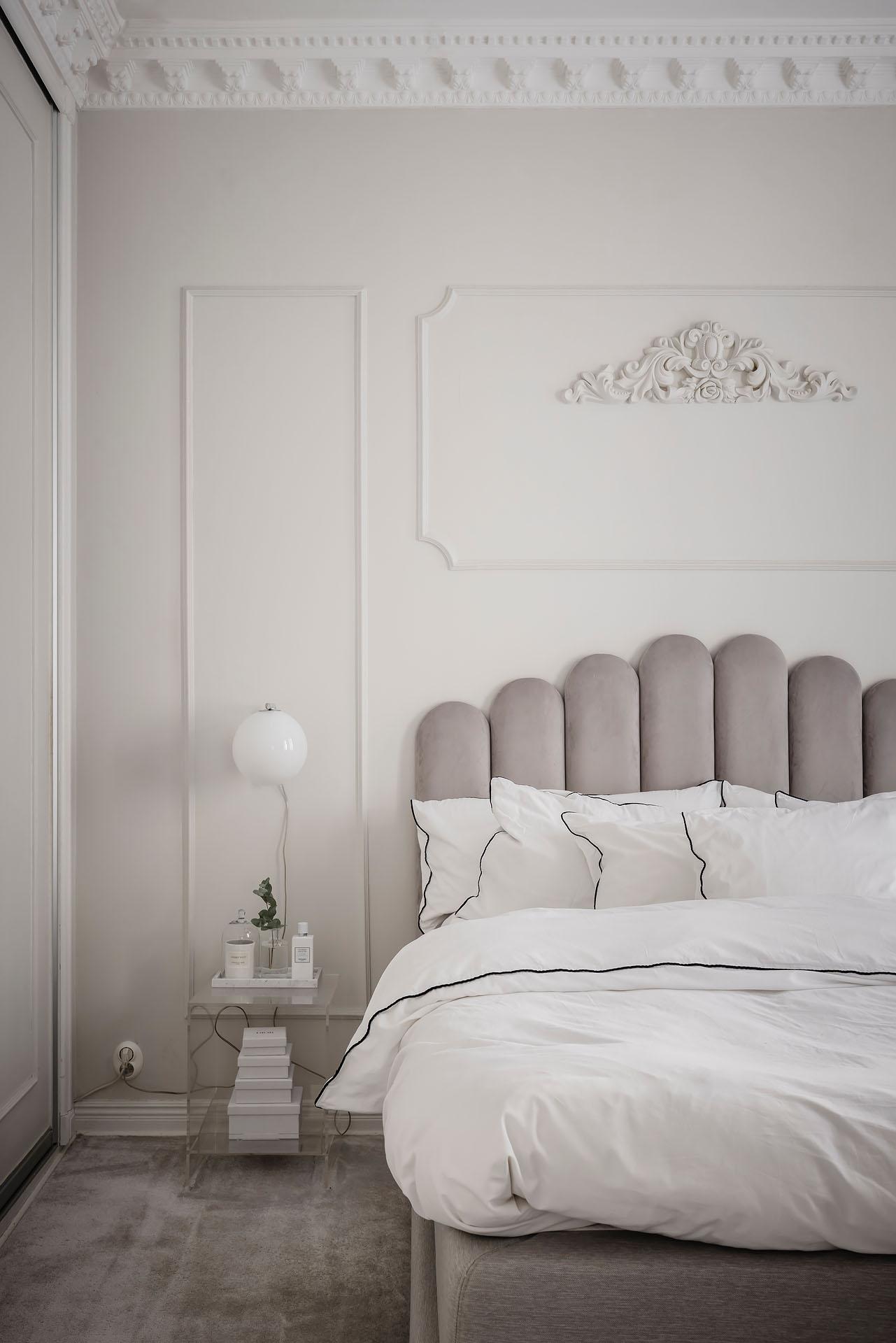 Ett rofyllt och harmoniskt sovrum beläget i fil med vardagsrummet. Den mjuka, tidlösa färgskalan tillsammans med det tysta gårdsläget skapar en avskild och avslappnande oas. Garderober med skjutdörrar erbjuder god förvaring och är utrustade med praktisk belysning. Även här återfinns vackra sekelskiftesdetaljer som, tillsammans med den grå heltäckningsmattan (brädgolv finns bevarat under), ger rummet en varm och ombonad känsla.