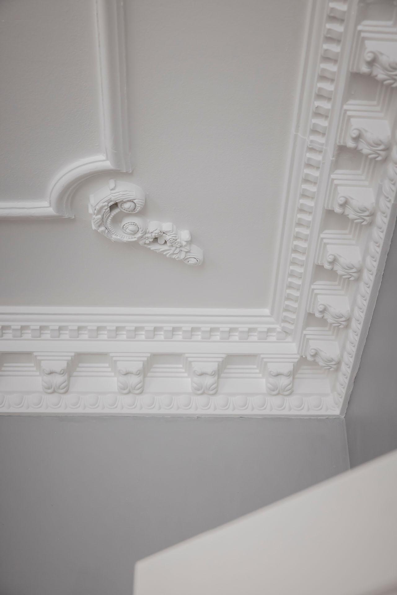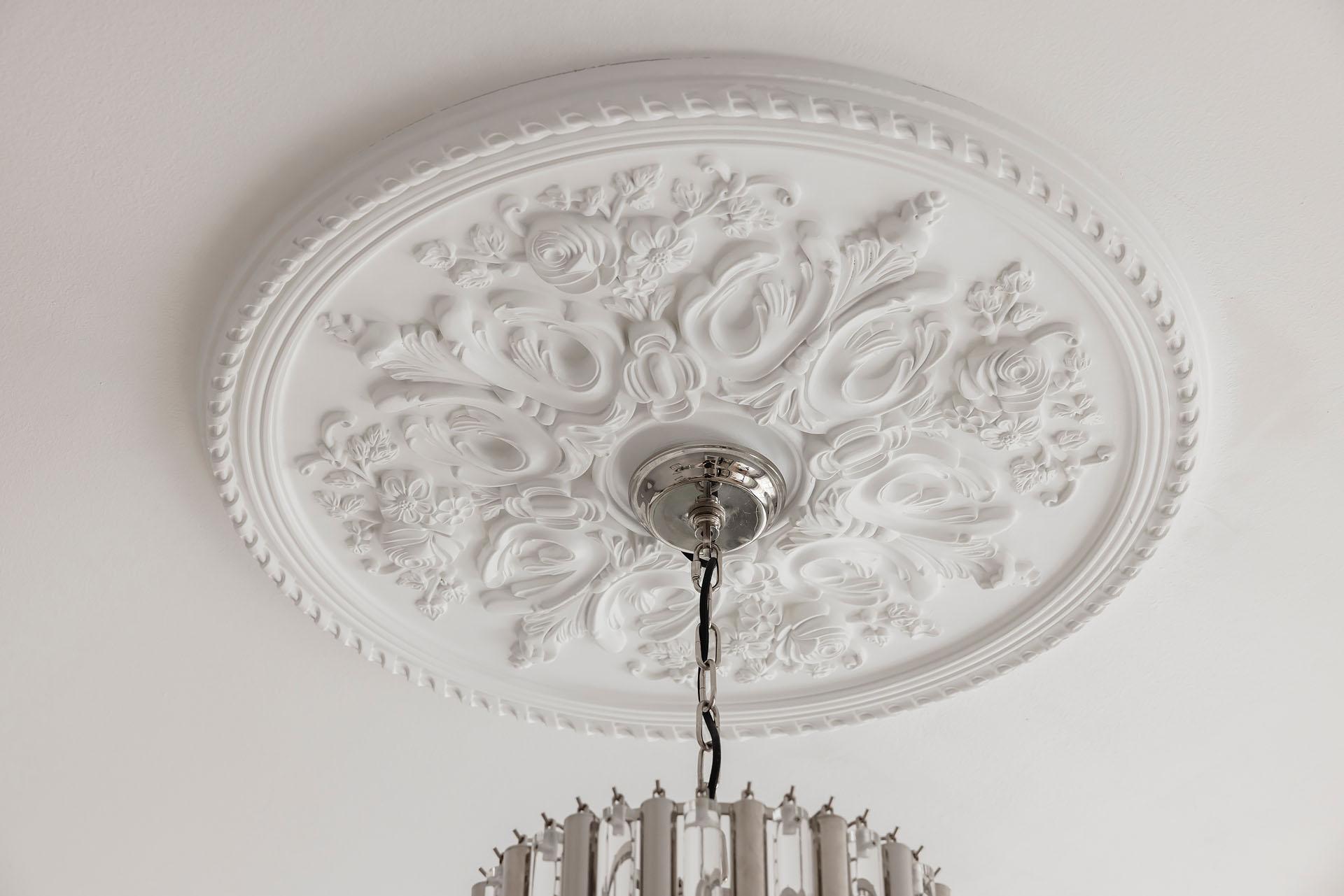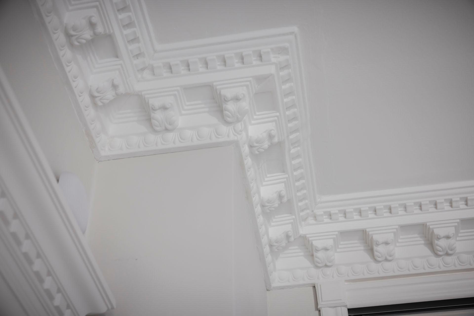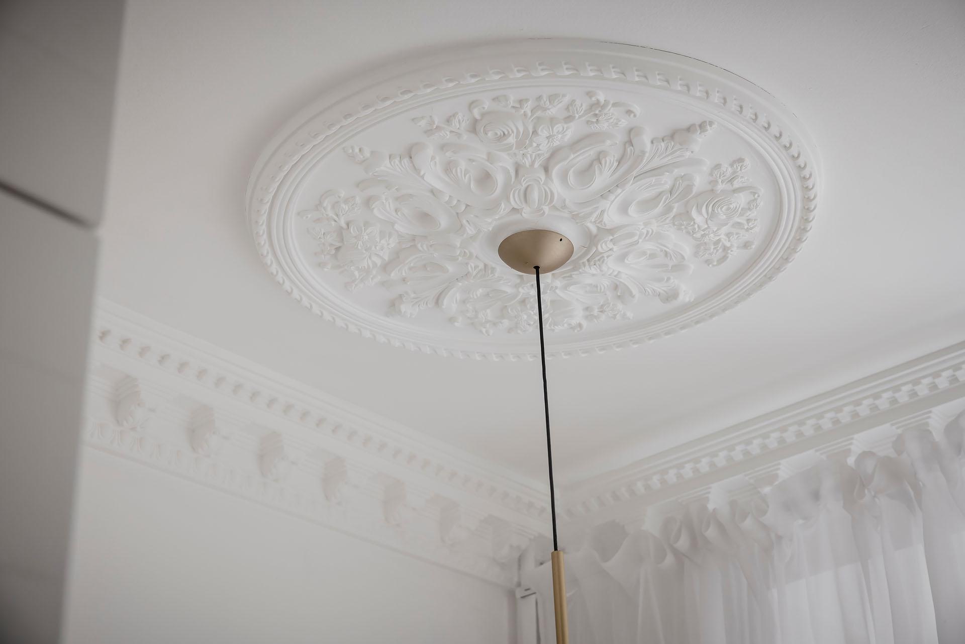 Vardagsrummet imponerar med sina sekelskiftesdetaljer – stuckatur, takrosett och höga fotlister – som tillsammans med de stora fönsterpartierna och den generösa takhöjden skapar ett rum med mycket karaktär. Här ryms enkelt både en större soffgrupp och läshörnan.