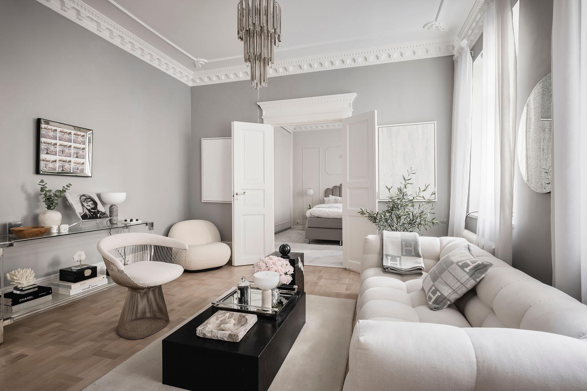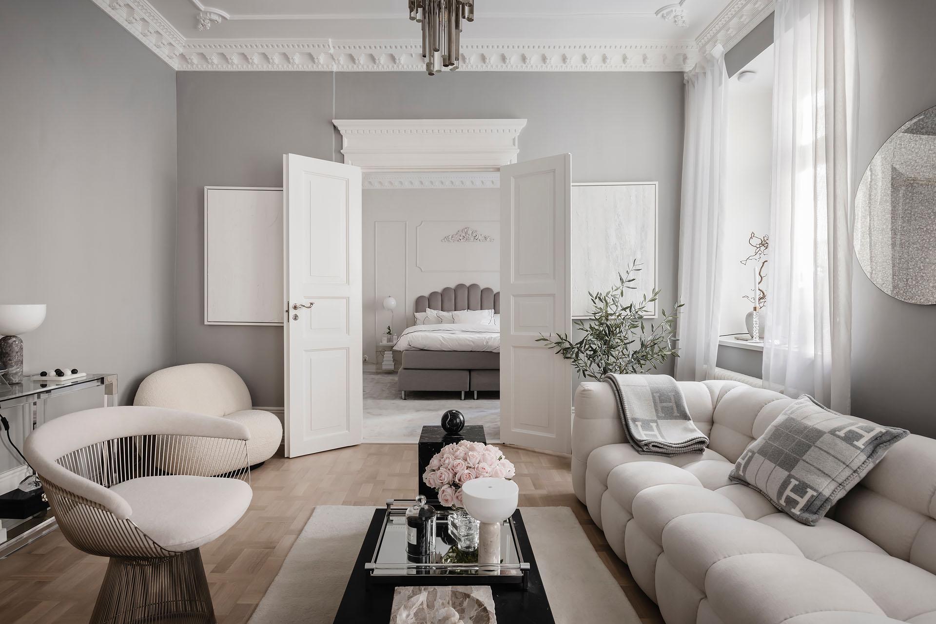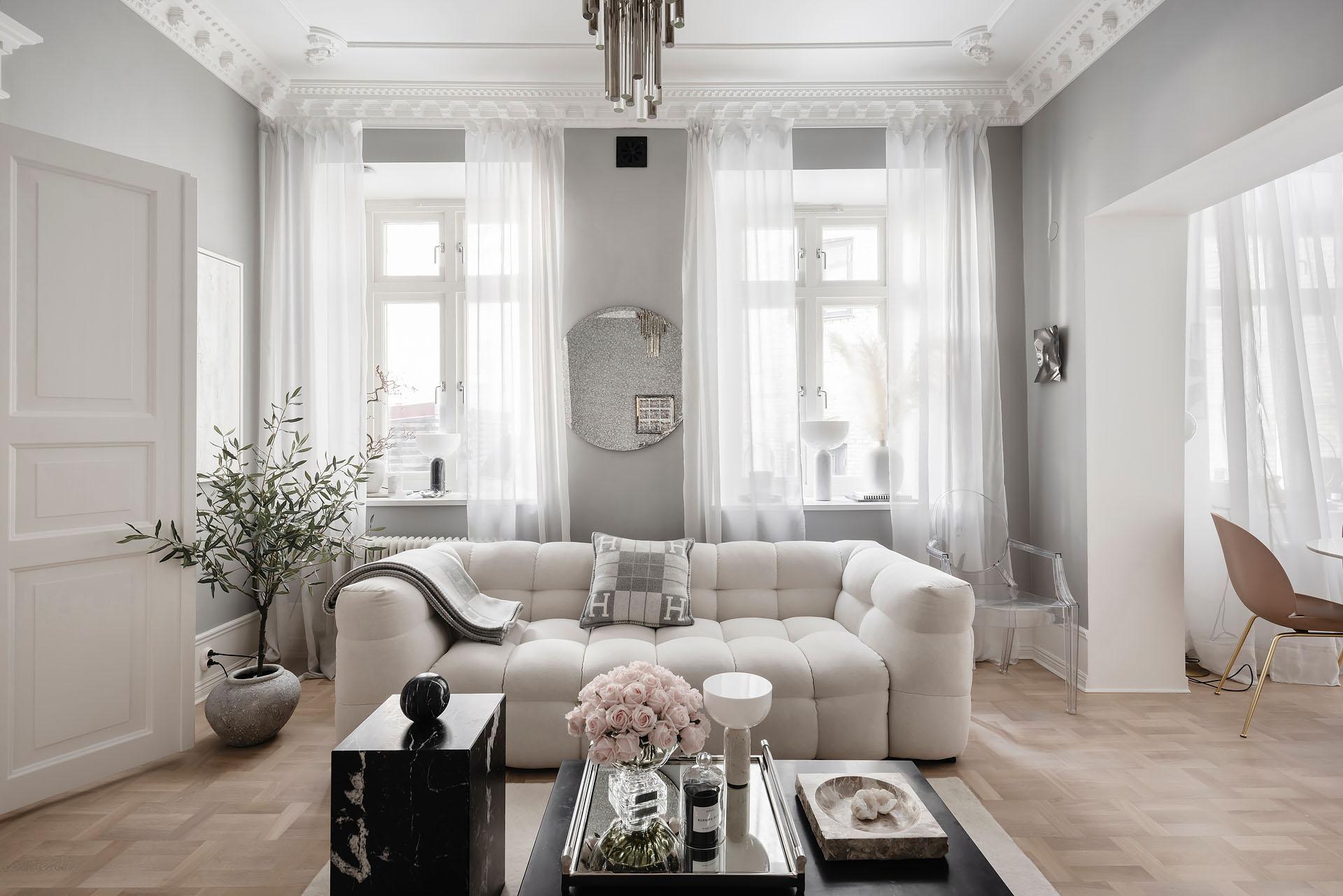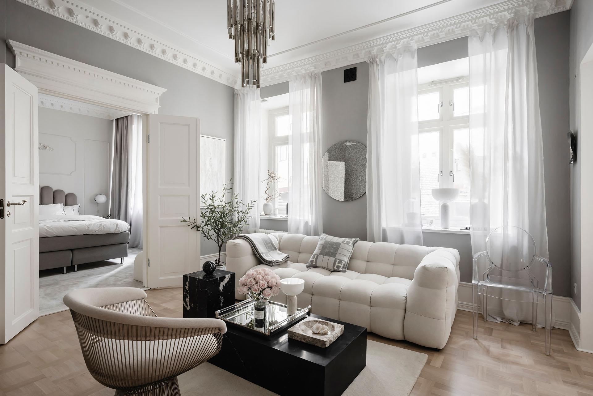 I hjärtat av Linné, med ett svårslaget läge i eftertraktade kvarter vid hörnet Linnégatan/Fjärde Långgatan, erbjuds nu en minutiöst renoverad sekelskiftestvåa där varje detalj noggrant valts för att lyfta fram bostadens ursprungliga karaktär. Här bor du med ett stenkast till Haga, omgiven av mysiga caféer och med en Michelinkrog vägg i vägg – samtidigt som bostaden erbjuder ett knäpptyst gårdsläge. Här samspelar tidstypiska attribut med moderna inslag i en sällsynt harmonisk helhet. Generös takhöjd om dryga tre meter, vackra stuckaturer, takrosetter och stora fönster skapar en luftig och elegant atmosfär. Den öppna planlösningen mellan kök och vardagsrum förstärker rymden ytterligare och ger ett hem som både är representativt och inbjudande.