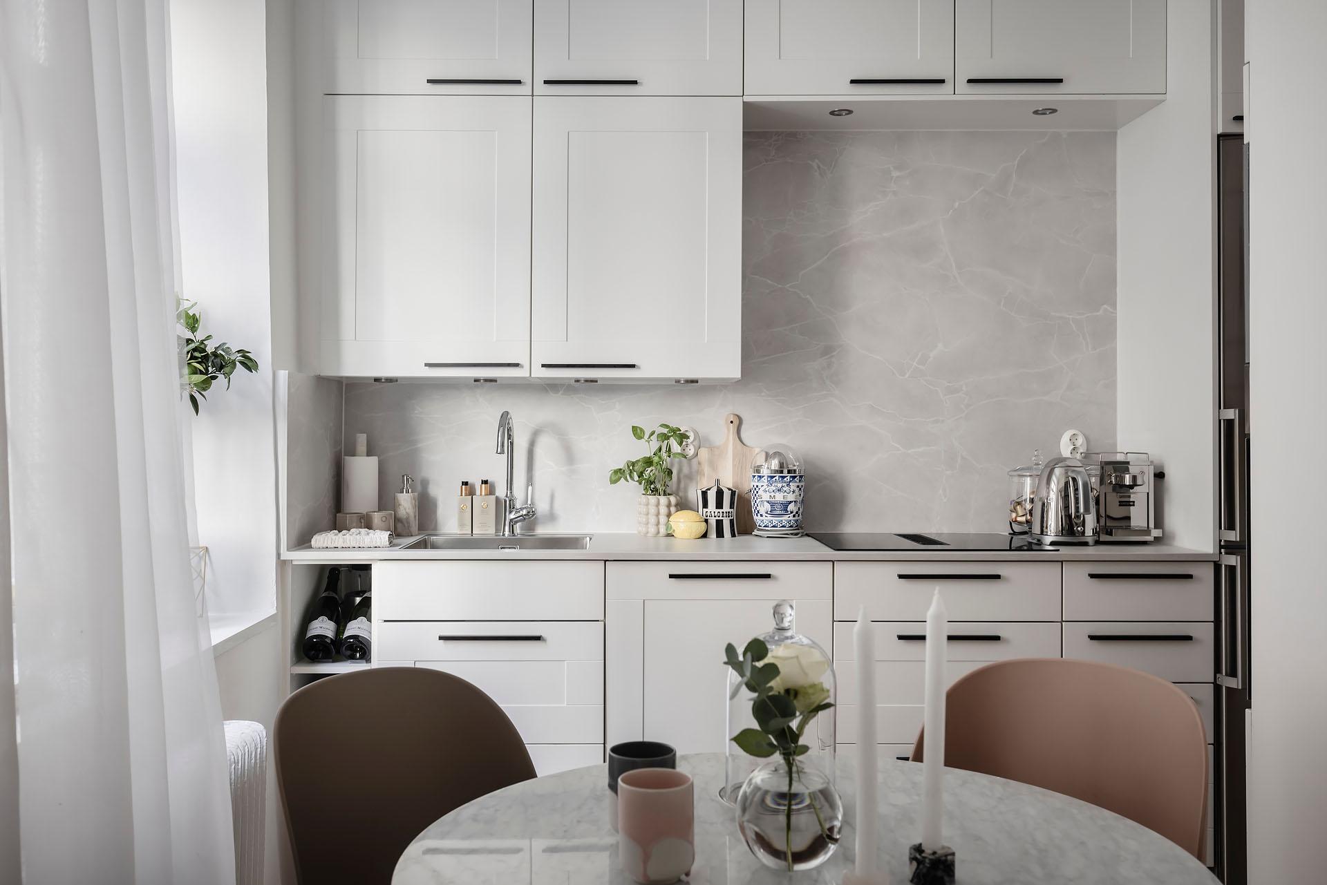Bostadens hjärta – ett öppet och socialt rum där kök och vardagsrum samspelar på ett naturligt sätt. Här skapas en självklar plats för både vardagsliv och umgänge. Köket erbjuder generös förvaring med skåp hela vägen upp till tak, uppdaterade beslag och stilrena materialval samt en påkostad bänkskiva från Marbodal. Arbetsytorna är väl tilltagna och matplatsen blir en naturlig samlingspunkt.