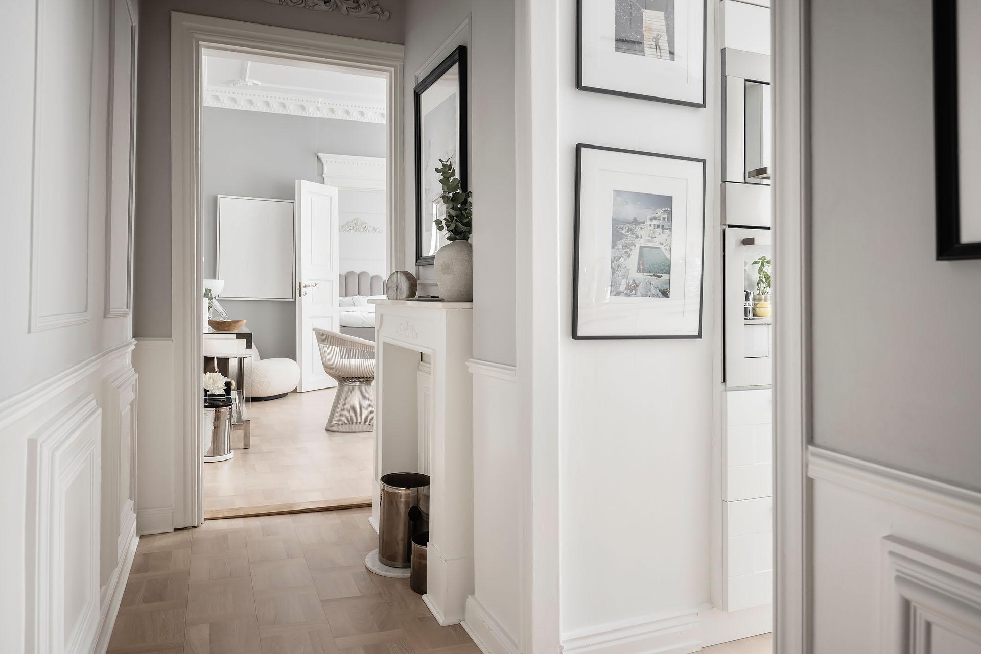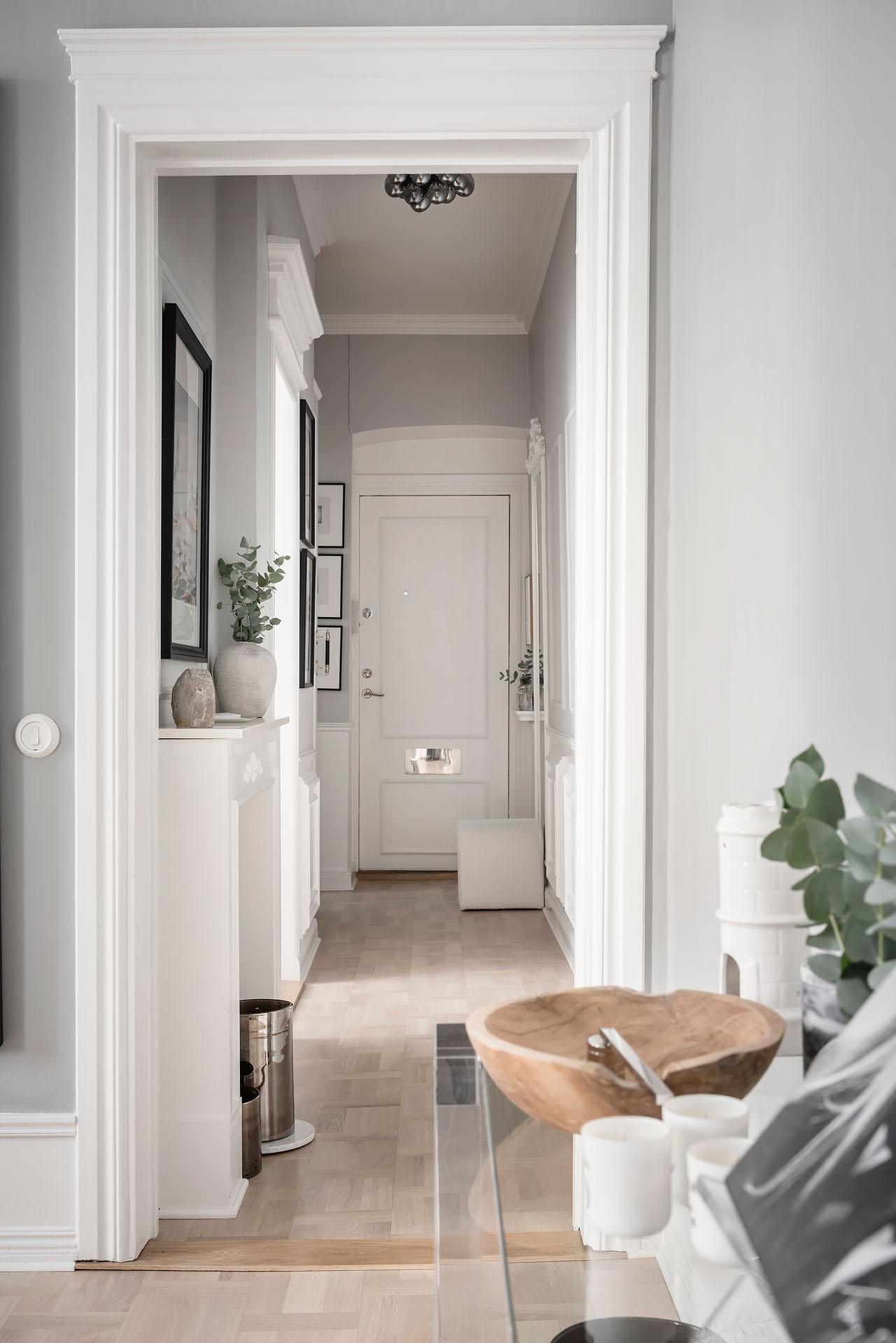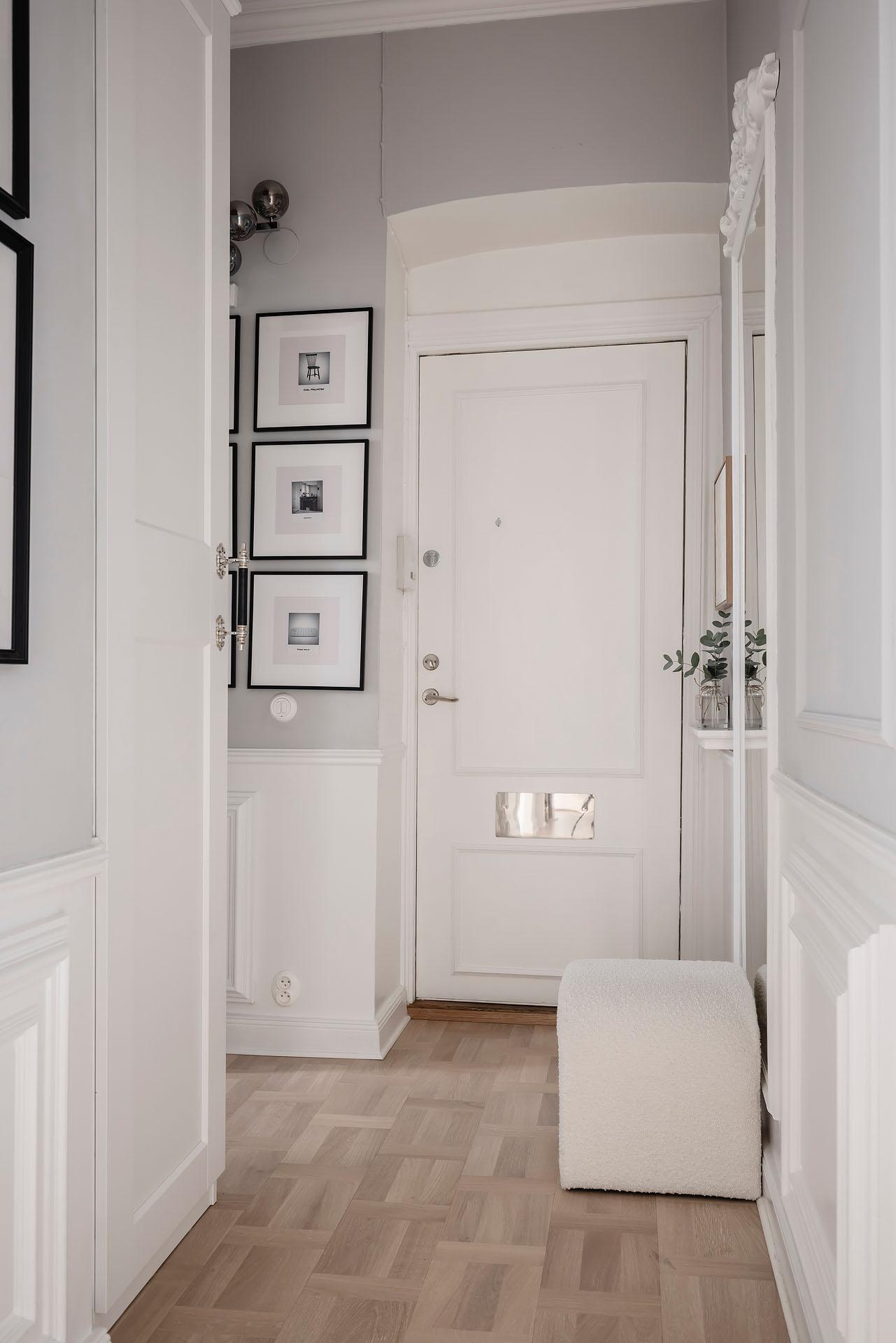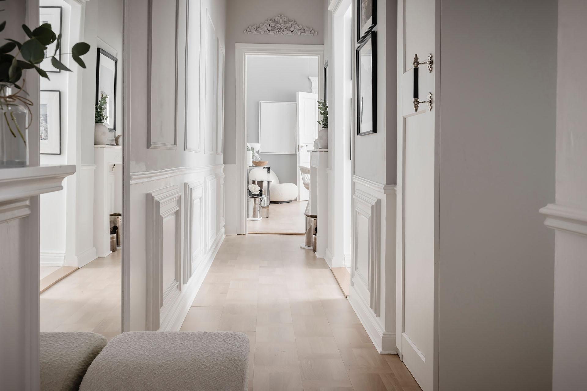 Ett vackert trapphus med patinerade trappsteg leder fram till bostaden och sätter tonen direkt. Hallen välkomnar med ljus, rymd och vackra golv som ger en genuin känsla. Här finns en platsbyggd garderob och spegel som erbjuder både funktion och stilren förvaring.