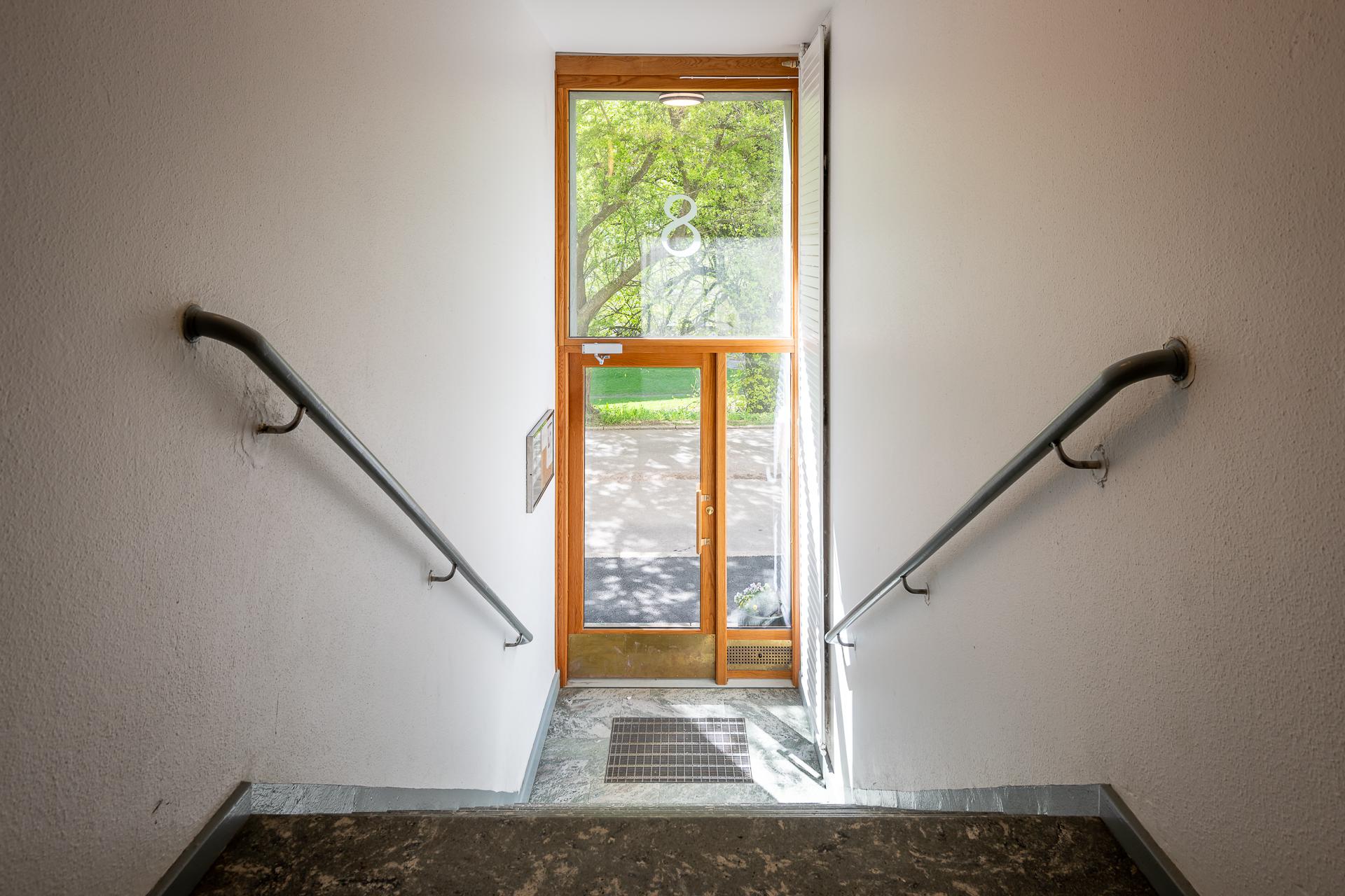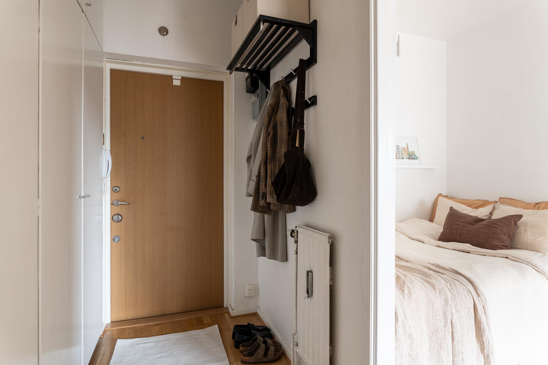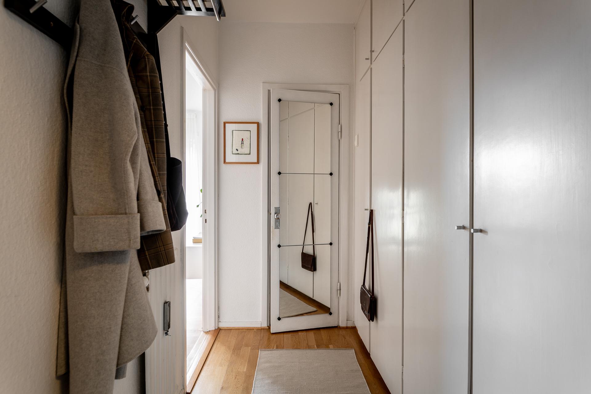 Mycket av den tidstypiska karaktären har varsamt bevarats i den välkomnande entrén, härifrån når vi föreningens gym, hobbyrum samt tvättstuga. Ta hissen eller trapporna upp till våning tre, och kliv in genom säkerhetsdörren. I hallen erbjuds mycket goda förvarings- och avhängningsmöjligheter i flertalet garderober samt hatthylla. Väggarna är vita och på golvet ligger parkett.