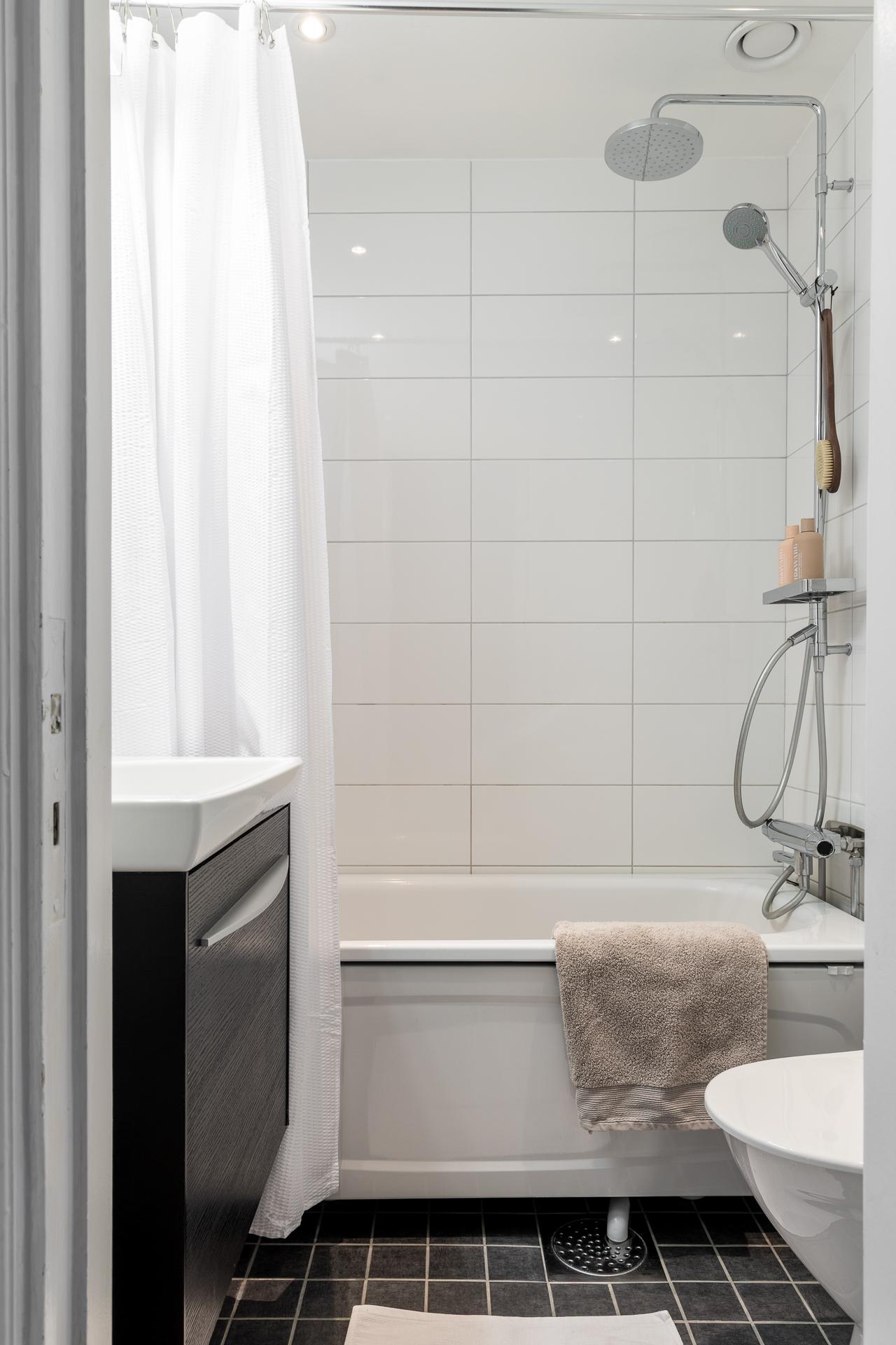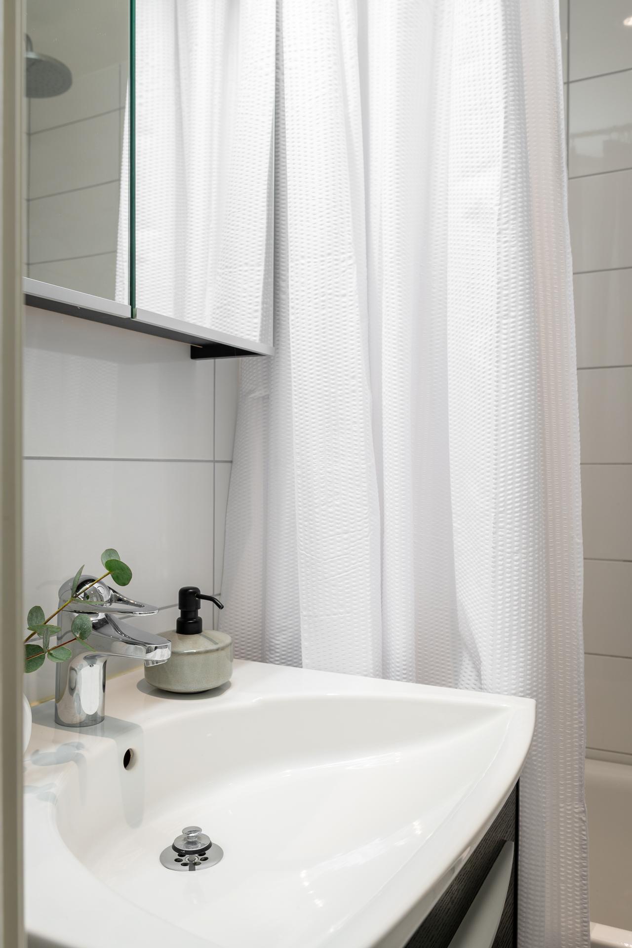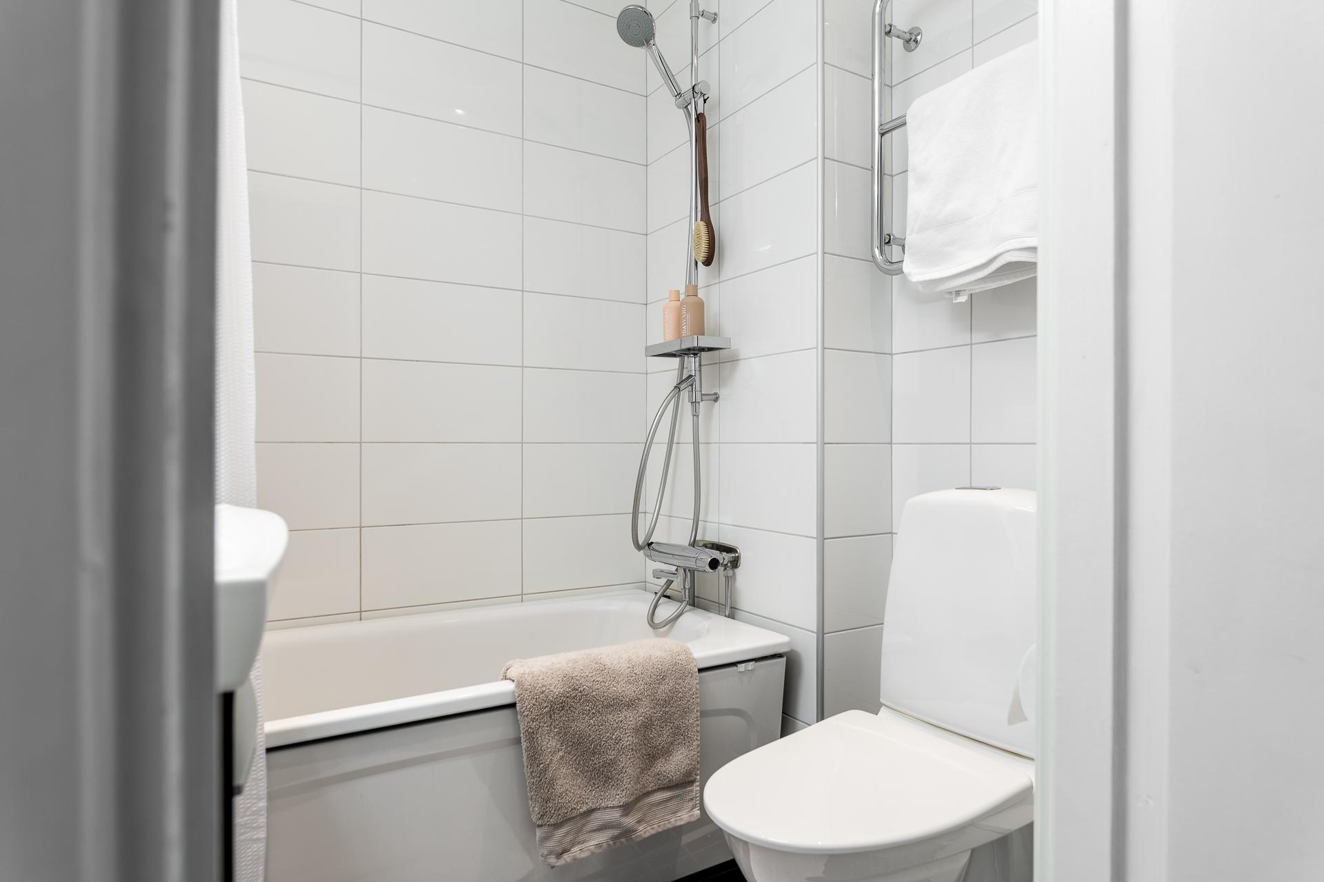 Från hallen når man lägenhetens badrum som inrymmer badkar, handfat med kommod, spegel, handdukstork samt toalett. Golvet är belagt med en grå klinker och väggarna är helkaklade i vitt.