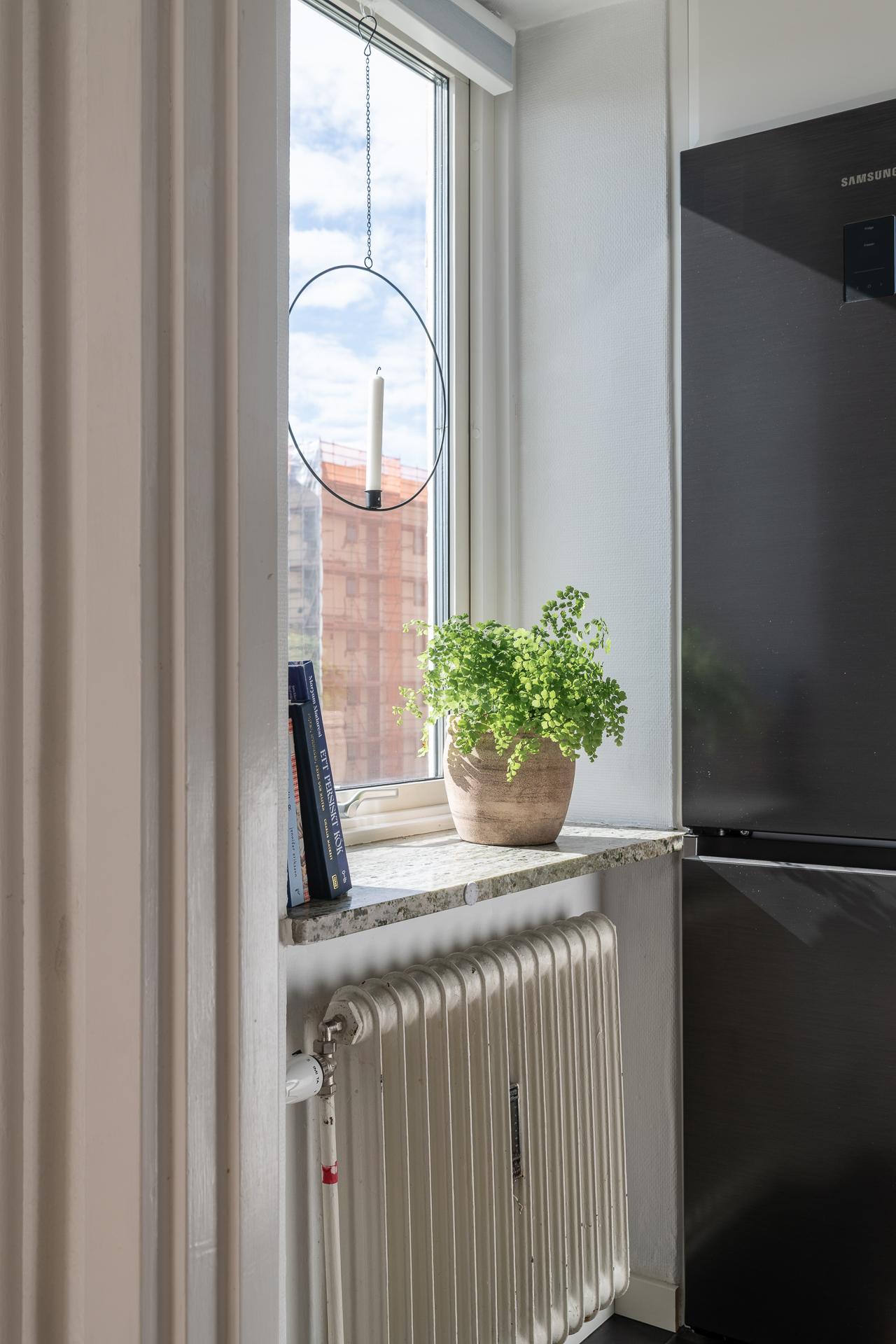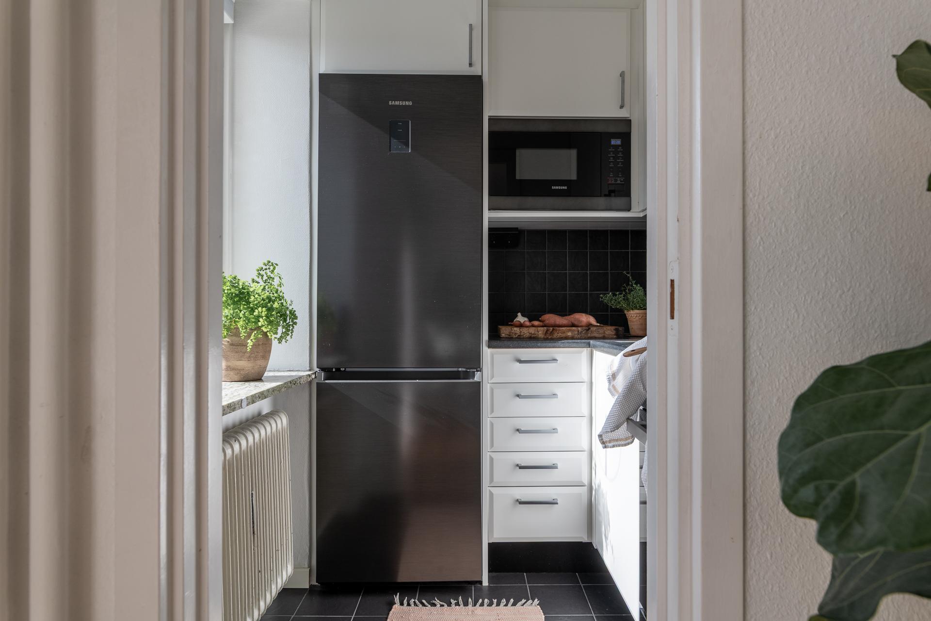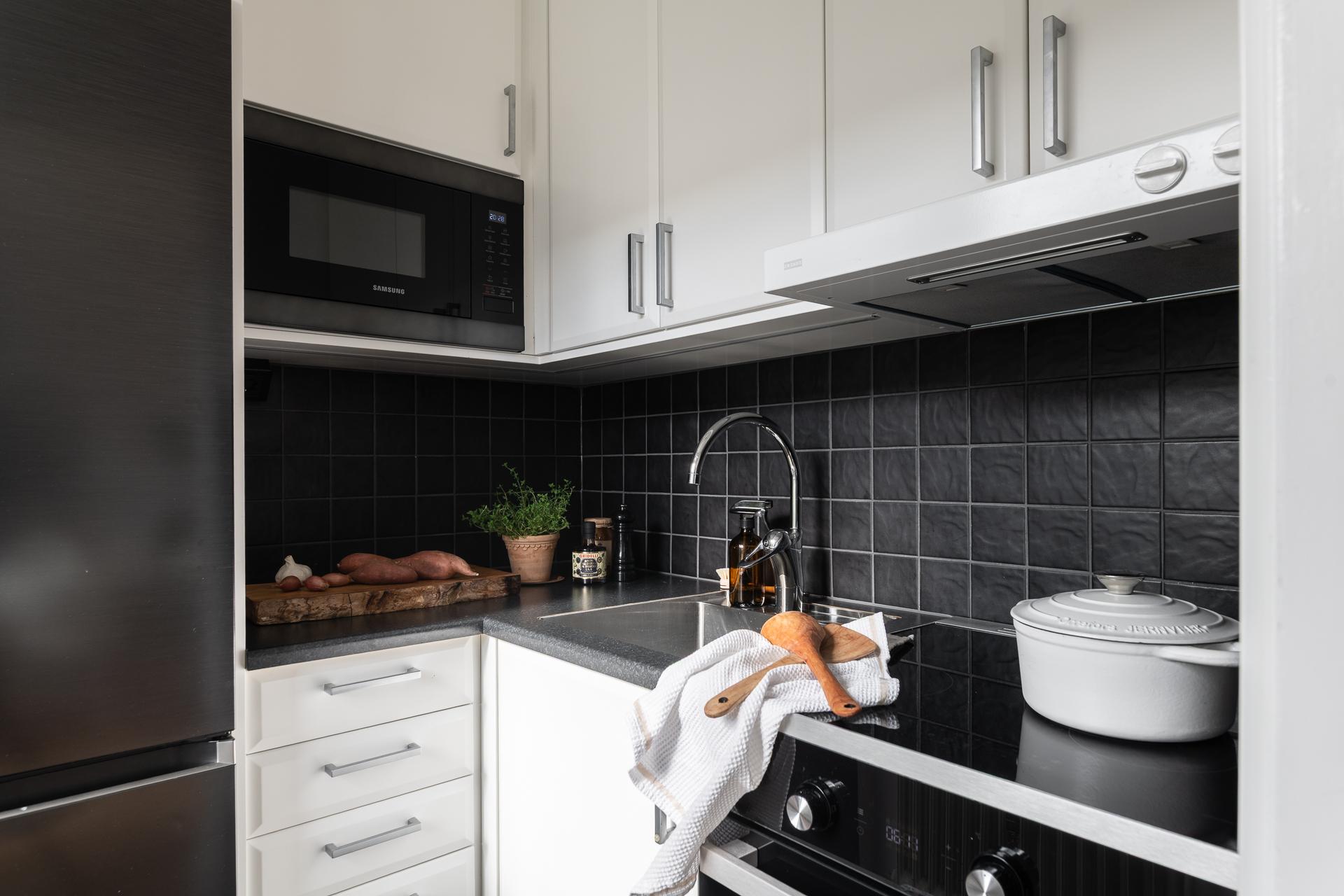 Litet men mycket kvadratsmart, kökets vinkel skapar ett lättarbetat och ett mycket praktiskt kök. Kombinationen av både över- och underskåp ger gott om plats för kökets alla attiraljer och pryttlar, allt man gärna har hemma, men inte gärna har framme. Det stora fönstret med den vackra fönsterbrädan i sten från byggåret släpper in ljuset från väster och bjuder på fantastisk utsikt. Den maskinella utrustningen består av kyl, frys, spis, mikro samt fläkt.