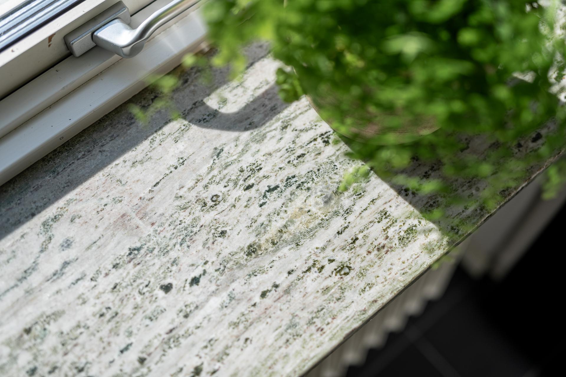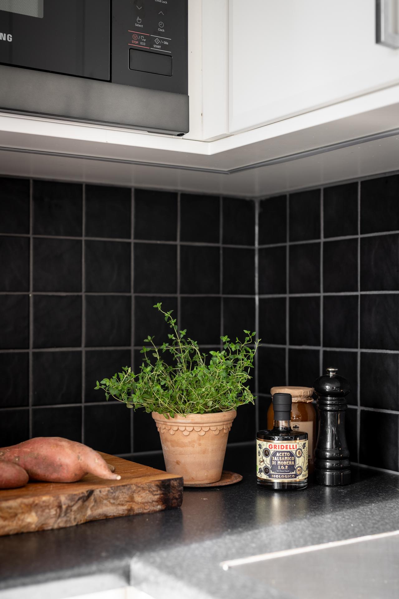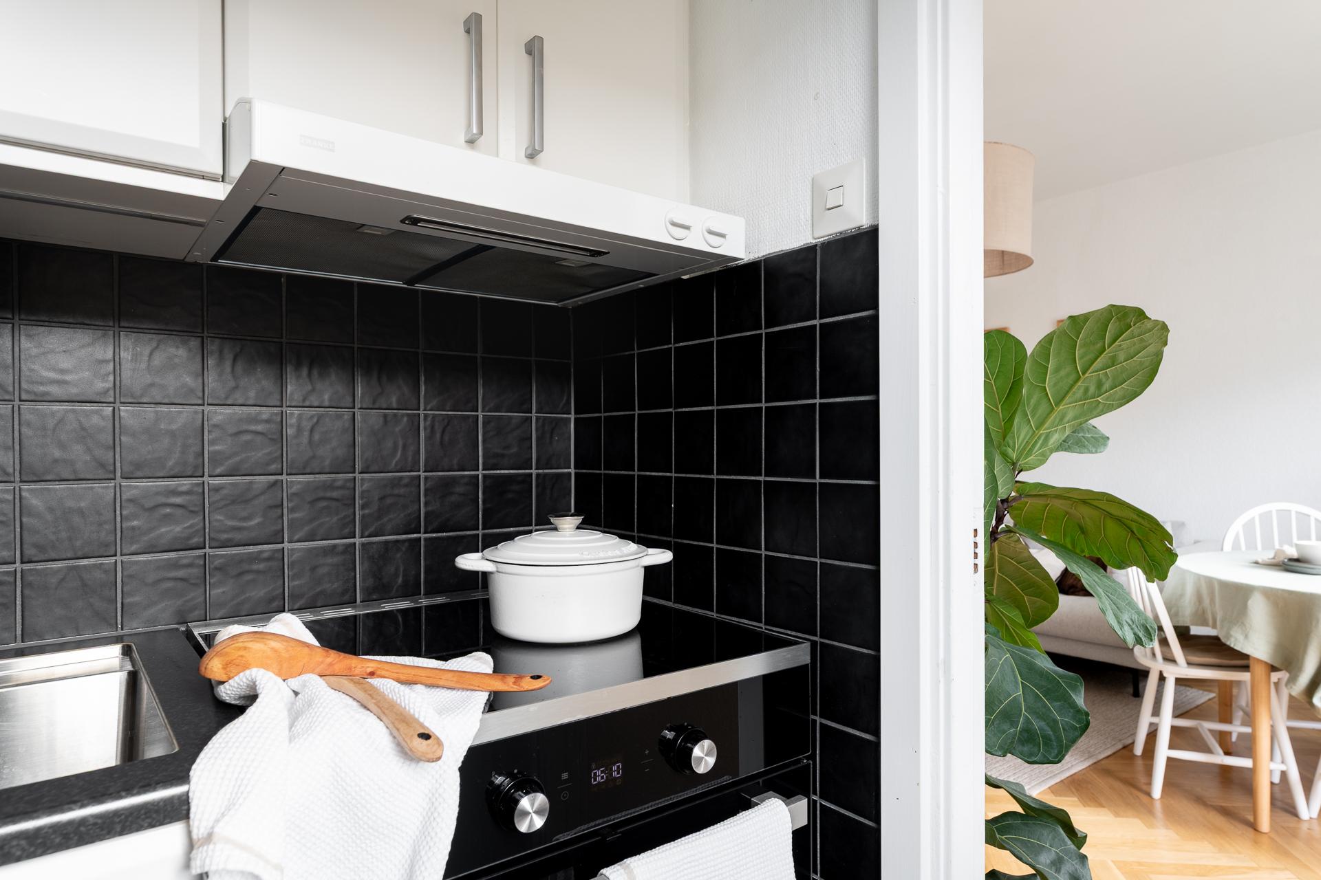 Litet men mycket kvadratsmart, kökets vinkel skapar ett lättarbetat och ett mycket praktiskt kök. Kombinationen av både över- och underskåp ger gott om plats för kökets alla attiraljer och pryttlar, allt man gärna har hemma, men inte gärna har framme. Det stora fönstret med den vackra fönsterbrädan i sten från byggåret släpper in ljuset från väster och bjuder på fantastisk utsikt. Den maskinella utrustningen består av kyl, frys, spis, mikro samt fläkt.
