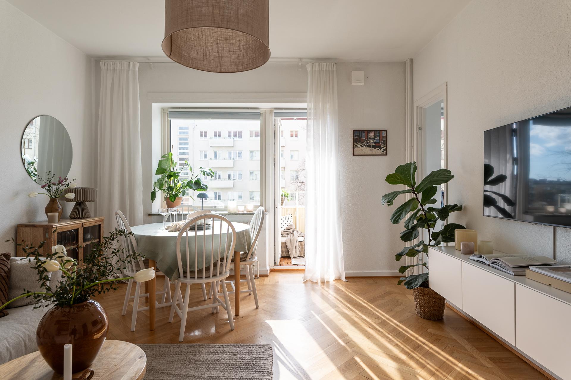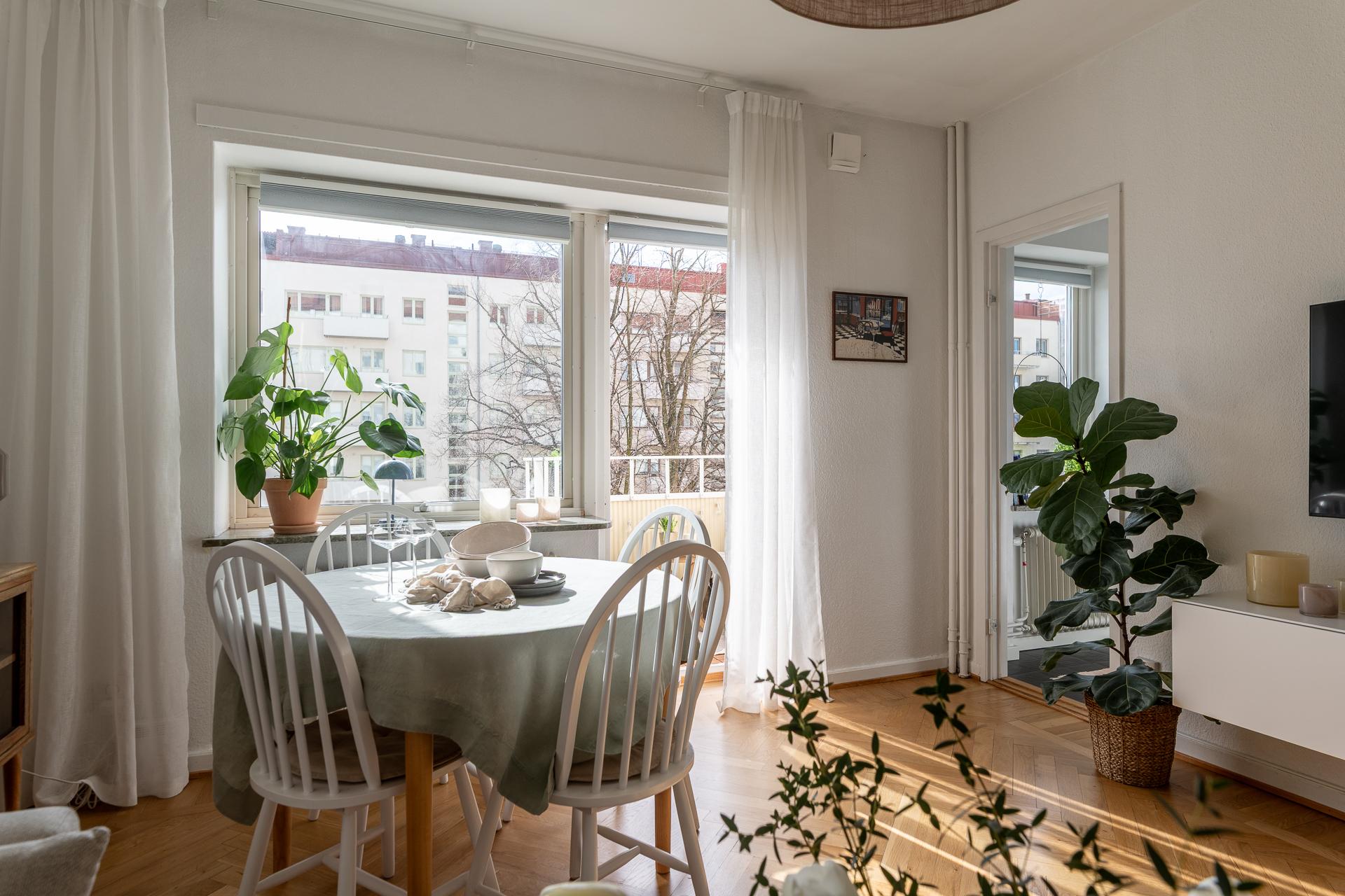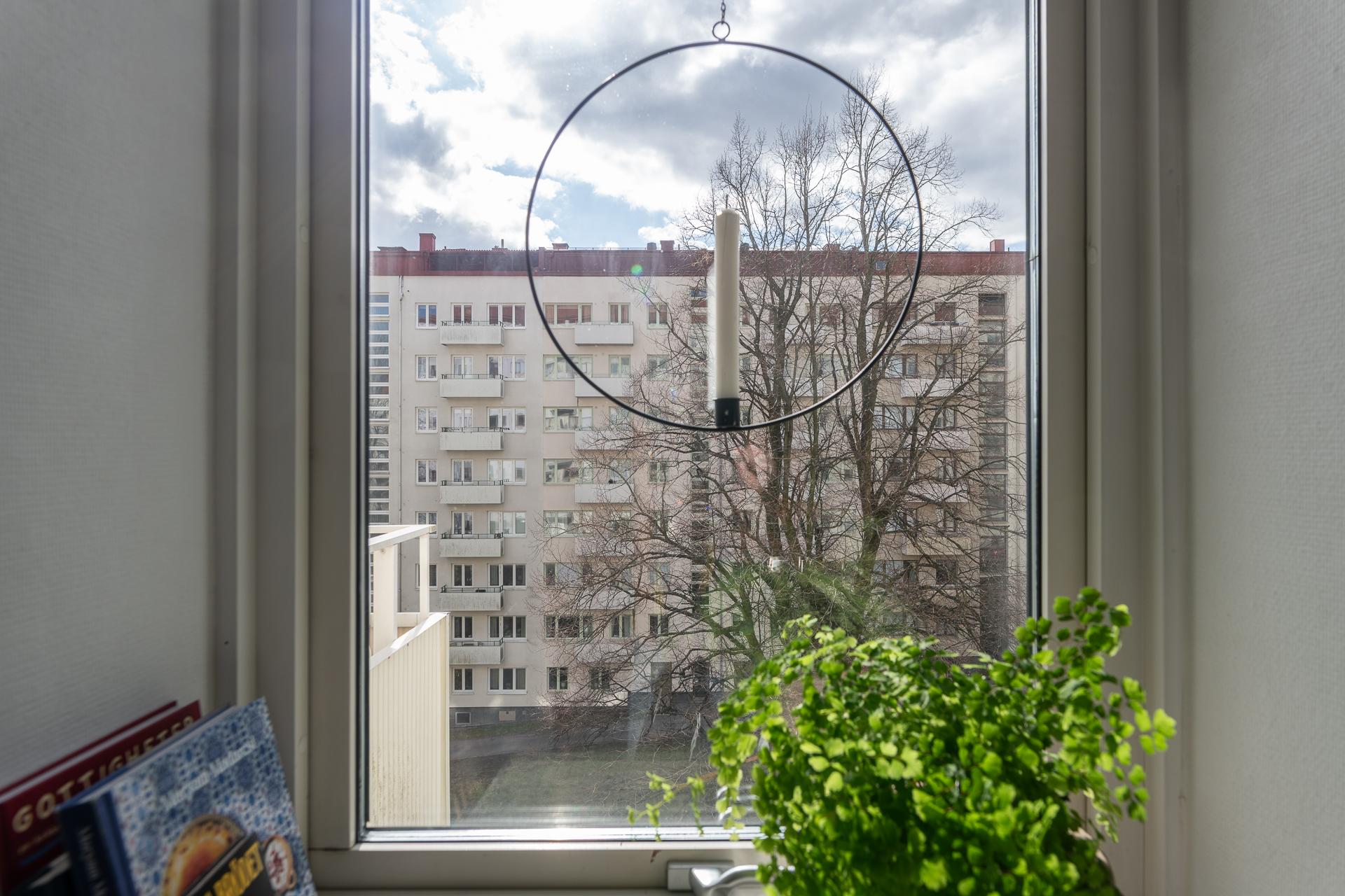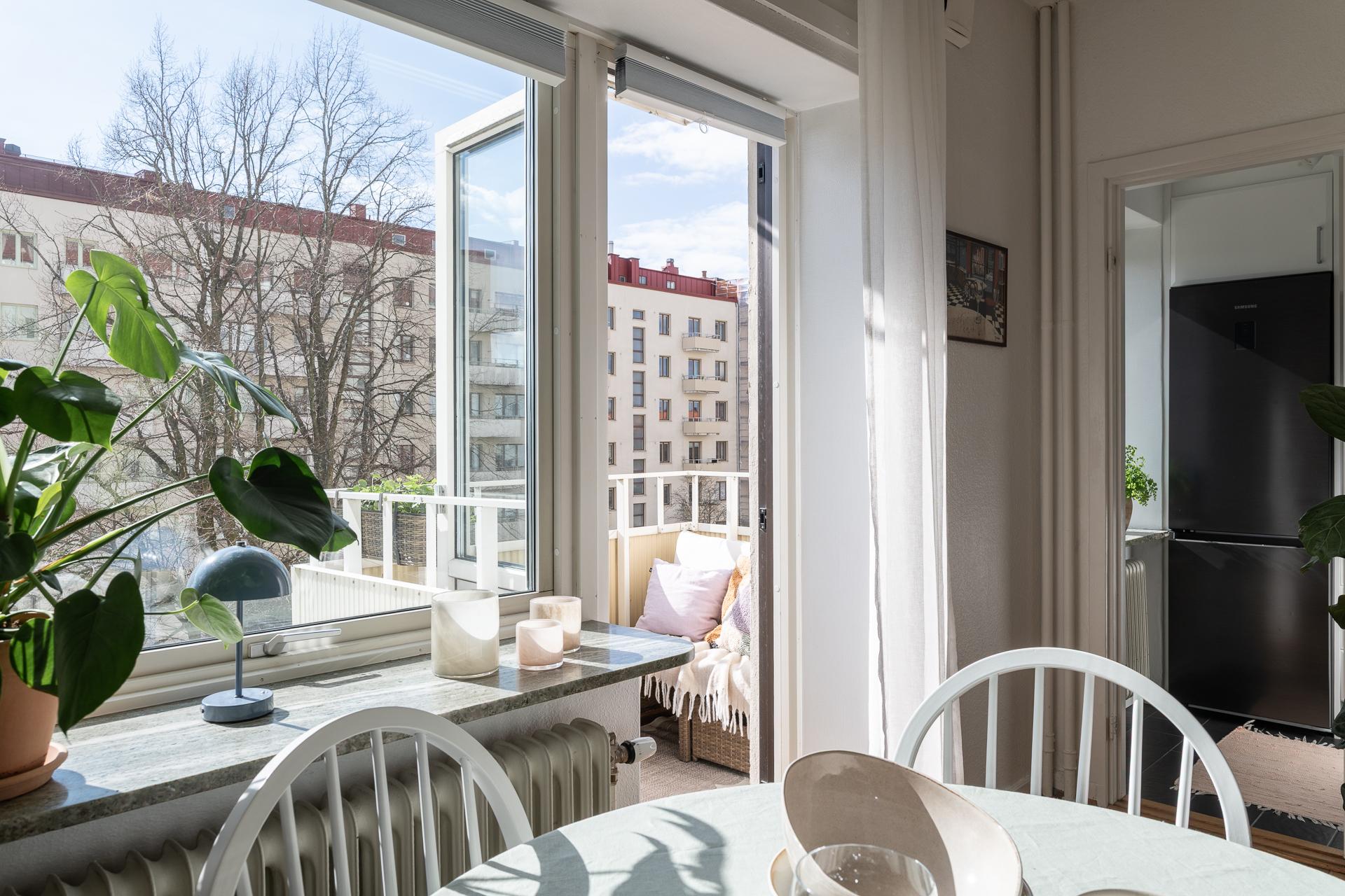 Direkt från hallen nås allrummet som är ljust och rymligt, härifrån når vi köket samt den härliga balkongen. Framför det stora fönstret som fyller rummet med ljus är en perfekt plats för matplats eller arbetshörna. På balkongen njuter man av solen från lunchtid till långt in på kvällen i ett högt och fritt läge med en underbar frihetskänsla och fantastisk utsikt. Sovalkoven går enkelt att skärma av med något tyg eller vikvägg för att skapa mer avskildhet. I rummet är väggarna vita och på golvet ligger en fiskbensparkett i original.
