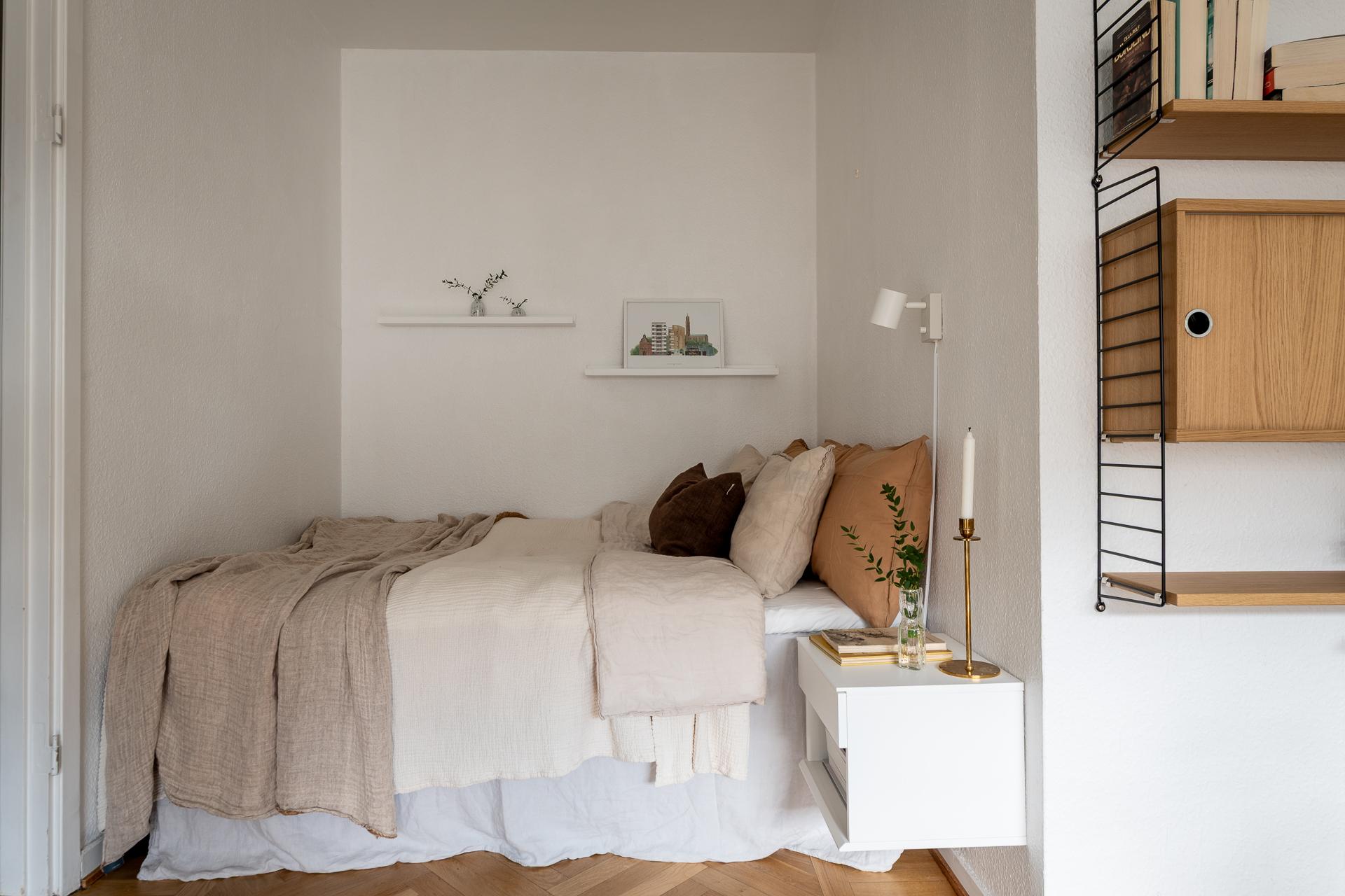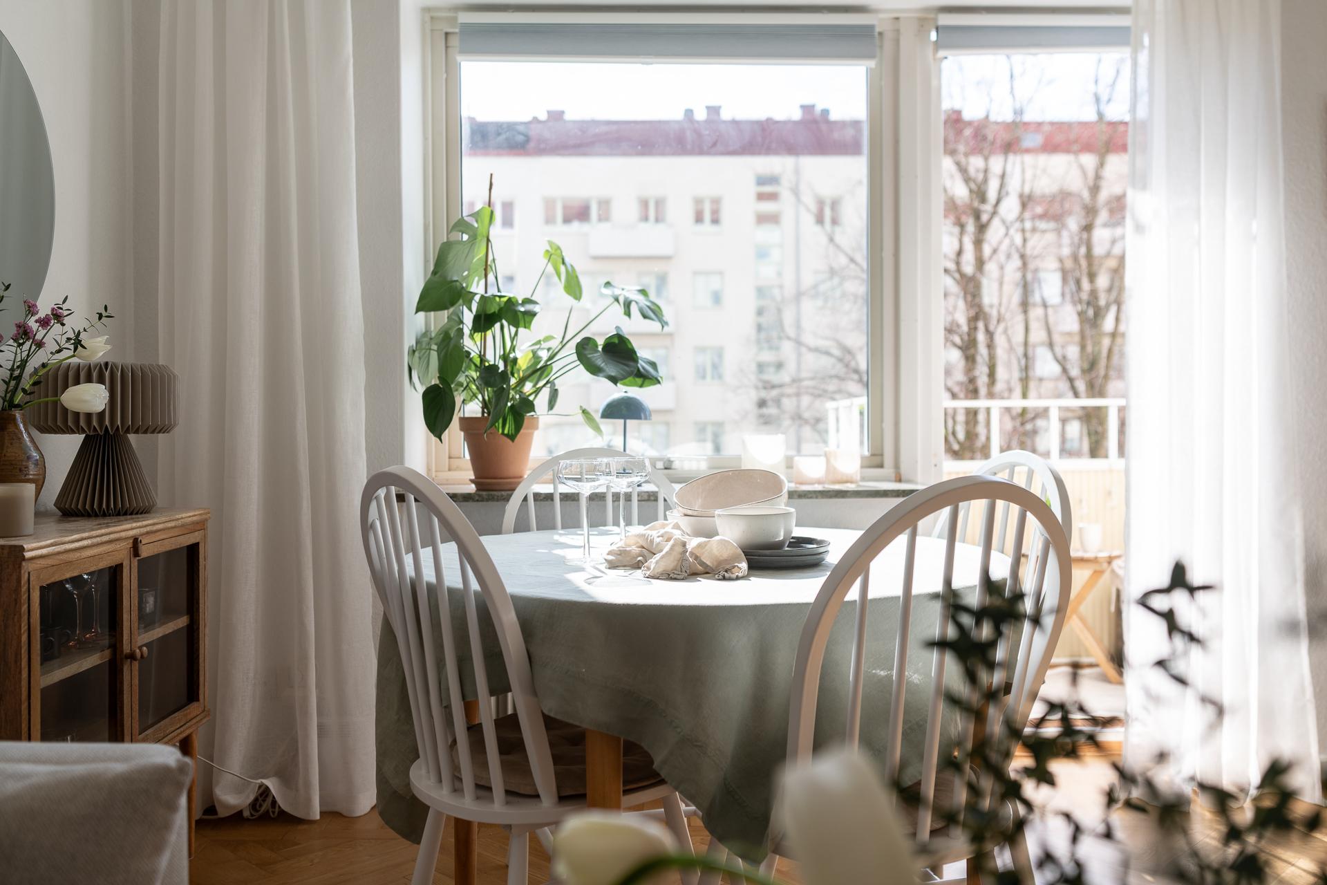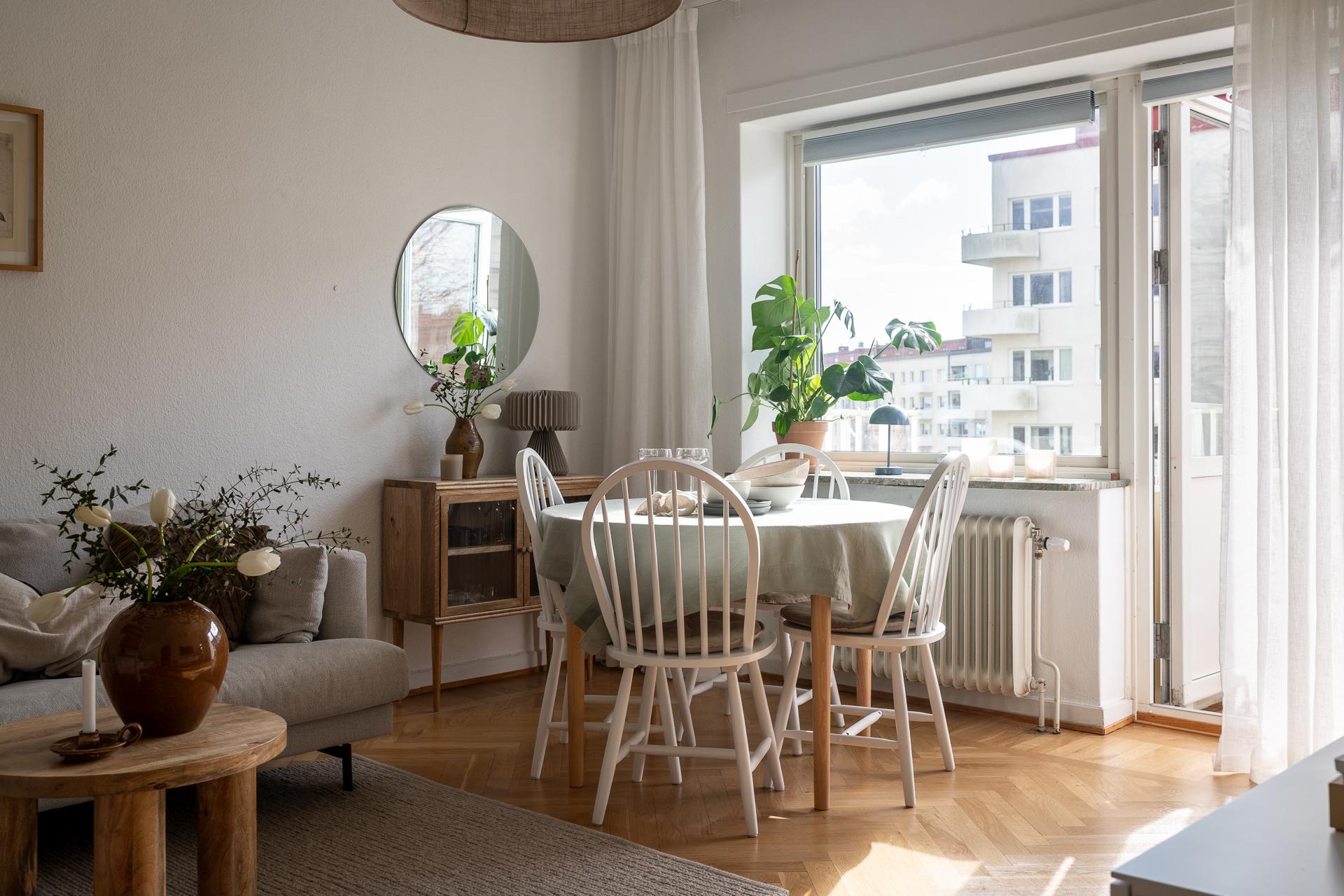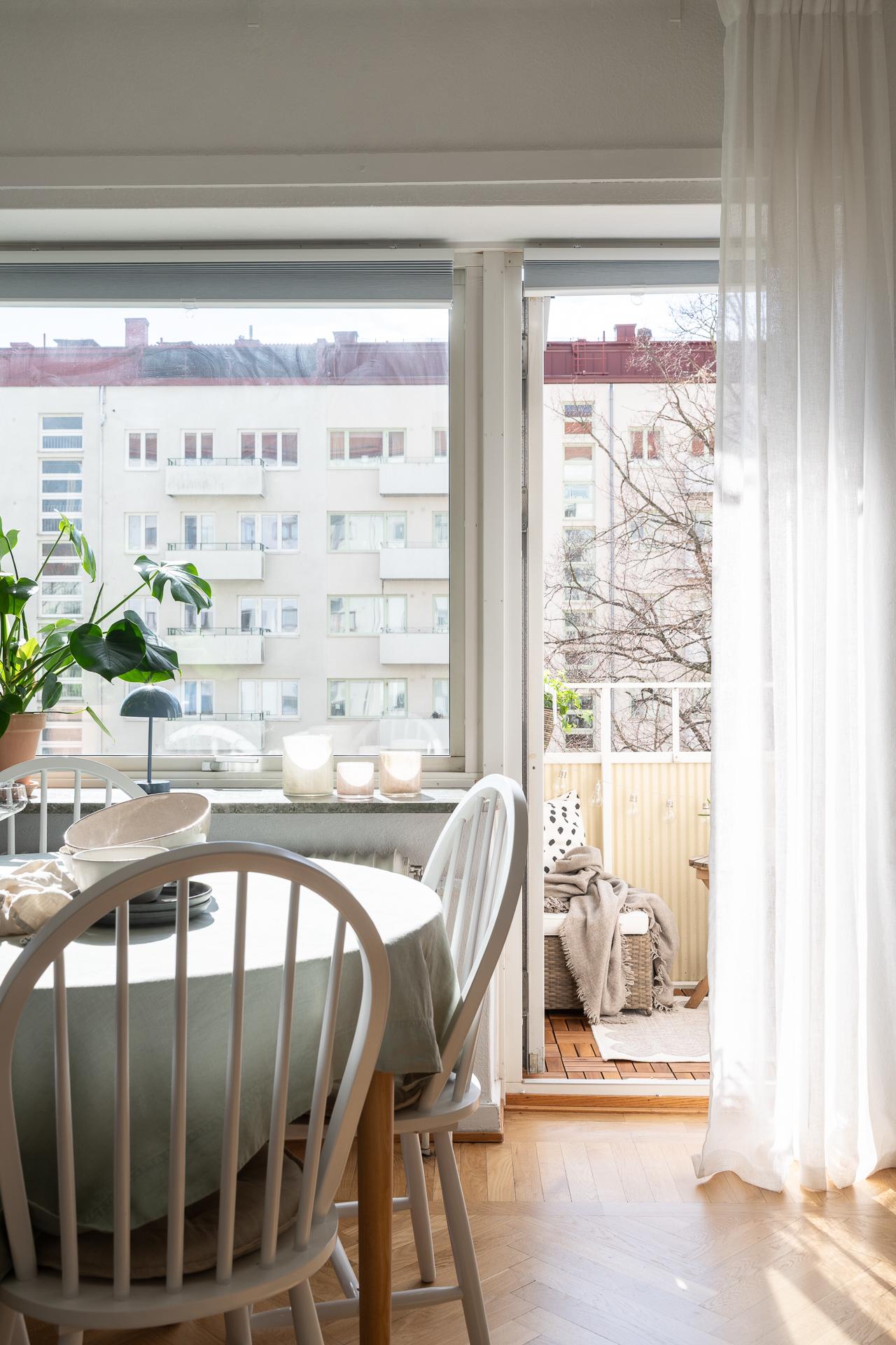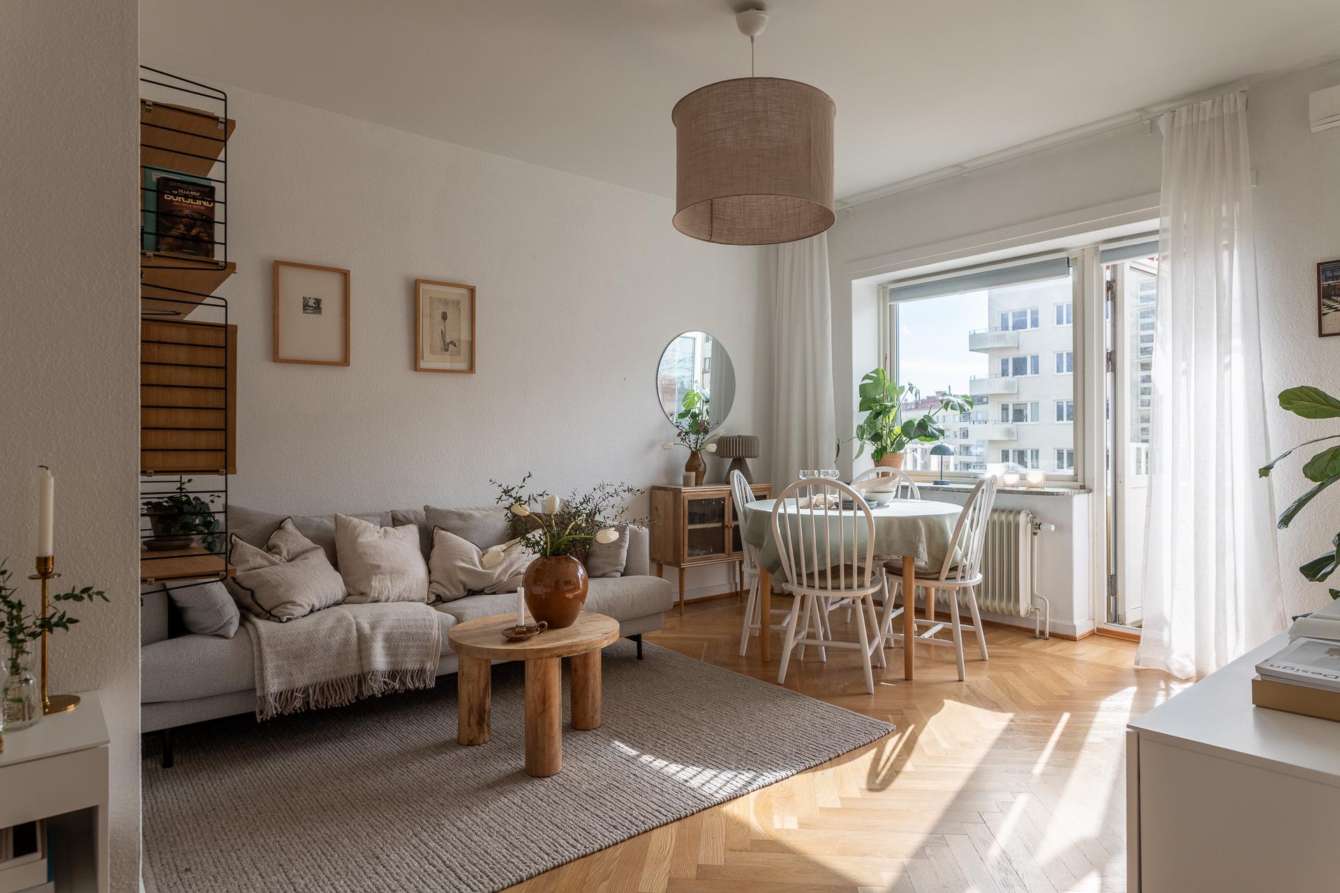 Direkt från hallen nås allrummet som är ljust och rymligt, härifrån når vi köket samt den härliga balkongen. Framför det stora fönstret som fyller rummet med ljus är en perfekt plats för matplats eller arbetshörna. På balkongen njuter man av solen från lunchtid till långt in på kvällen i ett högt och fritt läge med en underbar frihetskänsla och fantastisk utsikt. Sovalkoven går enkelt att skärma av med något tyg eller vikvägg för att skapa mer avskildhet. I rummet är väggarna vita och på golvet ligger en fiskbensparkett i original.