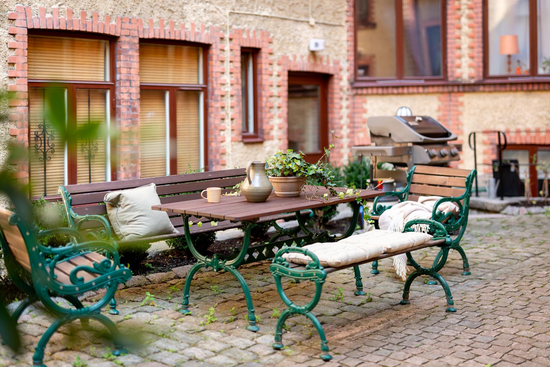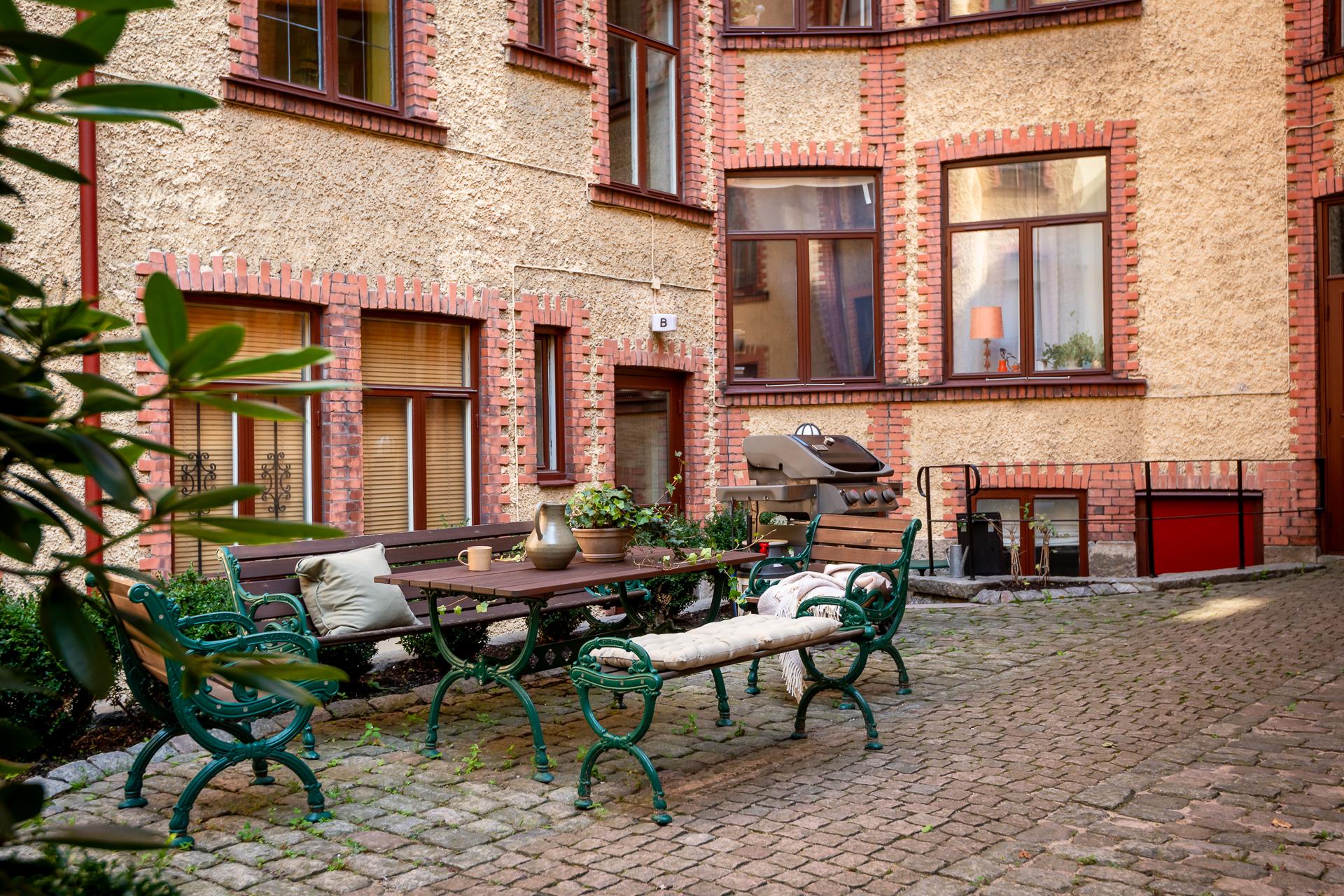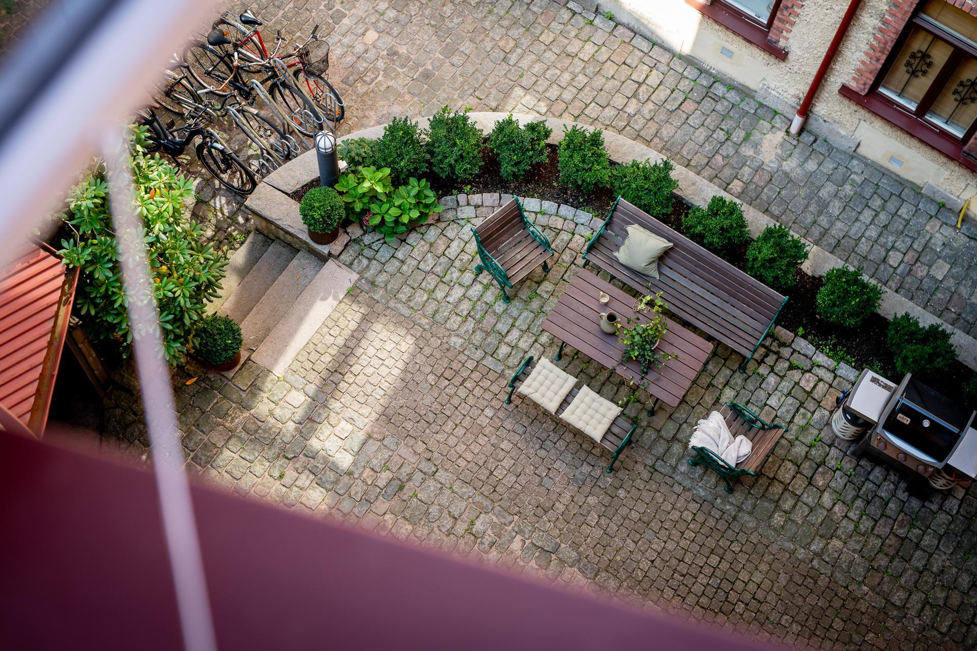 - Balkong/Uteplats: Nej. Fin gemensam innergård med både gasol- och kolgrill.