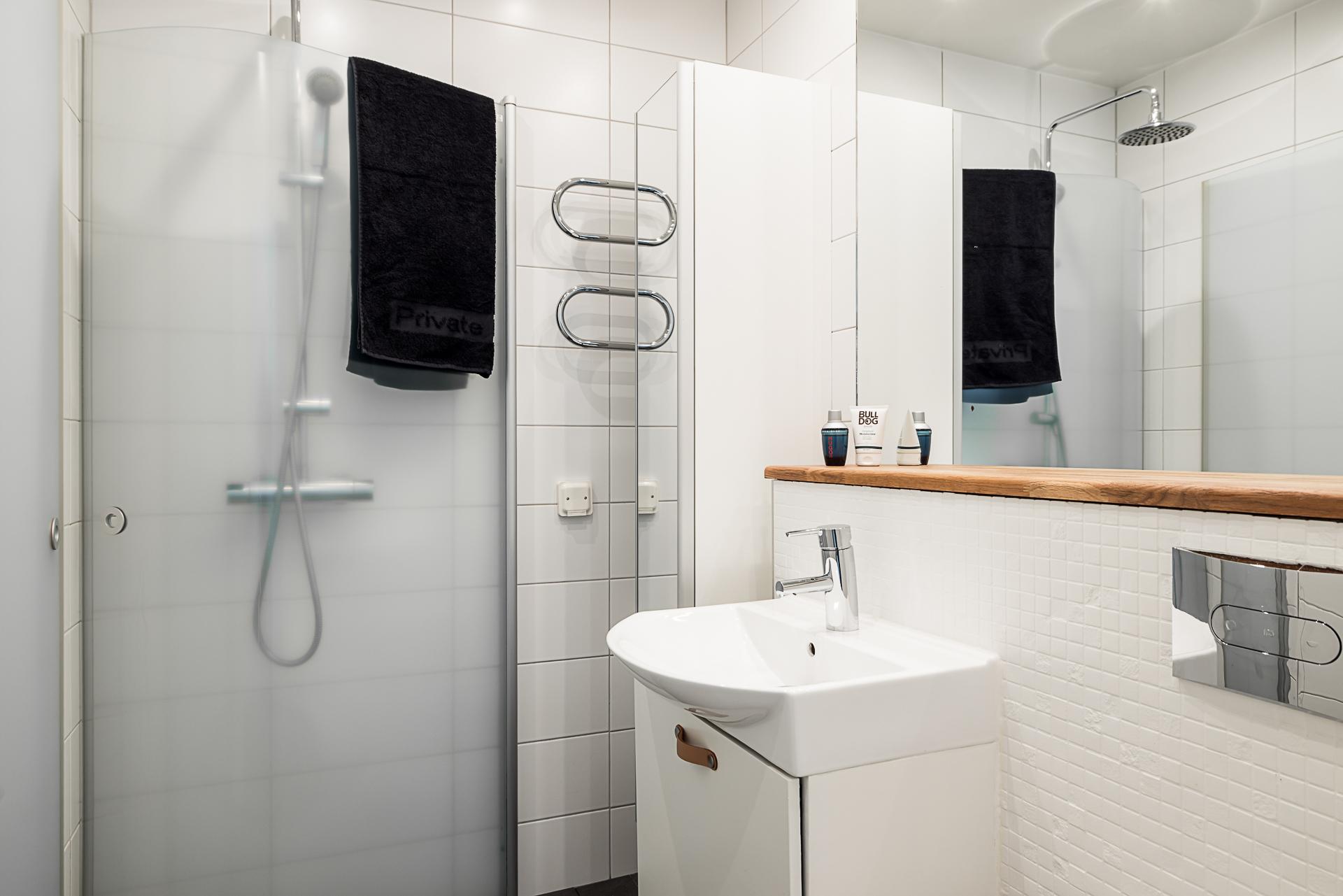 Helkaklat badrum med klassiska färg- och materialval. Grått klinker på golvet och vitt klinker pryder väggarna. Duschen gömmer sig bakom smäckra, vikbara glasväggar och toaletten är vägghängd. Precis som i sovrummet finns här ett ljudsystem installerat. El är förberett för den som vill installera tvättmaskin. Check på både golvvärme och handdukstork - mycket tacksamt med tanke på den långa vintern.