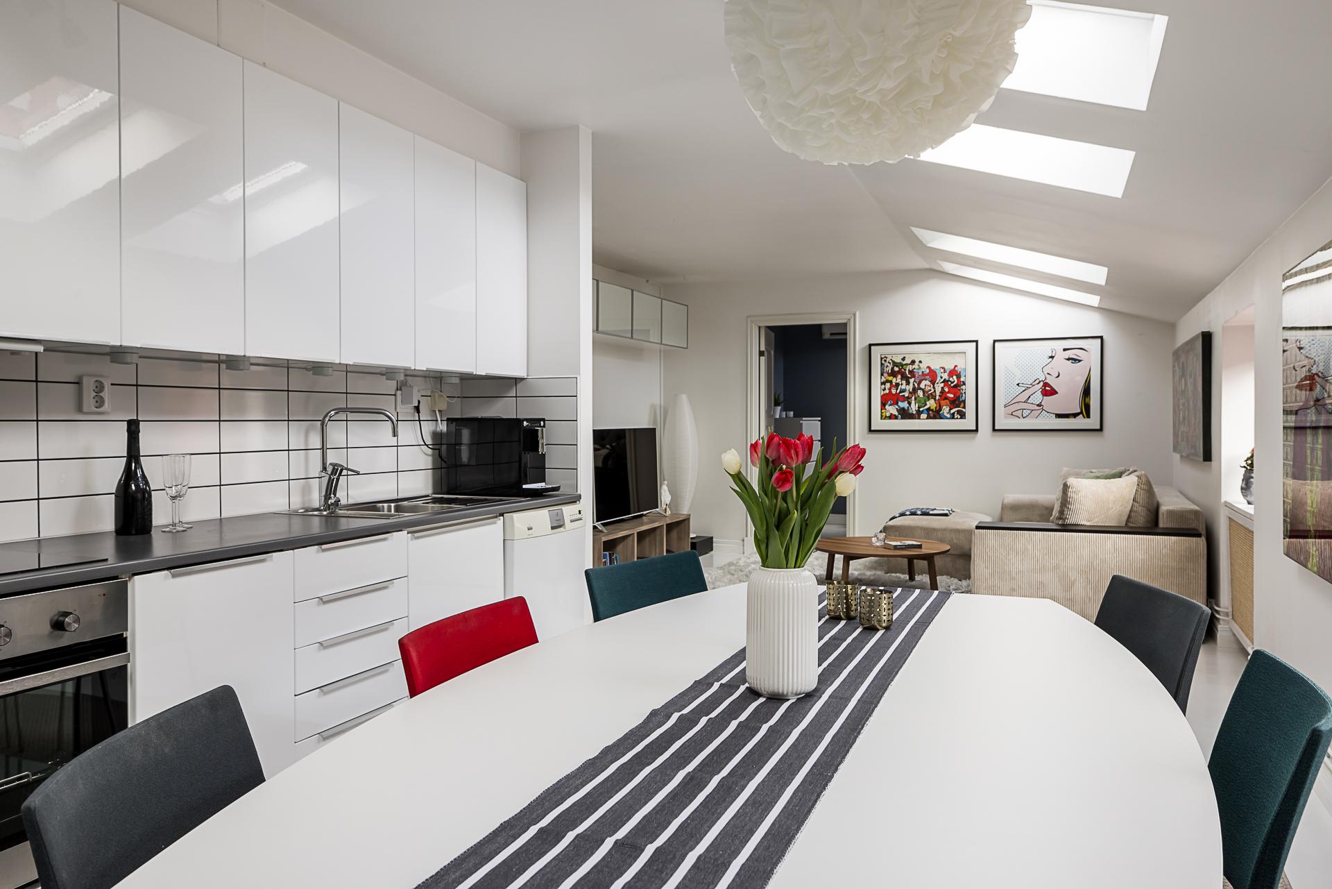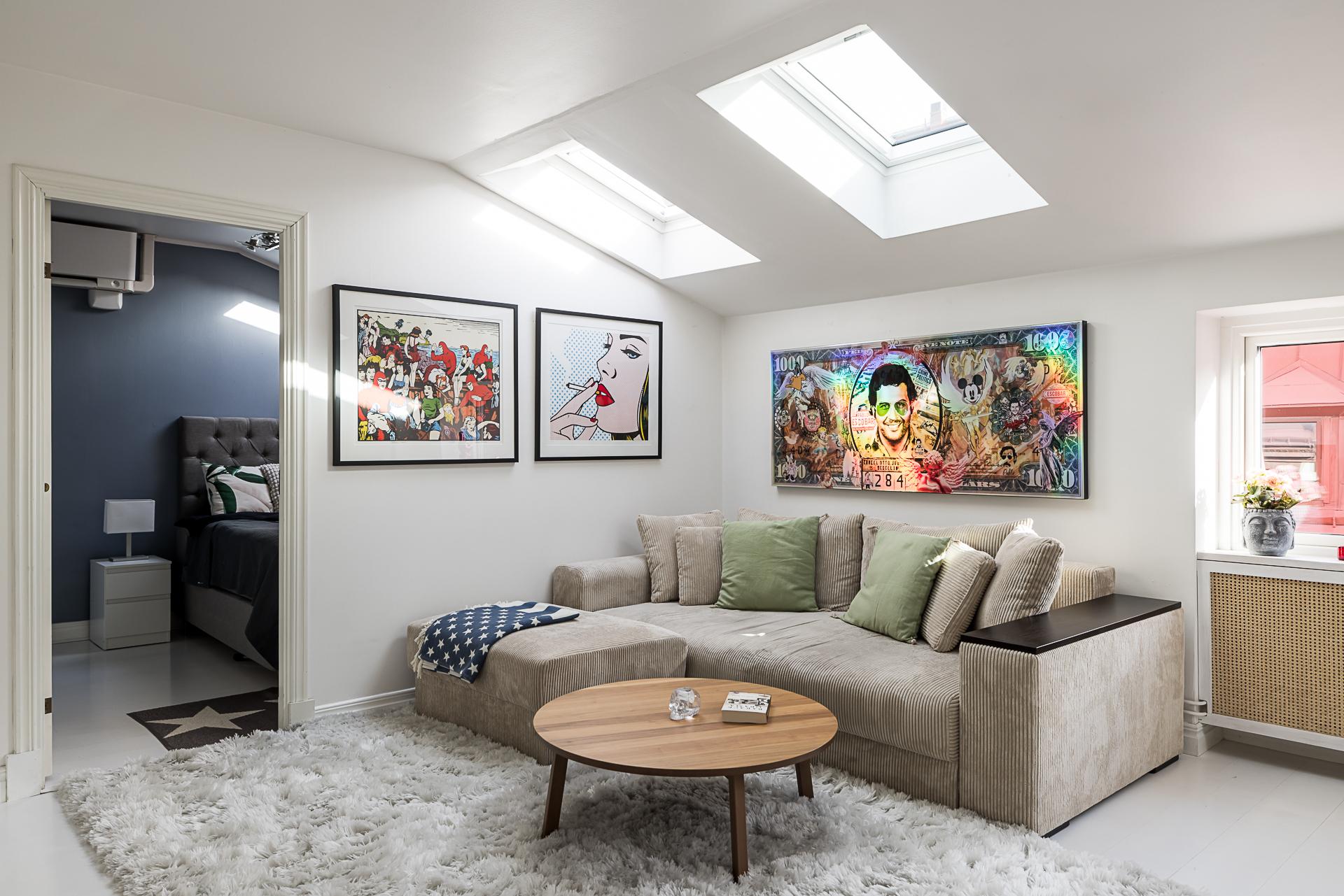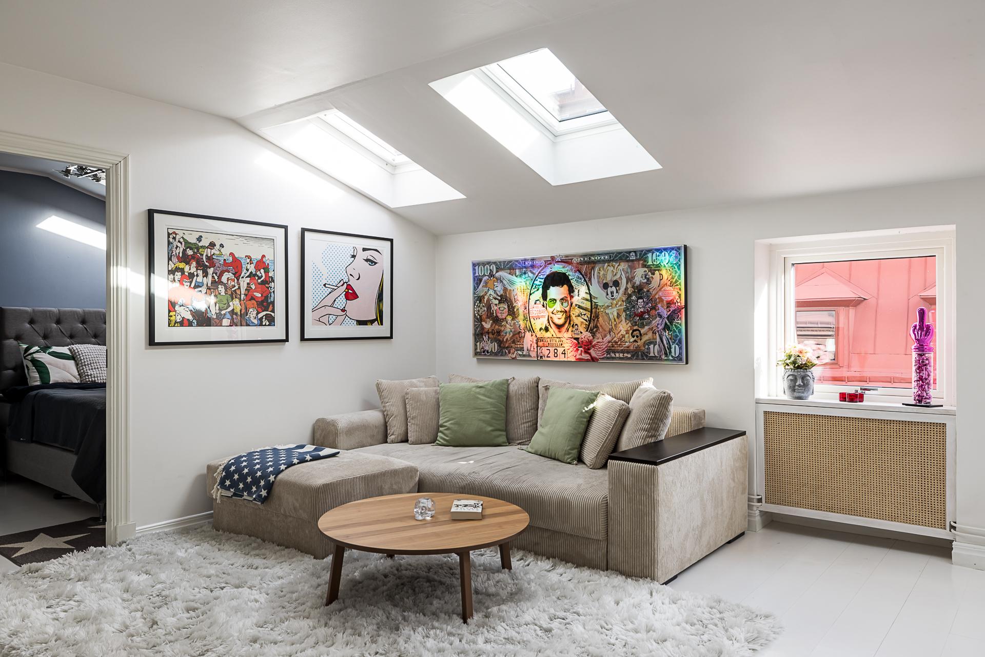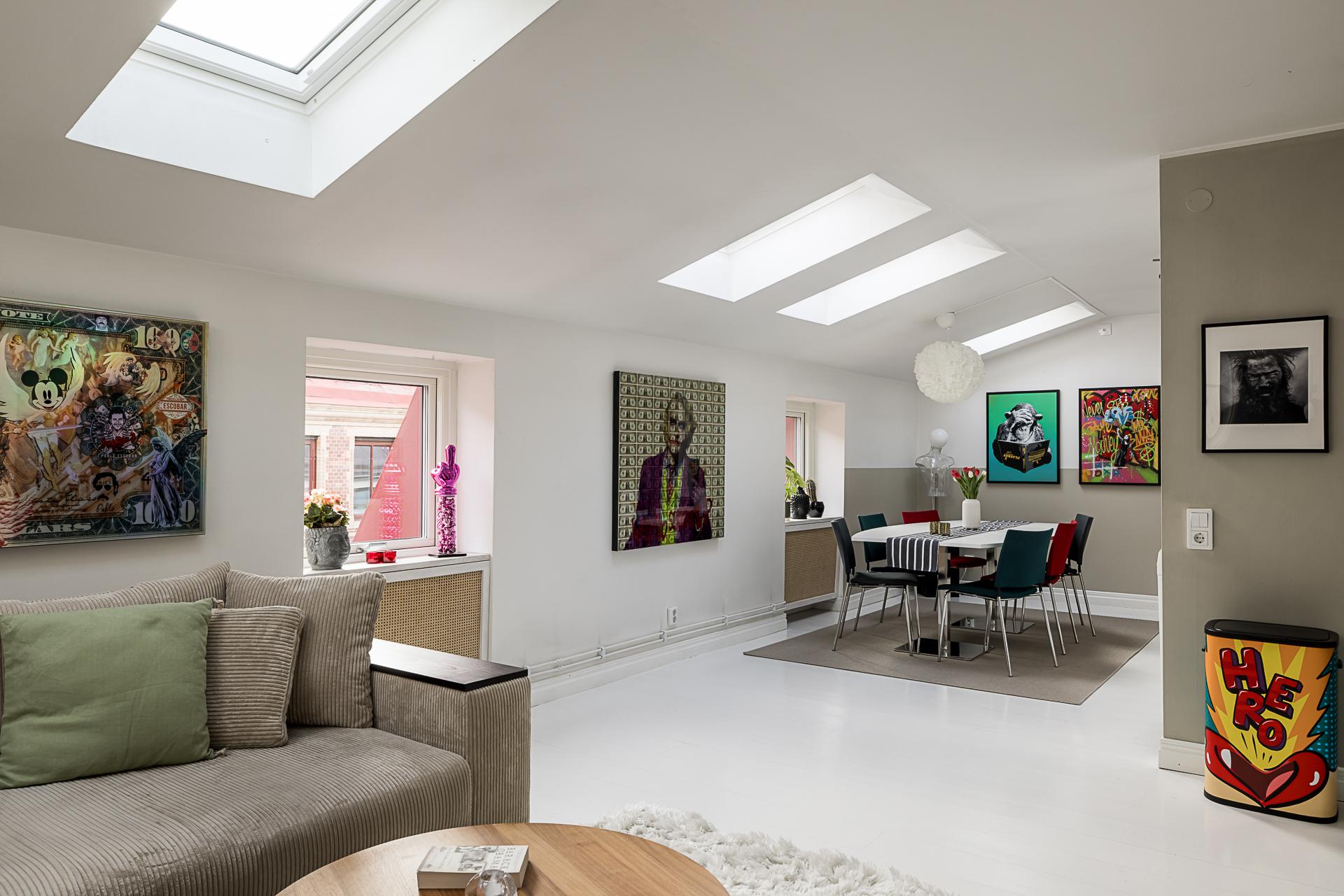 Rundvandringen fortsätter i vardagsrummet, som har en öppen planlösning mot köket vilket ger er närmare 30 kvadrat stort och häftigt rum. Det är något alldeles extra att bo högst upp i huset. Inga knarrande fotsteg ovanför, bara Göteborgs alltid föränderliga himmel som ni ständigt har kontakt med tack vare alla takfönster. I detta rum finns hela sju fönster totalt, det är wow-känsla på det. I vardagsrumsdelen har ni en naturlig plats för soffgruppen, tv-hörnan och även övrig möblering.
