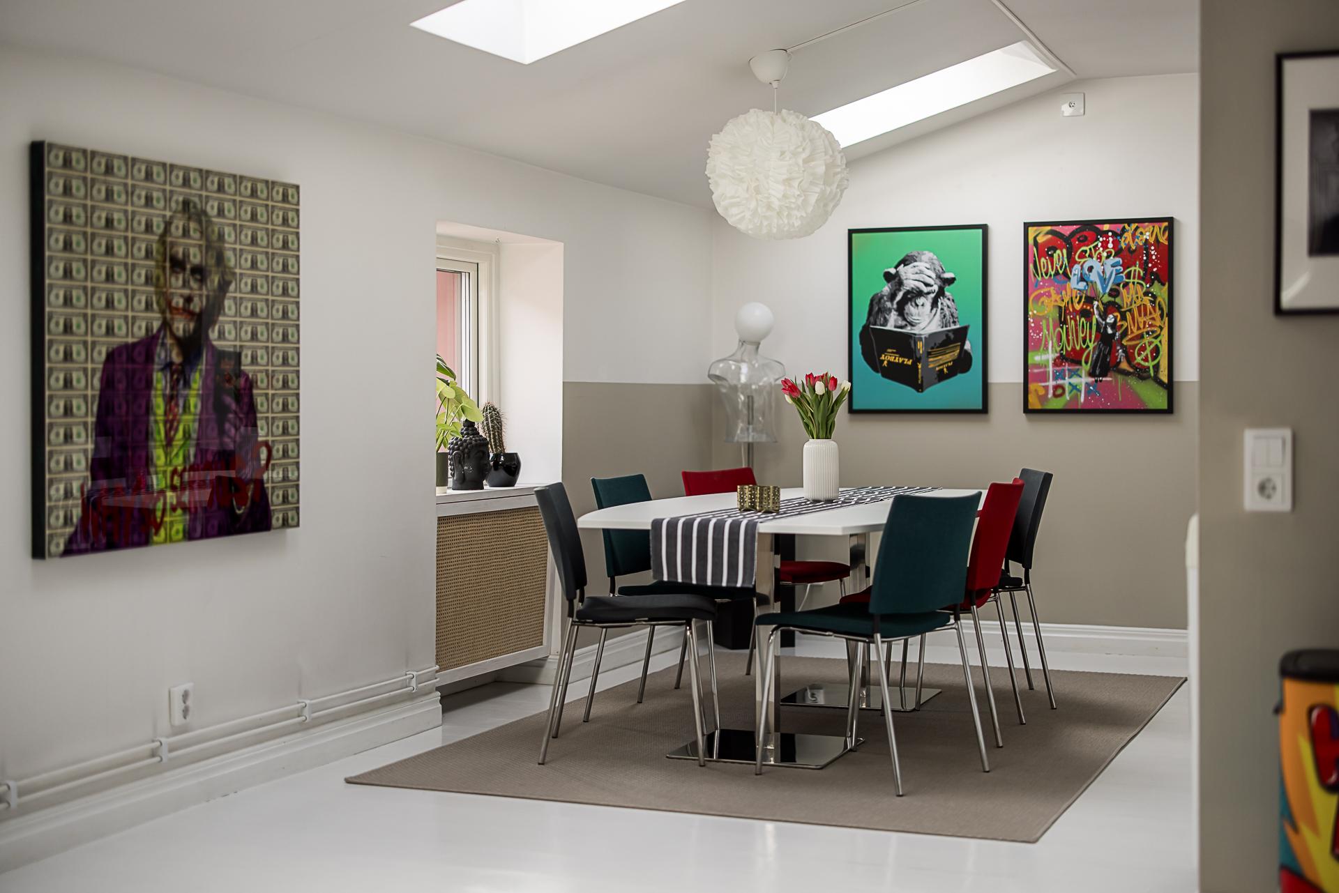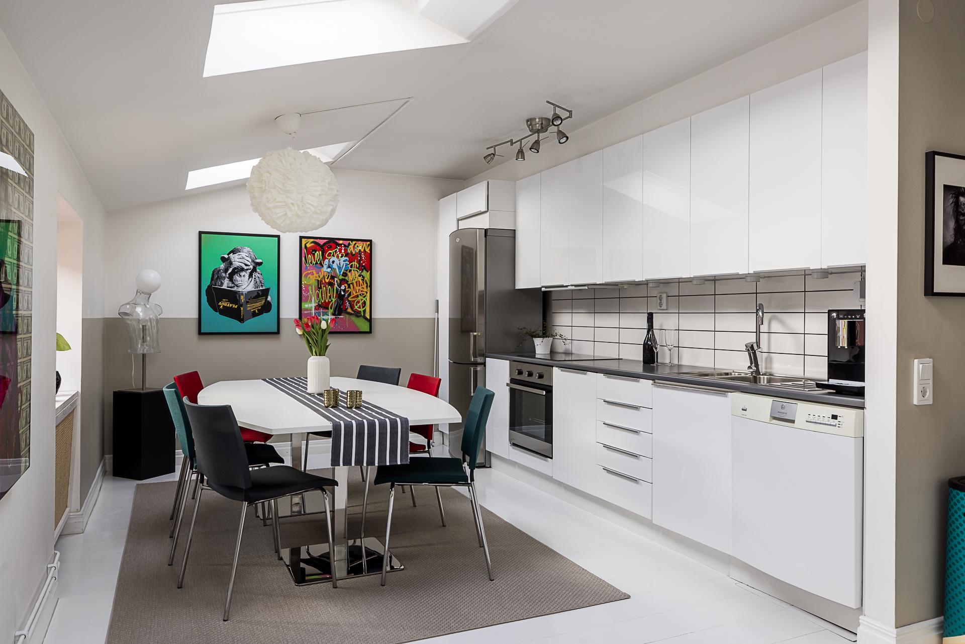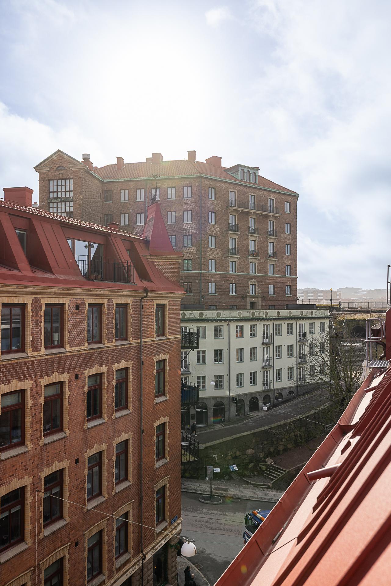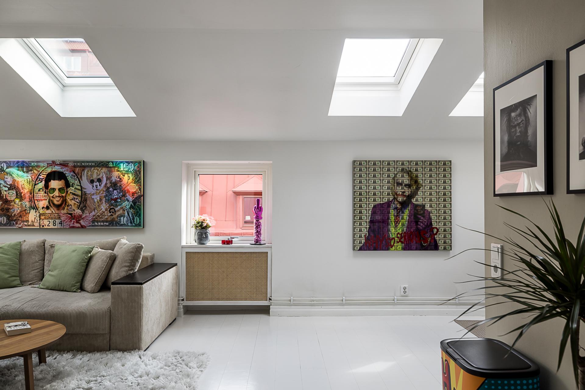 Rundvandringen fortsätter i vardagsrummet, som har en öppen planlösning mot köket vilket ger er närmare 30 kvadrat stort och häftigt rum. Det är något alldeles extra att bo högst upp i huset. Inga knarrande fotsteg ovanför, bara Göteborgs alltid föränderliga himmel som ni ständigt har kontakt med tack vare alla takfönster. I detta rum finns hela sju fönster totalt, det är wow-känsla på det. I vardagsrumsdelen har ni en naturlig plats för soffgruppen, tv-hörnan och även övrig möblering.