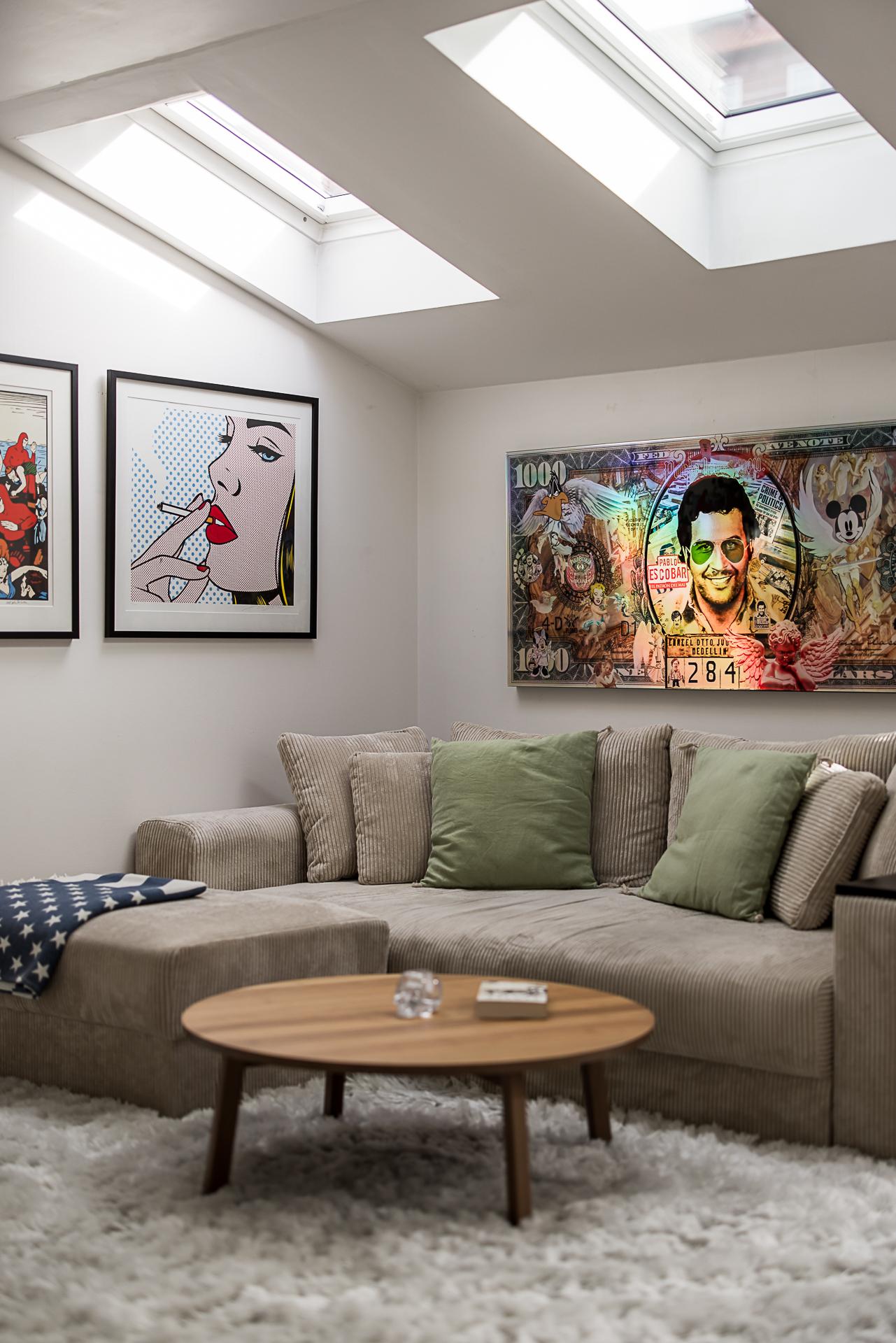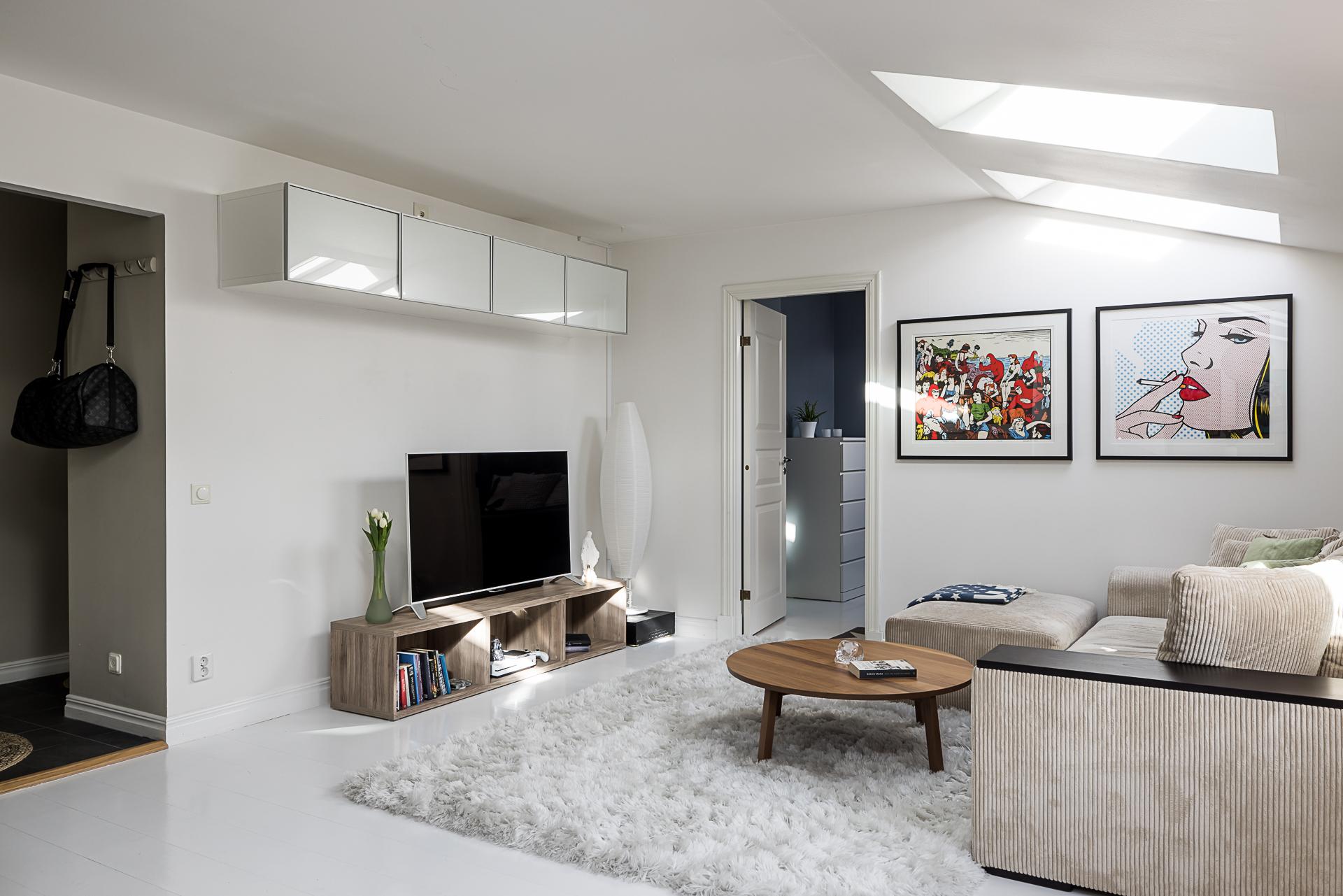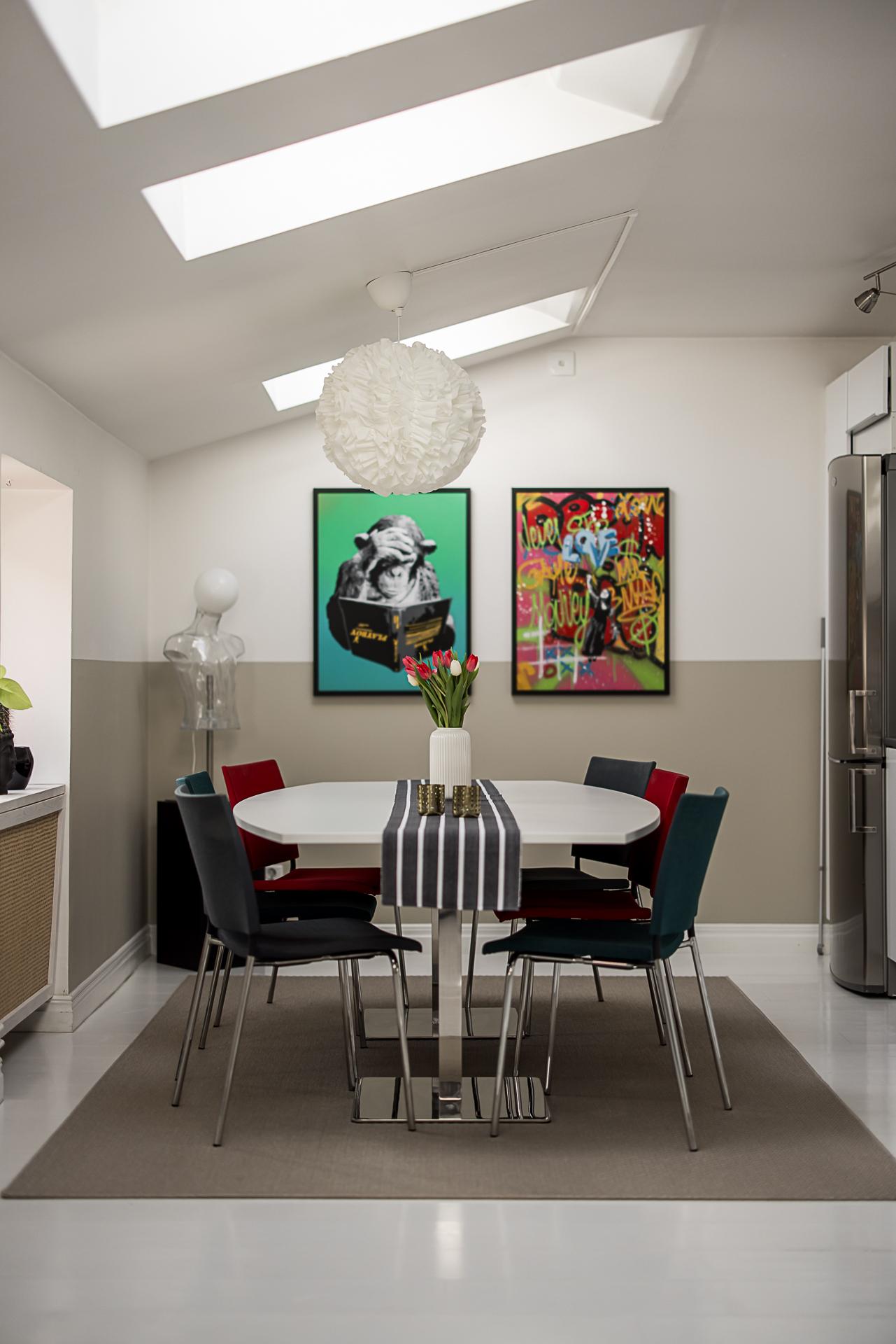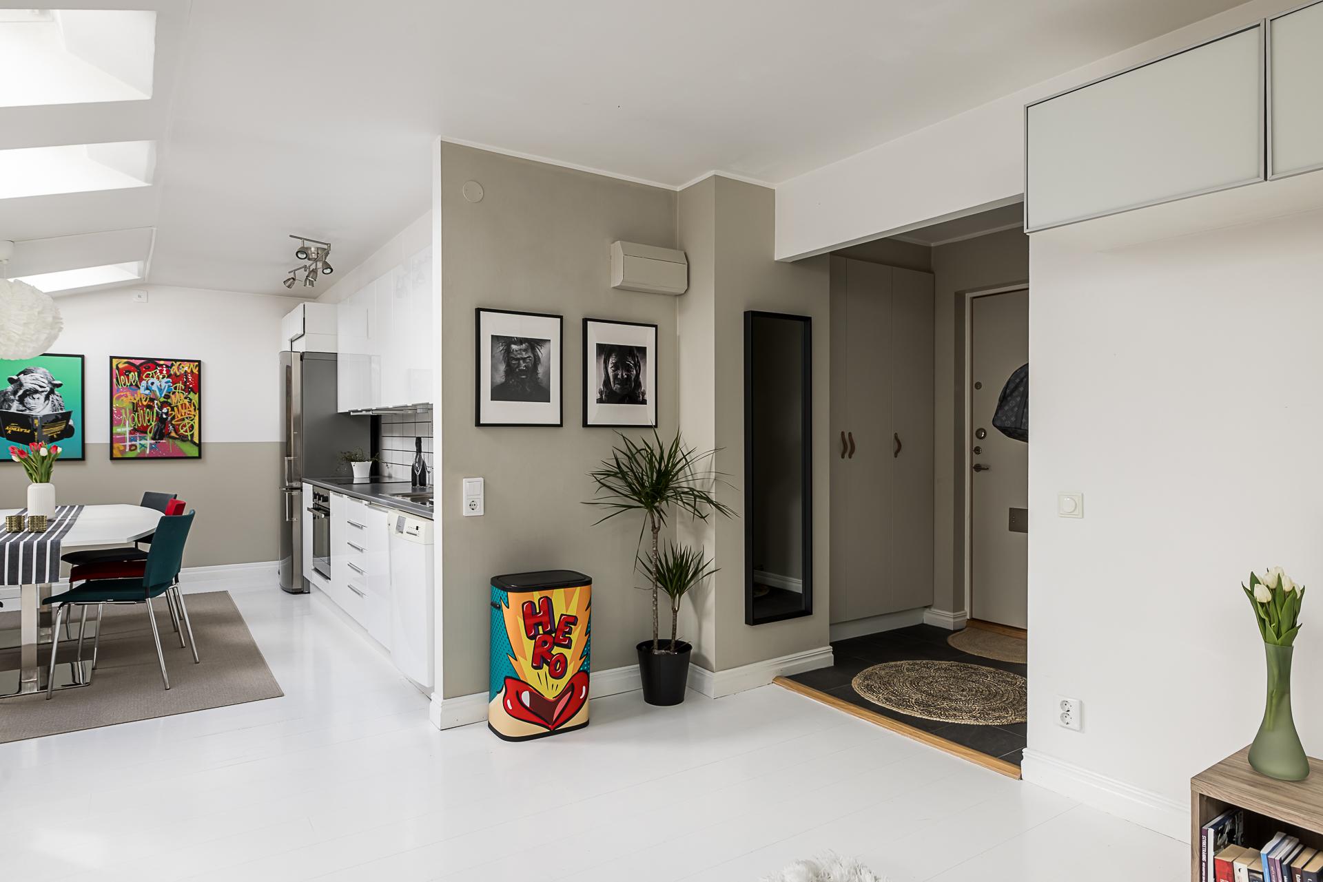 Rundvandringen fortsätter i vardagsrummet, som har en öppen planlösning mot köket vilket ger er närmare 30 kvadrat stort och häftigt rum. Det är något alldeles extra att bo högst upp i huset. Inga knarrande fotsteg ovanför, bara Göteborgs alltid föränderliga himmel som ni ständigt har kontakt med tack vare alla takfönster. I detta rum finns hela sju fönster totalt, det är wow-känsla på det. I vardagsrumsdelen har ni en naturlig plats för soffgruppen, tv-hörnan och även övrig möblering.