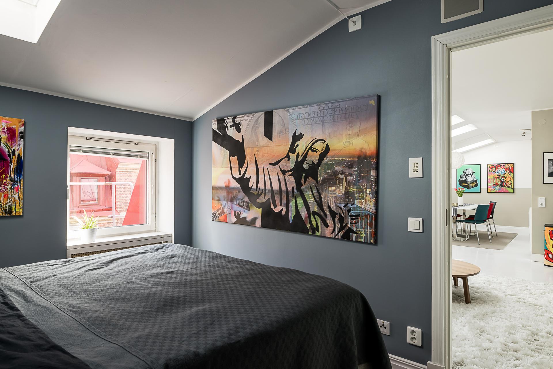 Bakom vardagsrummet ligger det ombonade och mysiga sovrummet. Målad i en behaglig blå nyans ger detta rum vila för både själ och kropp. Precis som hela lägenheten ligger det mot den lugna Ingenjörsgatan, så här kan man sova med öppet fönster. Plats finns för dubbelsäng och nattduksbord, och idag finns tre garderober som skapar fin förvaring för kläder. Här finns ett inbyggd ljudsystem och en A/C som ger behaglig svalka under de varmare sommardagarna.