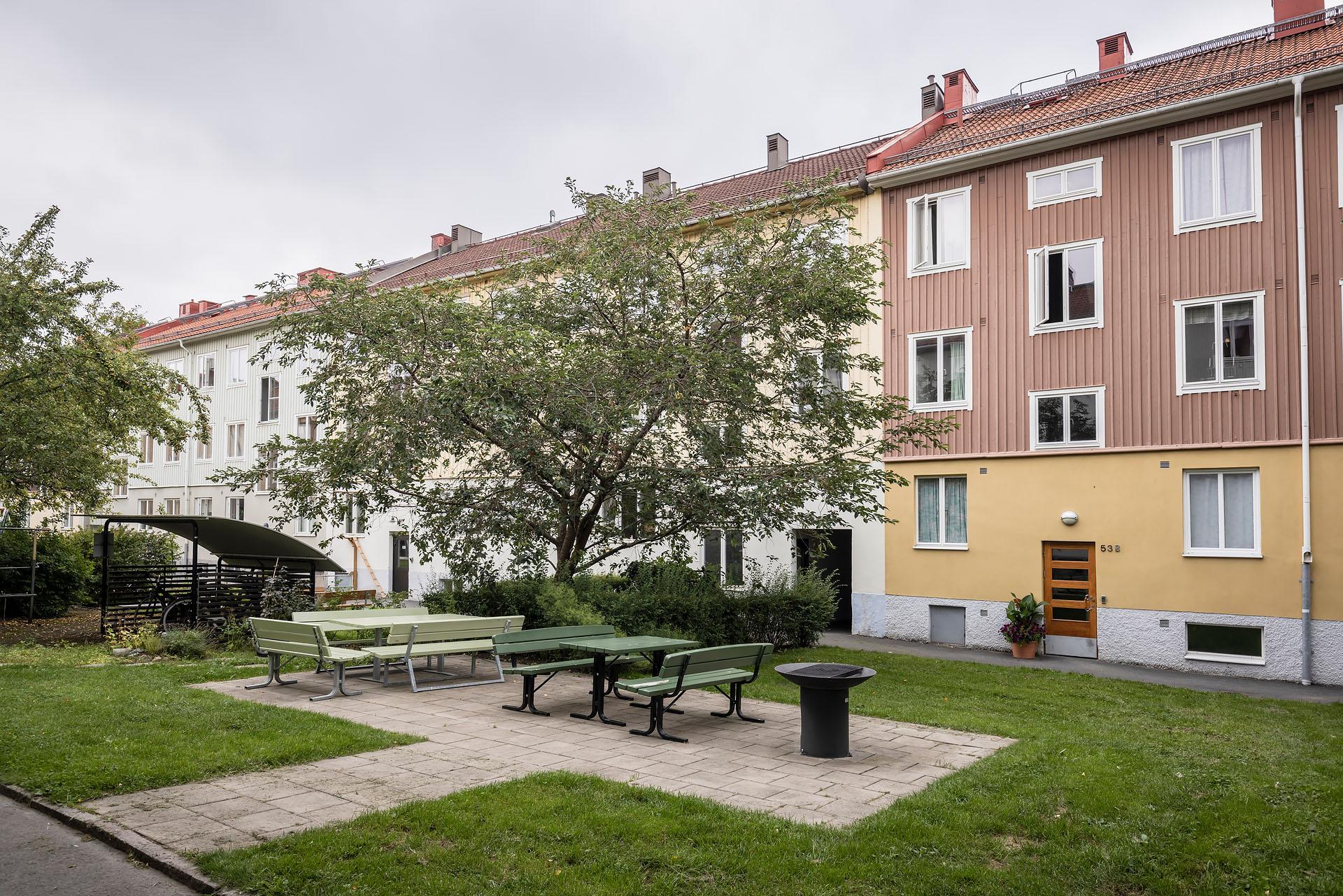 - Balkong/Uteplats: Nej. Gemensam trädgård med sittplats och grönytor.