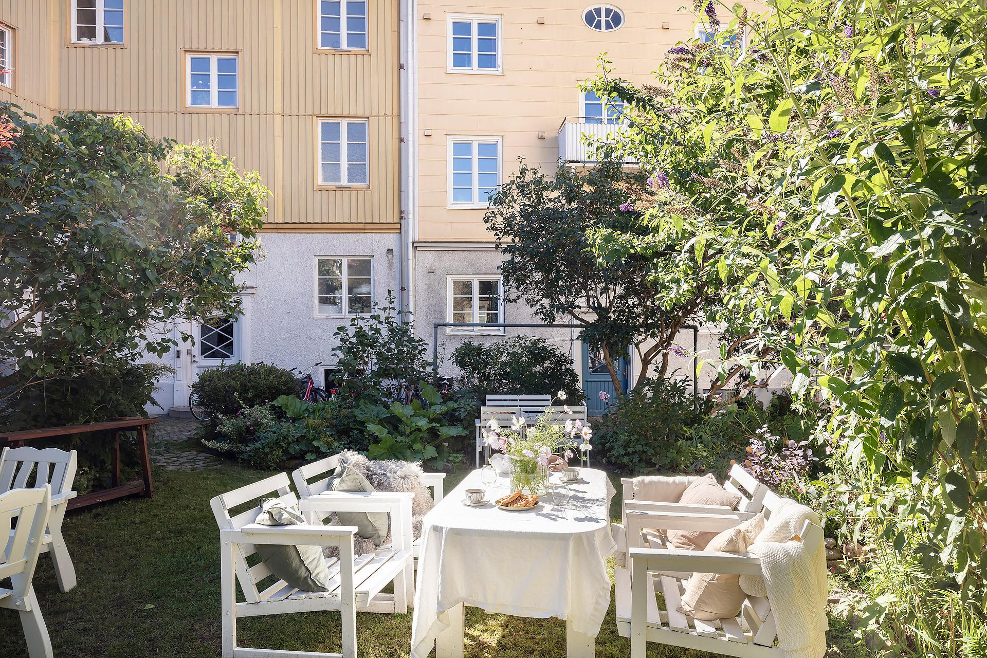 - Balkong/Uteplats: Nej. Underbar innergård sittplatser och vackra planteringar. Förträdgård mot Jörgensgatan.