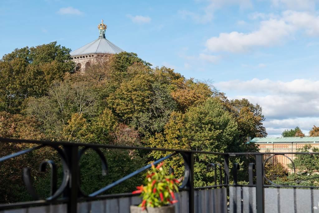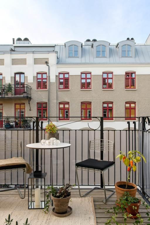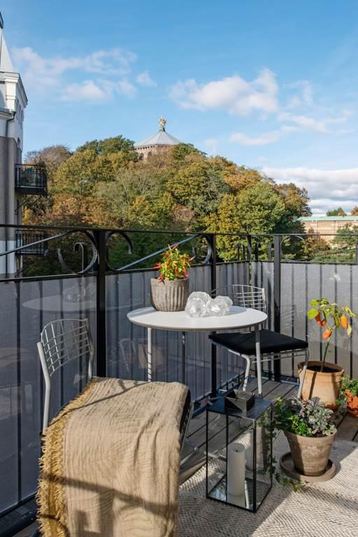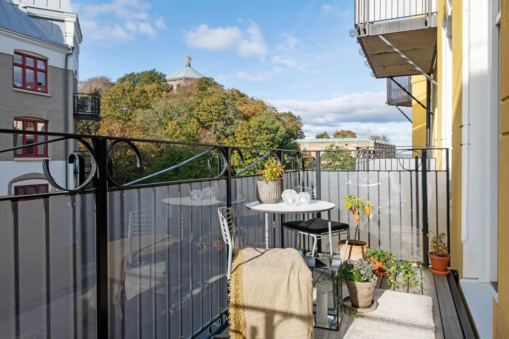 Den stora balkongen som är placerad i mitten av det stora fönsterpartiet är byggd 2013 med vackert räcke i svart smidesjärn och golv av trä. Denna blir onekligen ett extra rum under den ljusa delen av året. De glasade dörrarna suddar effektivt ut gränsen mellan inne och ute och det optimala västerläget gör att solen letar sig in från lunch till sen eftermiddag/kväll. Om sommaren står balkongdörrarna alltid öppna och blir därmed en förlängning av vardagsrummet. Njut av en kaffe, en bra bok och känslan av att bo mitt i vimlet men ändå högt och fritt.