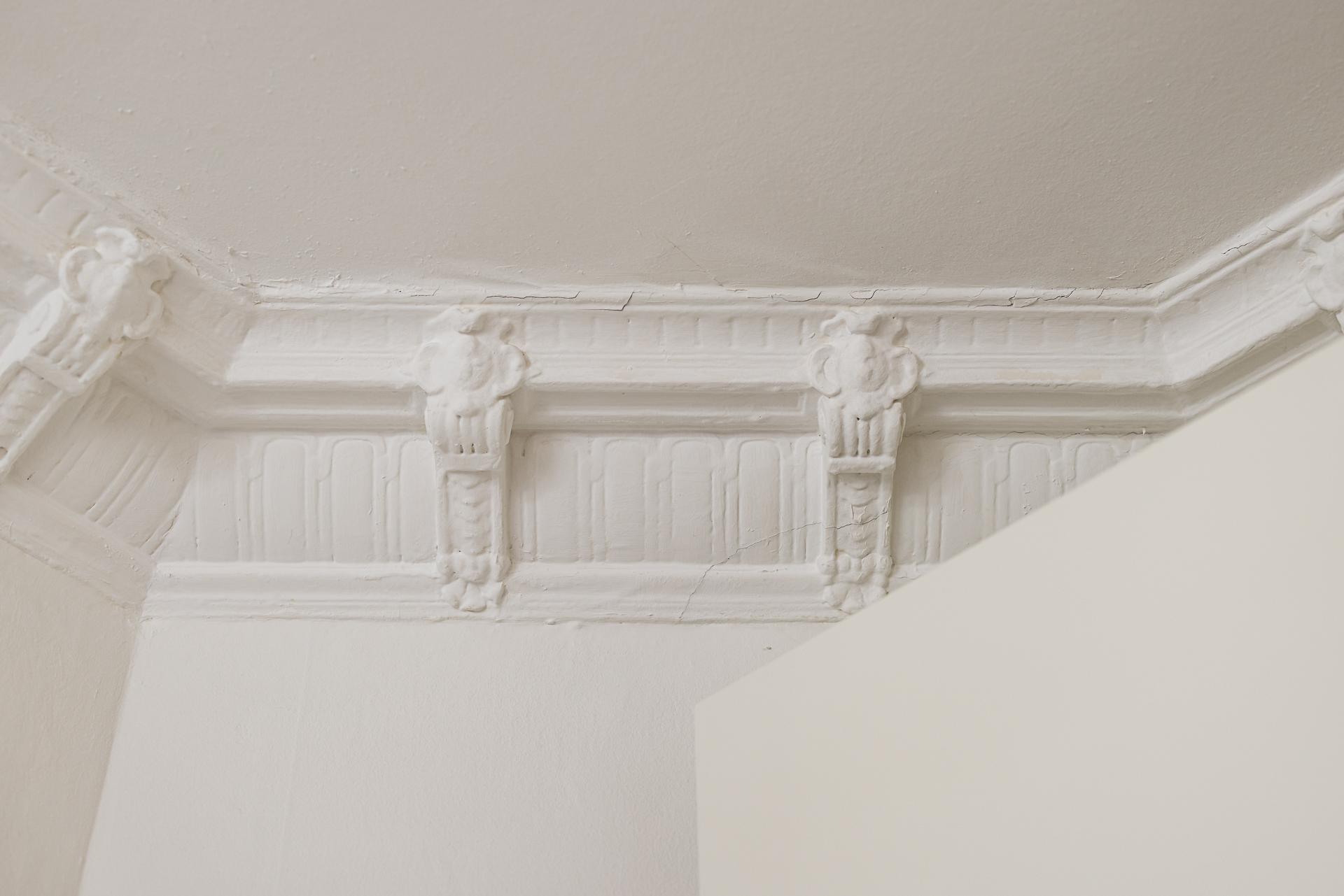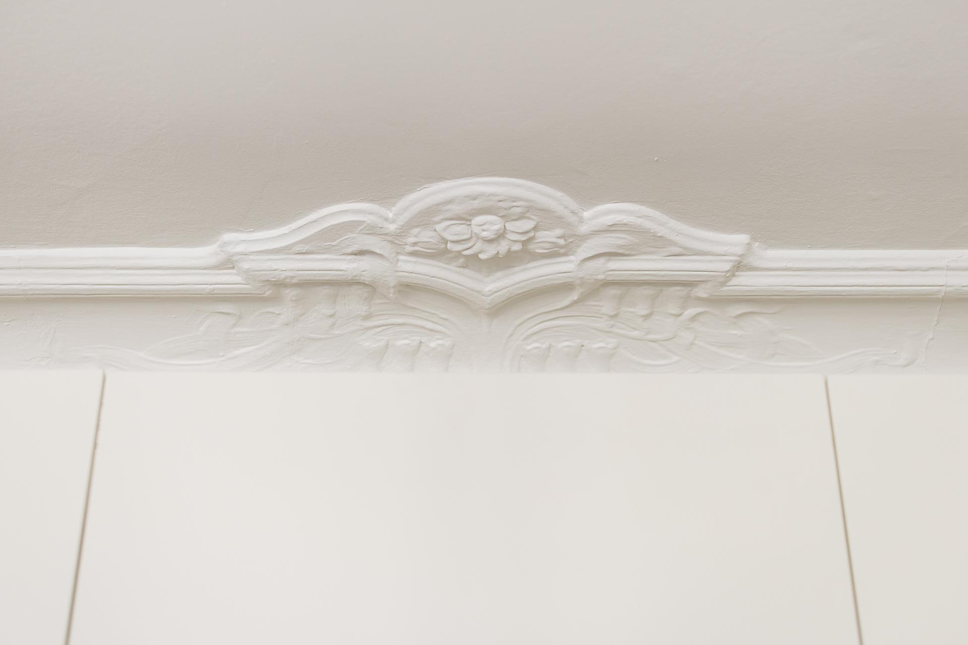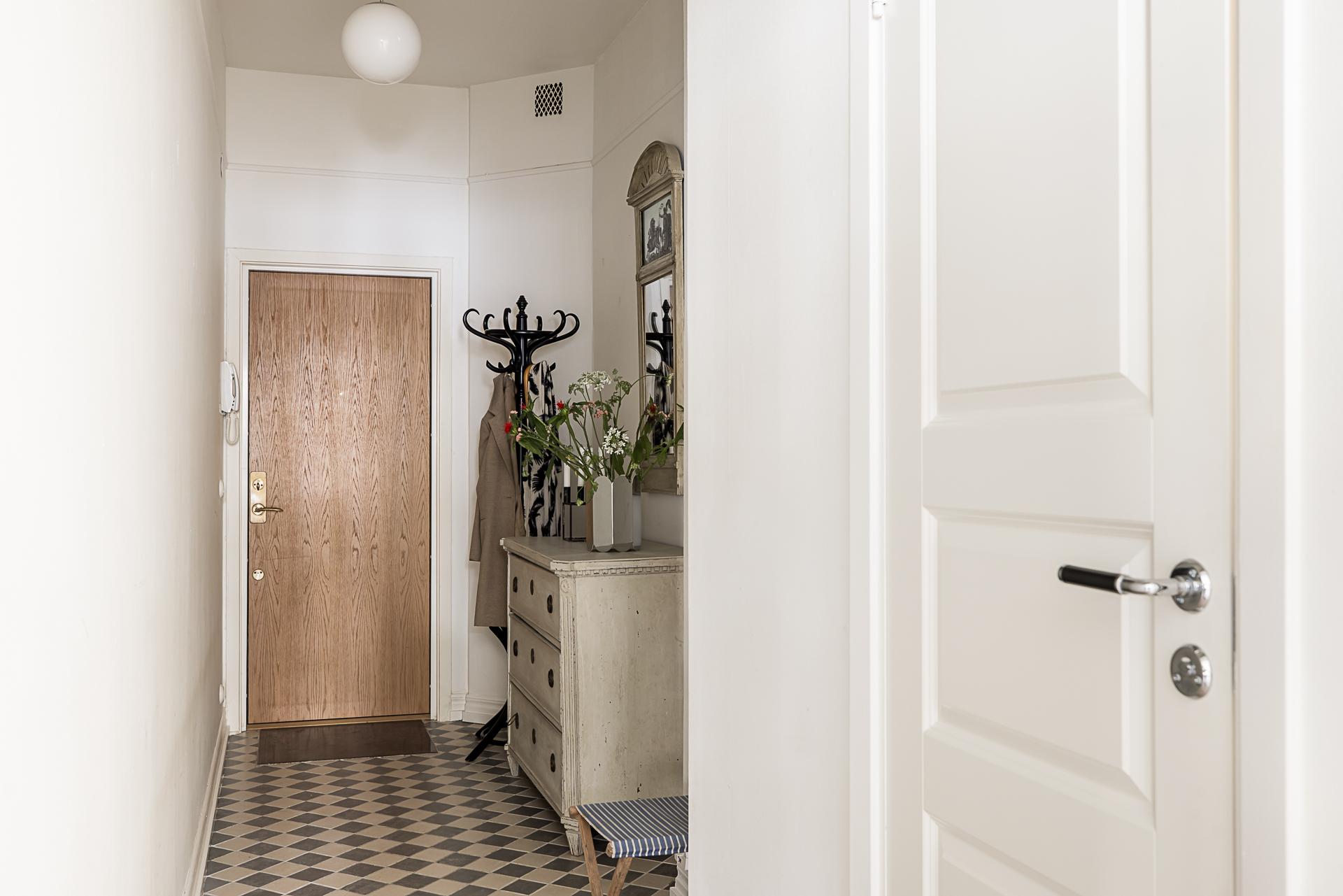 Efter att ha stigit in genom porten och beskådat det renoverade trapphuset med väggmålningar som visar hur kvarteret såg ut för drygt 115 år sedan, passerar man föreningens postfack och kan sedan skymta dörren som leder ut på innergården. Hissen tar dig bekvämt upp till våning fyra och bakom en gedigen säkerhetsdörr i ek med en namnskylt i mässing välkomnar lägenhetens hall. Goda förvaringsmöjligheter finns till vänster. Väggarna är målade i en bruten vit nyans och golvet pryds av ett vackert stengolv i original som övergår i ett slipat och vitlutat brädgolv. Själva entrédelen övergår sedan till en inre hall som löpare vidare in i köket och vardagsrummet.